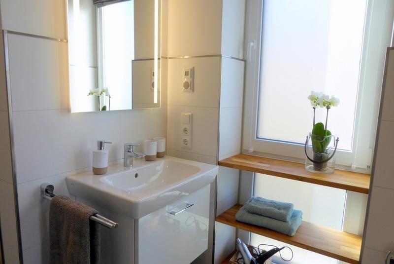Bad und Sanitär: bodentiefe barrierefreie Dusche, Waschtischanlage, integriertes Radio, WC, Föhn