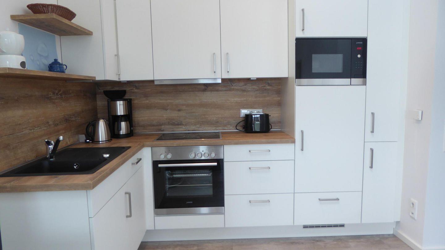 Küche und Haushalt: Einbauküche, Kühlschrank mit Gefrierfach, 4-Zonen Cerankochfeld, Backofen, Dunstabzugshaube, Geschirrspüler, Kaffeefiltermaschine, Toaster, Wasserkocher, hochwertiges Geschirr und Besteck, Eierkocher, Mikrowelle