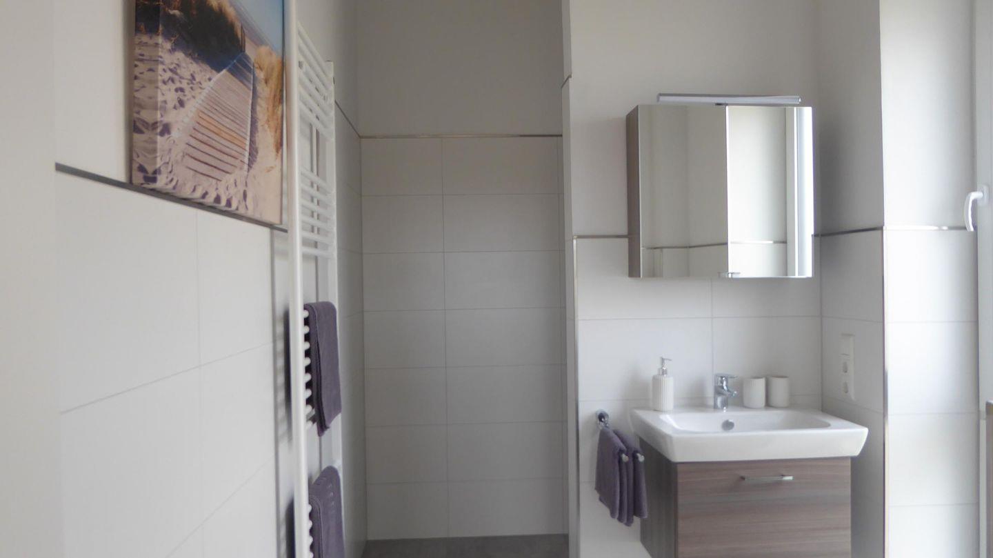 Bad und Sanitär: bodentiefe, barrierefreie Sommerregendusche, Waschtischanlage mit Spiegel, WC, Handtuchheizung, Föhn, Handtücher auf Anfrage