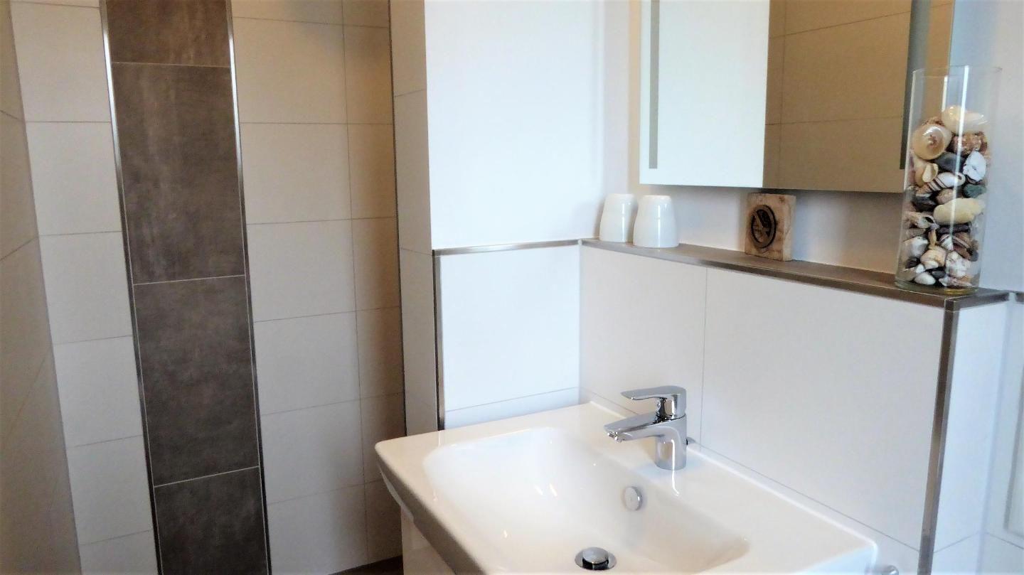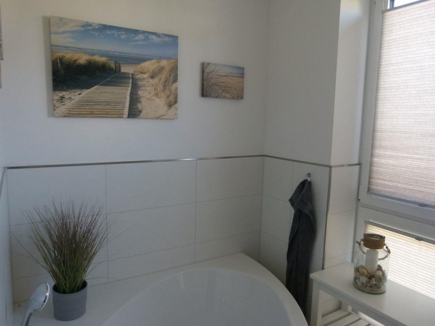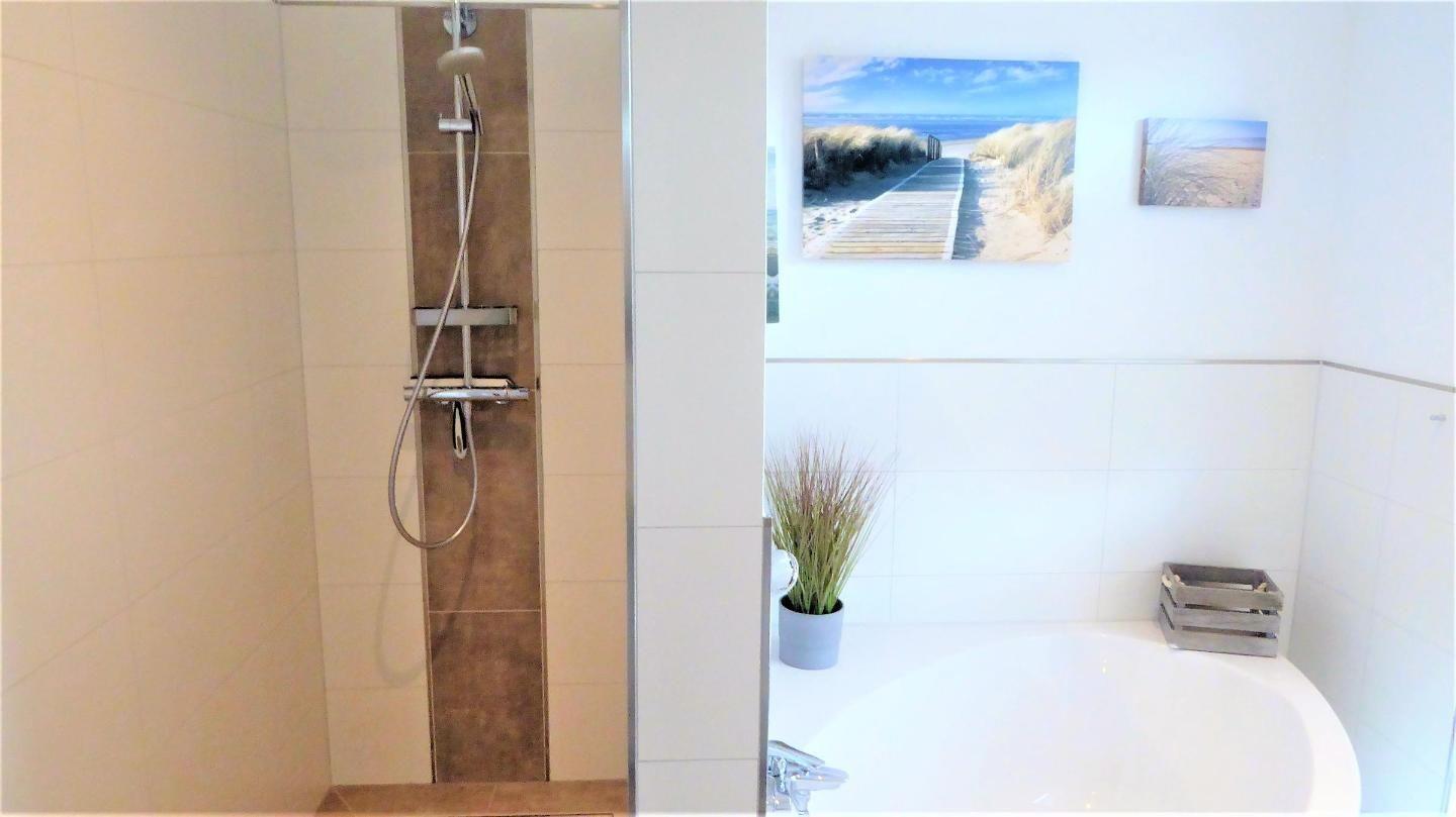 Bad und Sanitär im 1. OG: bodentiefe, barrierefreie Sommerregendusche, Badewanne, Waschtischanlage mit Spiegel, WC, Handtuchheizung, Föhn, Handtücher auf Anfrage