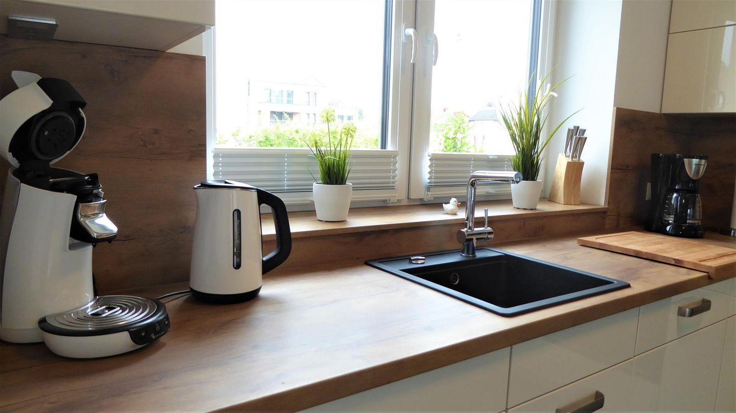 Küche und Haushalt: : hochwertige Einbauküche, Kühl-Gefrierkombination, 4-Zonen Cerankochfeld, Backofen, Dunstabzugshaube, Mikrowelle, Geschirrspüler, Kaffeefiltermaschine + Senseo Pad Kaffeemaschine, Toaster, Wasserkocher, hochwertiges Geschirr, Besteck und Küchenutensilien