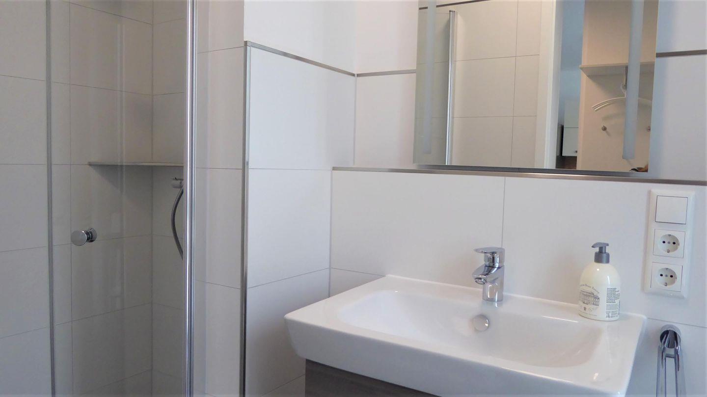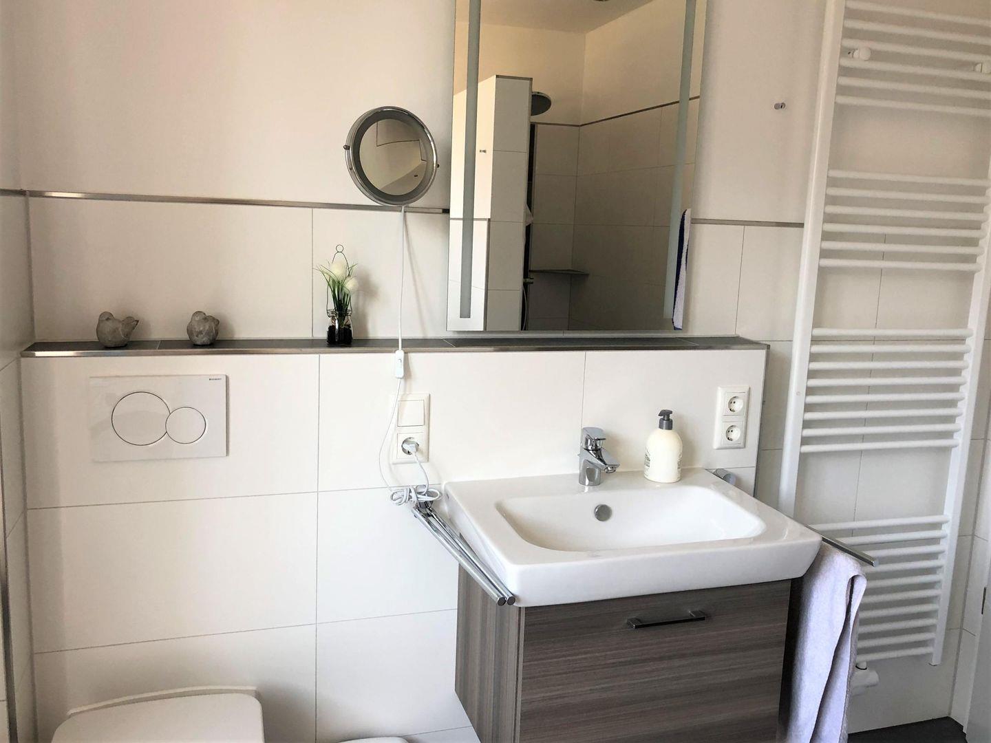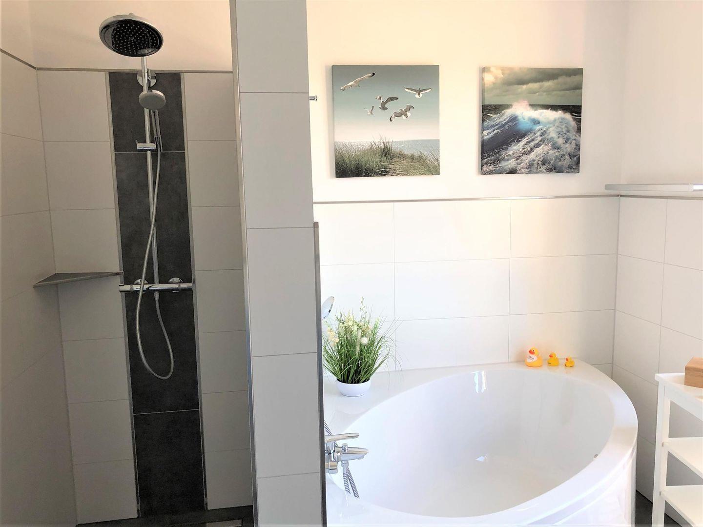 Vollbad im 1. OG: bodentiefe, barrierefreie Sommerregendusche, Badewanne, Waschtischanlage mit Spiegel + Kosmetikspiegel, WC, Handtuchheizung, Föhn - Handtücher auf Anfrage