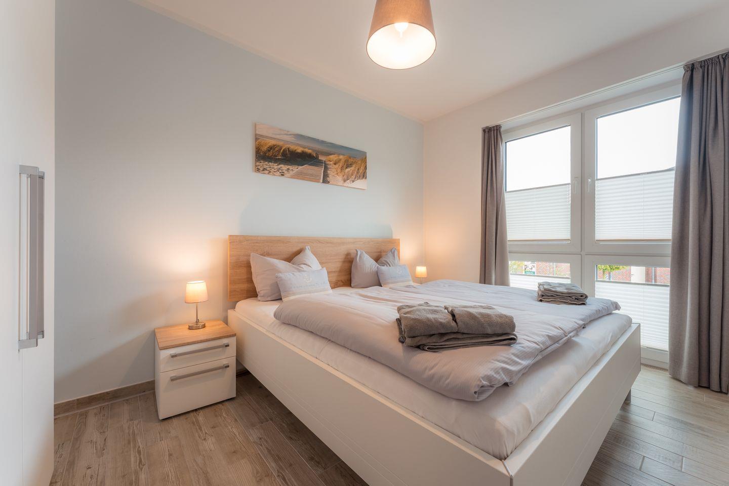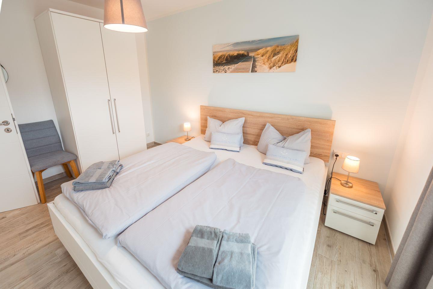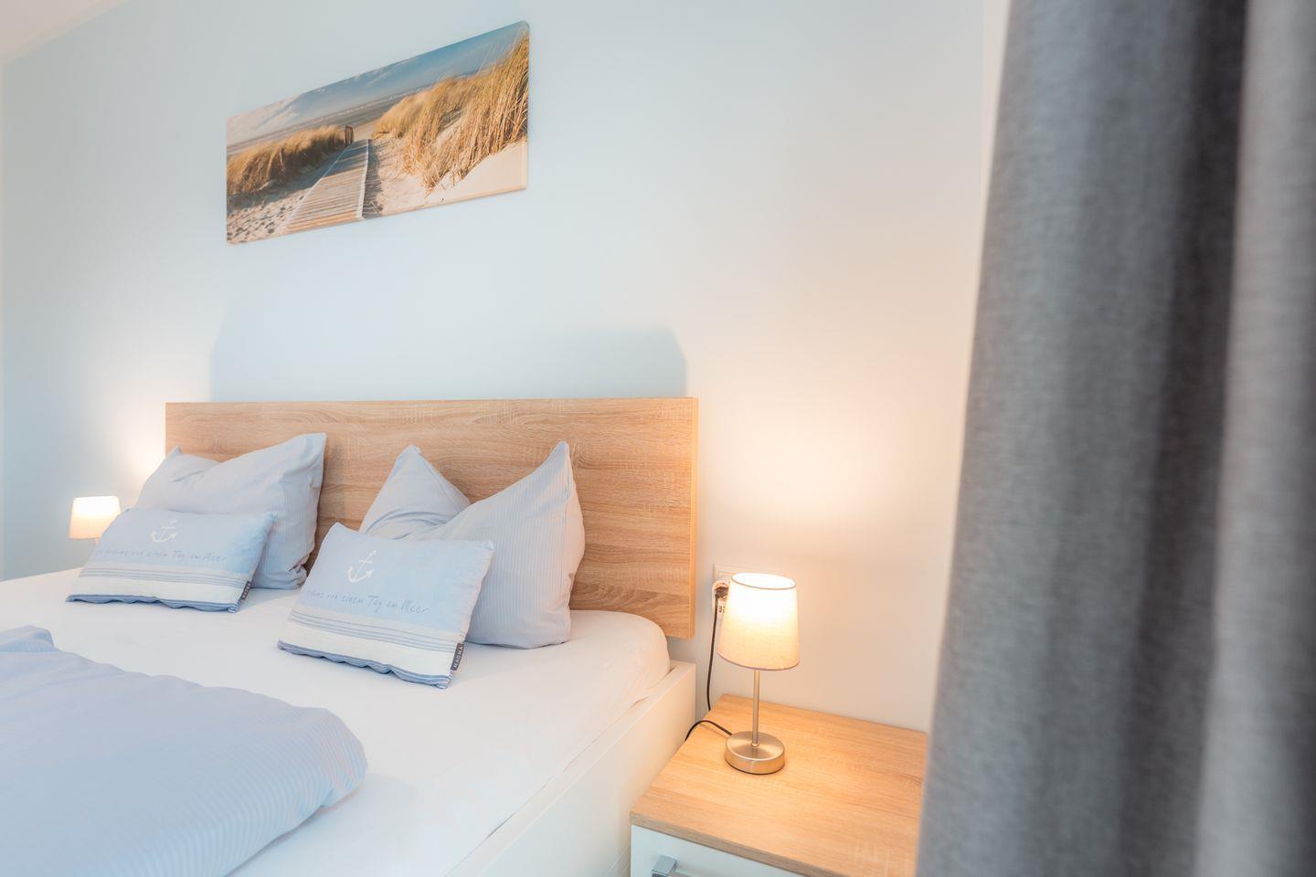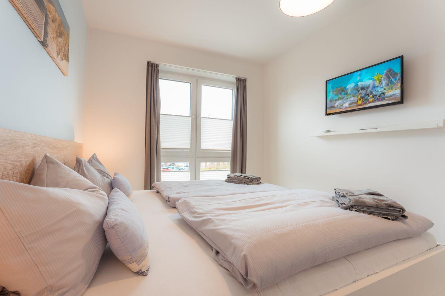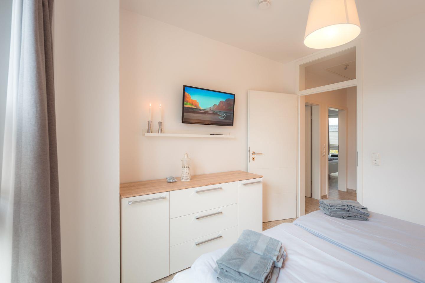 Schlafzimmer 2: Doppelbett (Maße: 180 x 200 cm) mit 2 Einzelmatratzen, Nachttische, Sideboard, Verdunklungsmöglichkeit, Smart-TV
