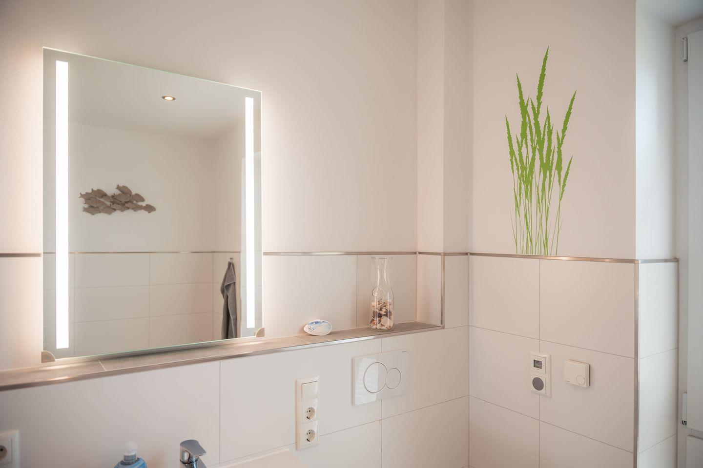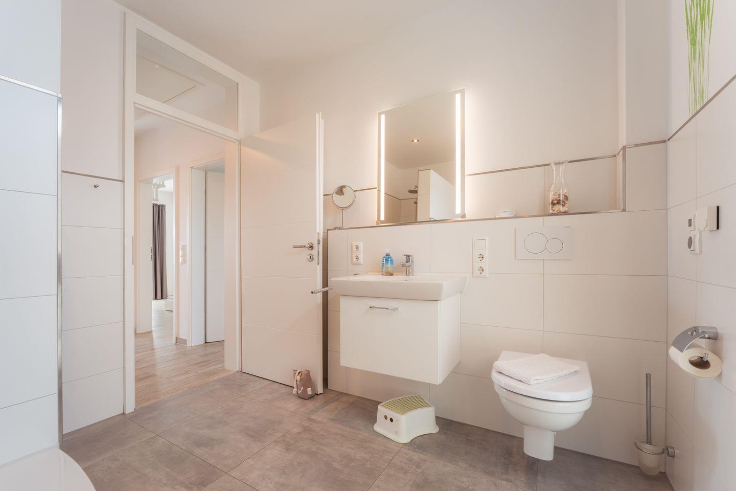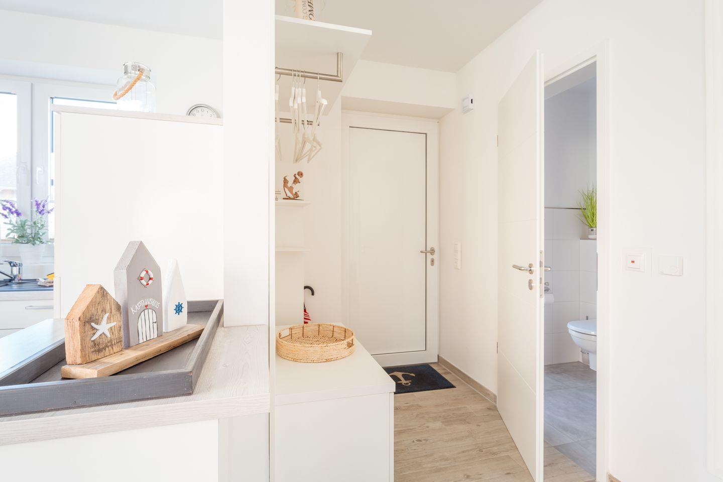 Der Eingangsbereich ist mit einer Garderobe sowie einem großen Ganzkörperspiegel ausgestattet. Das Dusch-Bad mit bodengleicher Tropendusche im EG bietet eine praktische Ausweichmöglichkeit mit vollem Komfort zum Wannen-Bad im OG. Direkt neben der Treppe befindet sich ein Hauswirtschaftsraum, mit allem was man im Urlaub benötigt (inkl. Trockner und Waschmaschine, Wäscheständer etc.).