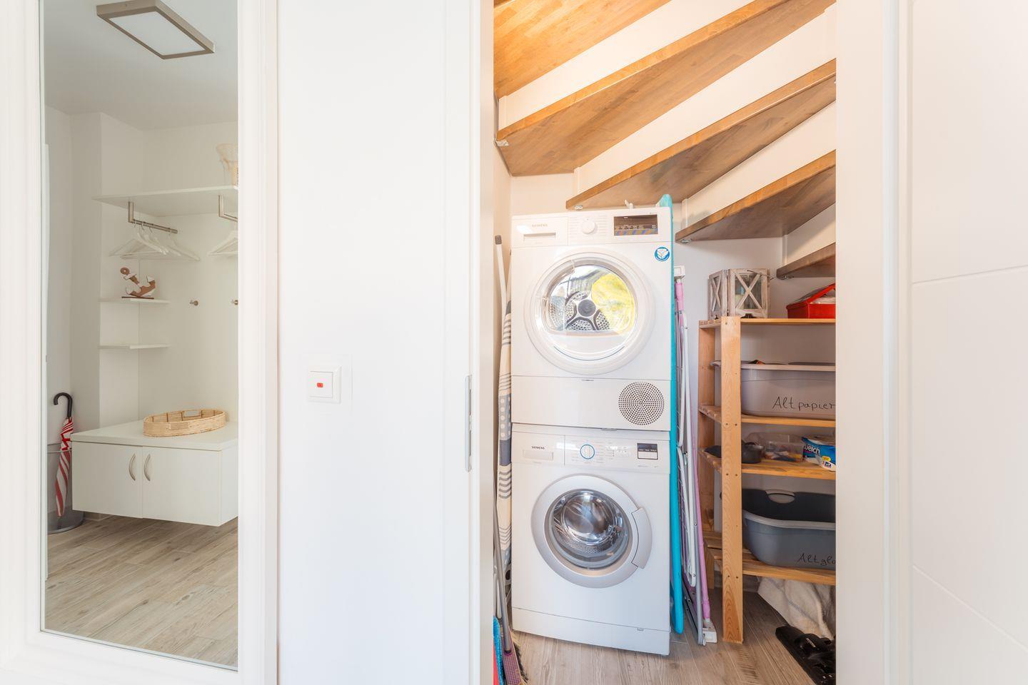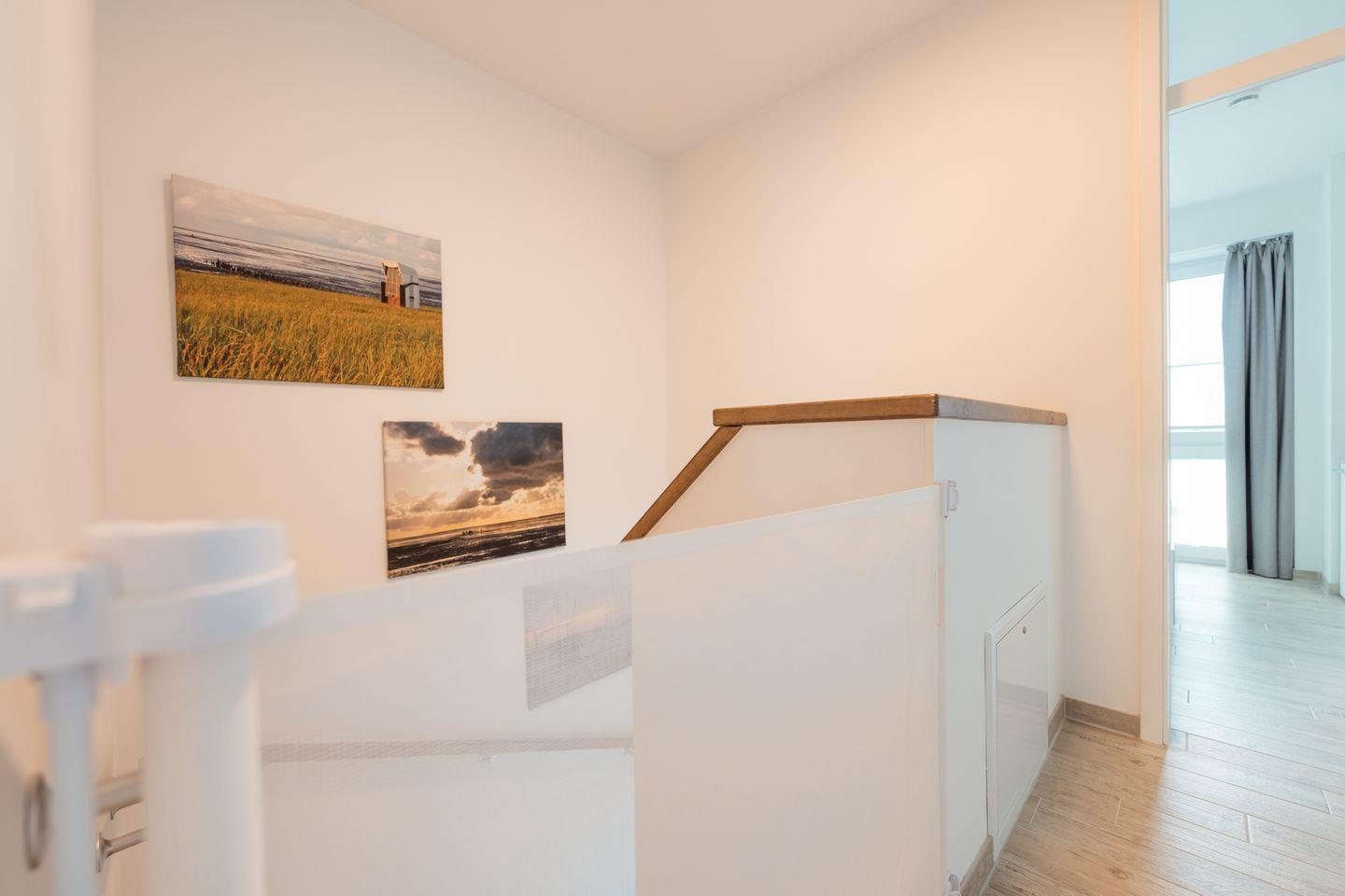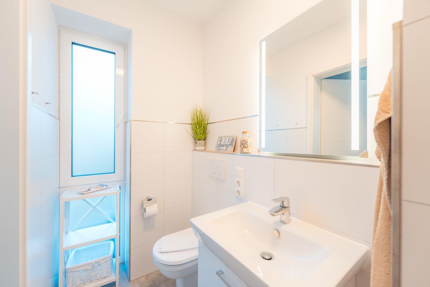 Der Eingangsbereich ist mit einer Garderobe sowie einem großen Ganzkörperspiegel ausgestattet. Das Dusch-Bad mit bodengleicher Tropendusche im EG bietet eine praktische Ausweichmöglichkeit mit vollem Komfort zum Wannen-Bad im OG. Direkt neben der Treppe befindet sich ein Hauswirtschaftsraum, mit allem was man im Urlaub benötigt (inkl. Trockner und Waschmaschine, Wäscheständer etc.).