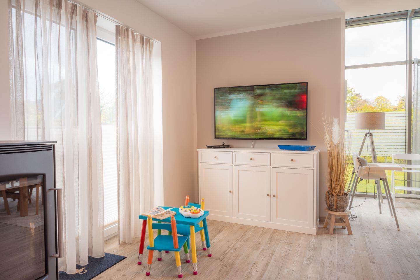 Im Sideboard unter dem großen Fernseher finden Sie u.a. Spiele und Bücher für Groß und Klein.