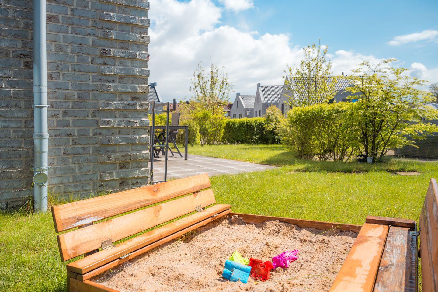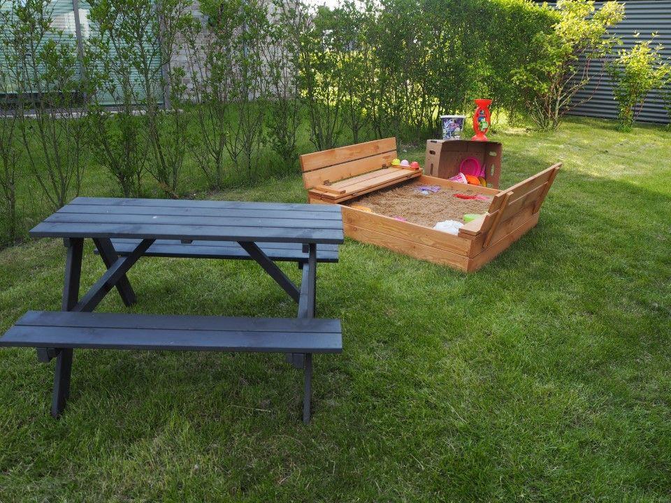 Im großzügigen Garten steht ein Sandkasten mit Sonnenschirm und entsprechendem Spielzeug. Im Gartenschuppen liegt weiteres „Outdoor-Spielzeug“ und für die Ausflüge zum Strand steht ein Bollerwagen zur Verfügung.