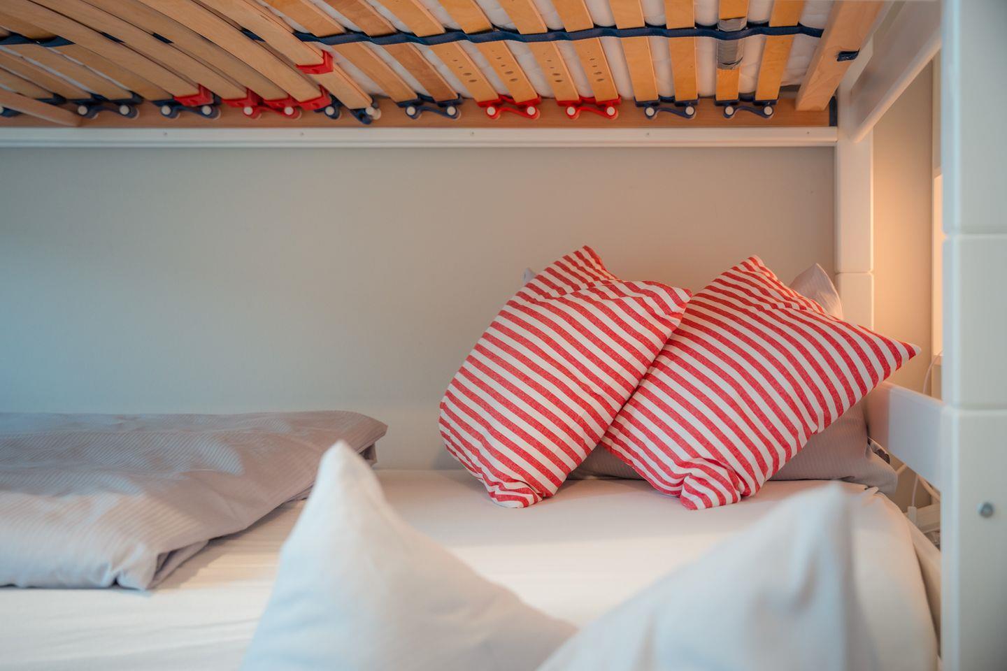 Schlafzimmer 3: 1 x Etagenbett (Maße: 2x 90 x 200cm, 1x 90 x 190cm), Hochregal, Kleiderschrank, Stuhl, Verdunklungsmöglichkeit
