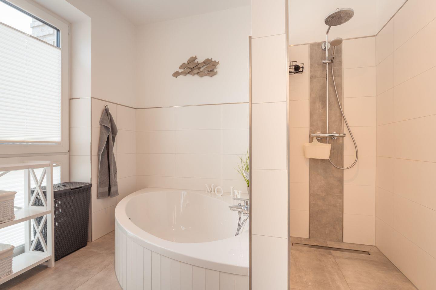 Bad und Sanitär im 1. OG: bodentiefe, barrierefreie Sommerregendusche, Badewanne, Waschtischanlage mit Spiegel, Schminkspiegel, WC, Handtuchheizung, Föhn, Einbauradio, A