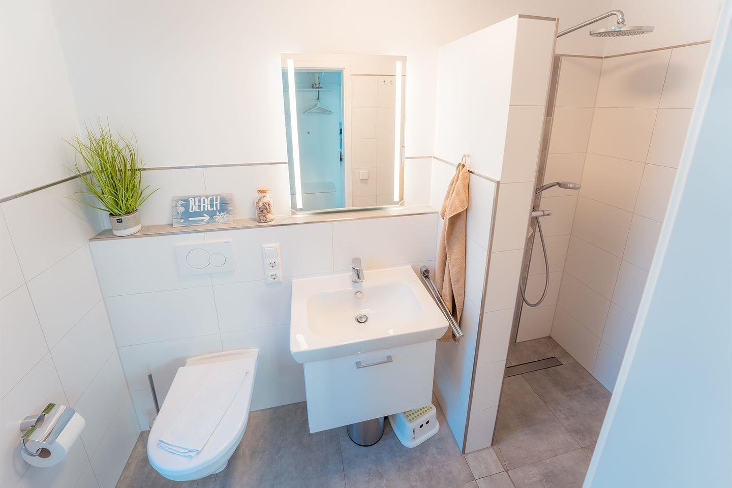 Duschbad im Erdgeschoss: bodentiefe, barrierefreie Sommerregendusche, Waschtischanlage mit Spiegel, Schminkspiegel, WC, Einbauradio, Abstellflächen und Körbe, Fön, Abstellregal, Körbchen