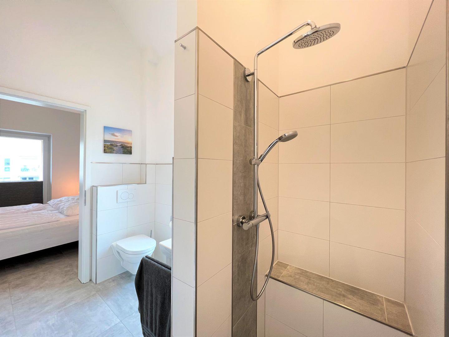 Vom Schlafzimmer geht es weiter zu Ihrem Duschbad mit WC, beleuchtetem Spiegel und begehbarer Sommerregendusche.