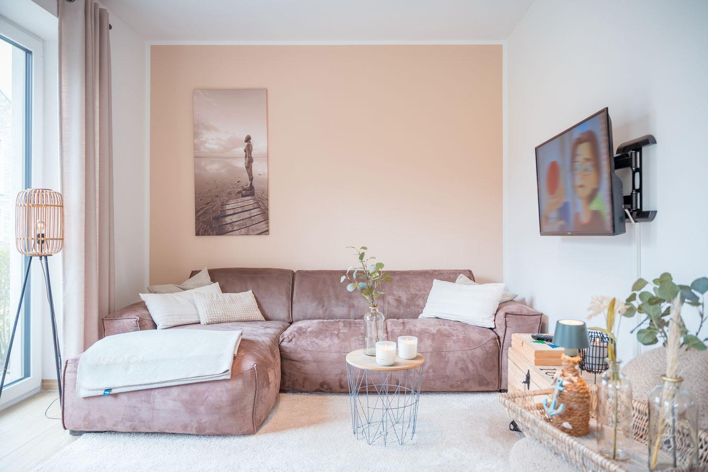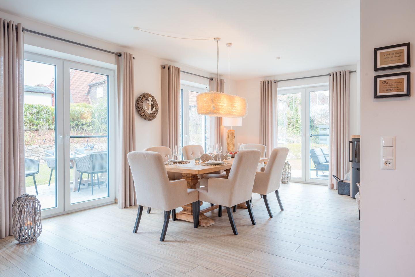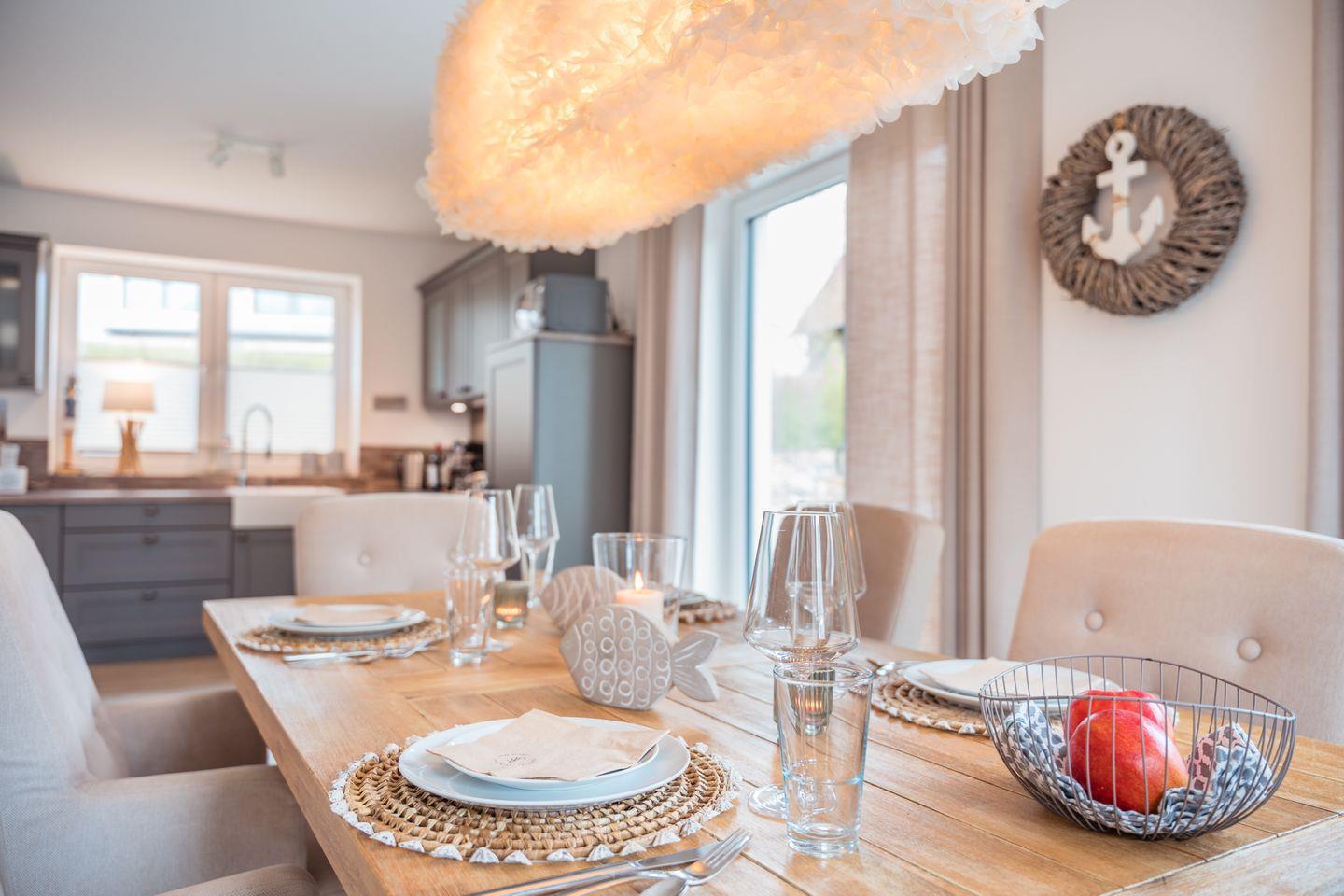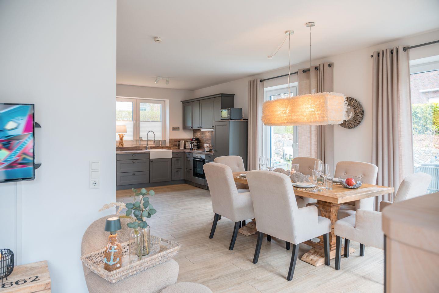 Die Einrichtung kommt elegant und stilsicher daher. Sie betreten den offenen Wohn-Essbereich und werden sich wohlfühlen: die offene Küche mit vielen Extras, der große robuste Esstisch oder die Lümmel-Eckcouch mit dem Kamin.