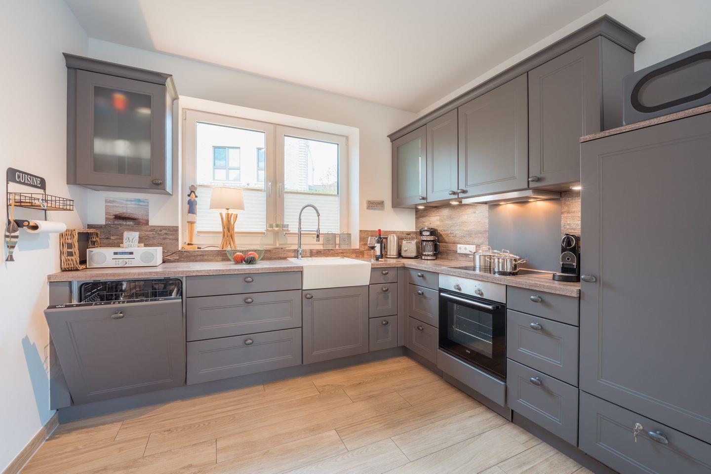 Küche und Haushalt: Einbauküche, Kühlschrank mit Gefrierfach, 4-Zonen Cerankochfeld, Backofen, Dunstabzugshaube, Mikrowelle, Geschirrspüler, Kaffeefiltermaschine + Kapselmaschine, Toaster, Wasserkocher, hochwertiges Geschirr und Besteck