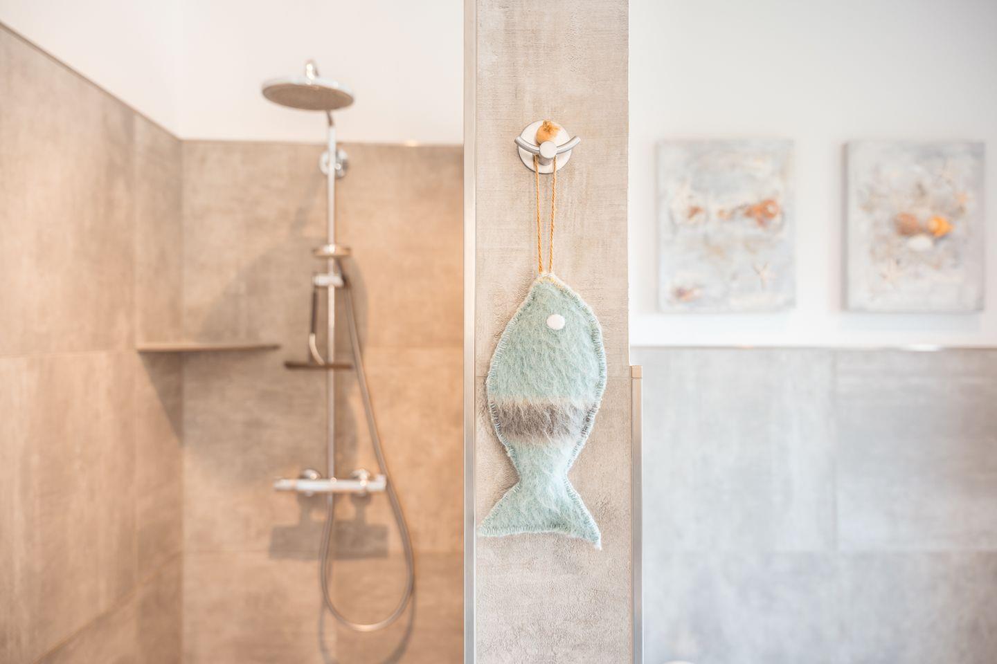 Bad und Sanitär im 1. OG: bodentiefe, barrierefreie Sommerregendusche, Badewanne, Waschtischanlage mit Spiegel, WC, Handtuchheizung, Föhn, Handtücher auf Anfrage