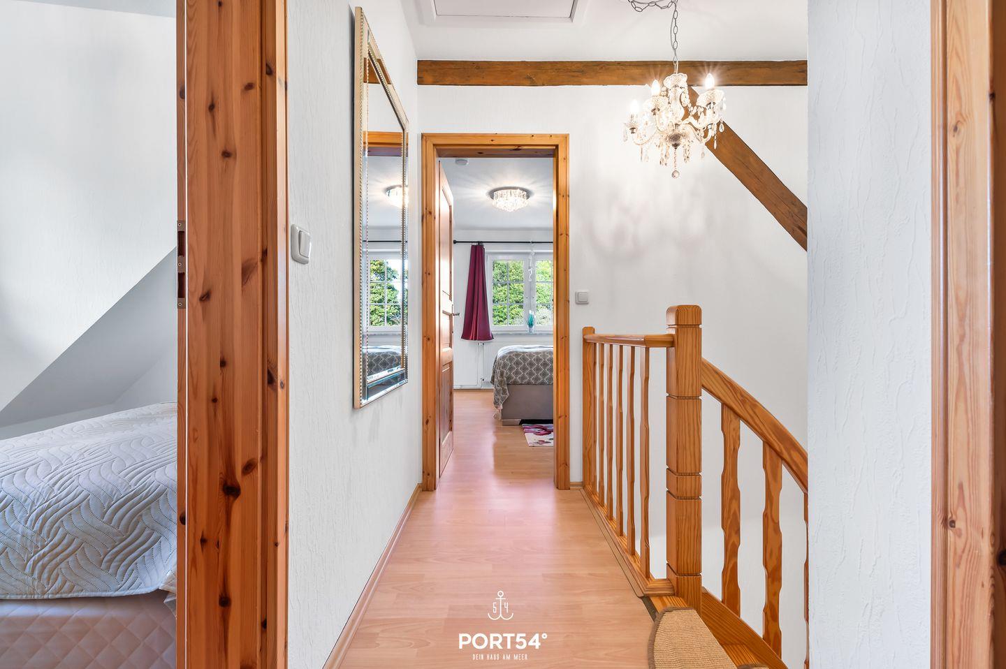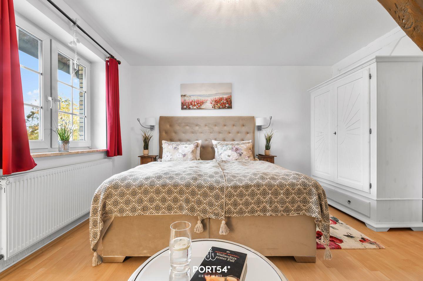 Die beiden Schlafzimmer im Obergeschoss sind mit einem Doppelboxspringbett (180x200 cm) und zwei Einzelbetten (je 100x200 cm) ausgestattet. Beide verfügen über Verdunkelungsmöglichkeiten, Insektenschutzgitter und ein Schlafzimmer über einen Flachbild-TV.