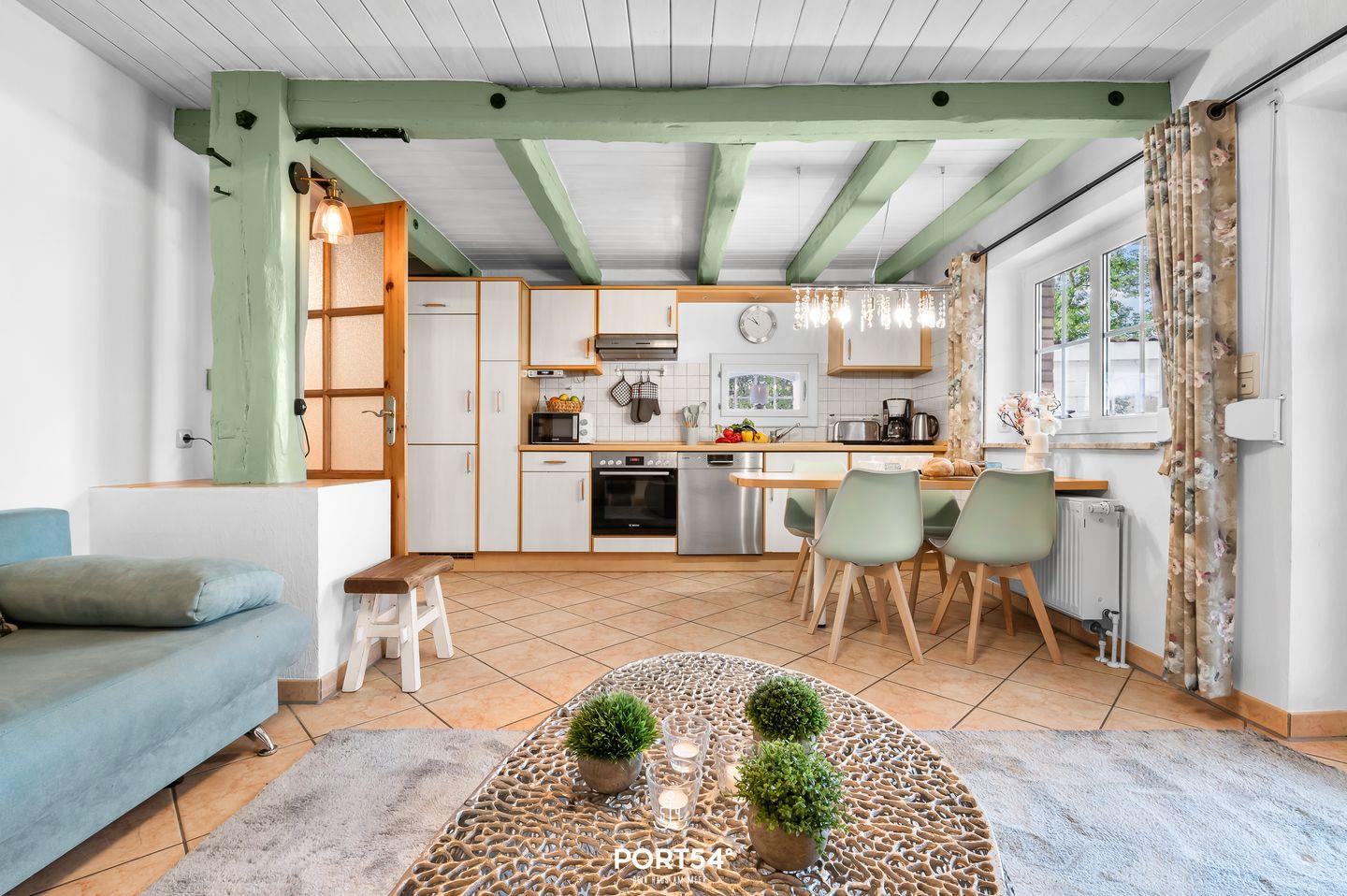 Die offene Küche und der Wohnbereich grenzen direkt an die überdachte Terrasse. In der Küche finden Sie alles für den perfekten nächsten Kochabend und im Wohnbereich können Sie es sich auf dem Sofa vor dem Fernseher bequem machen.