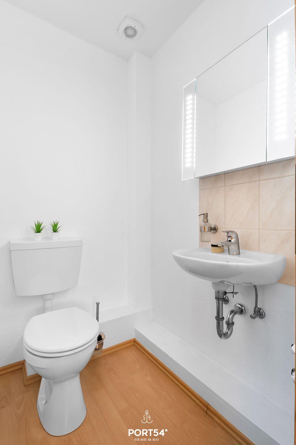 Das Badezimmer befindet sich im EG und verfügt über eine Dusche, WC, Waschbecken und einen Föhn.