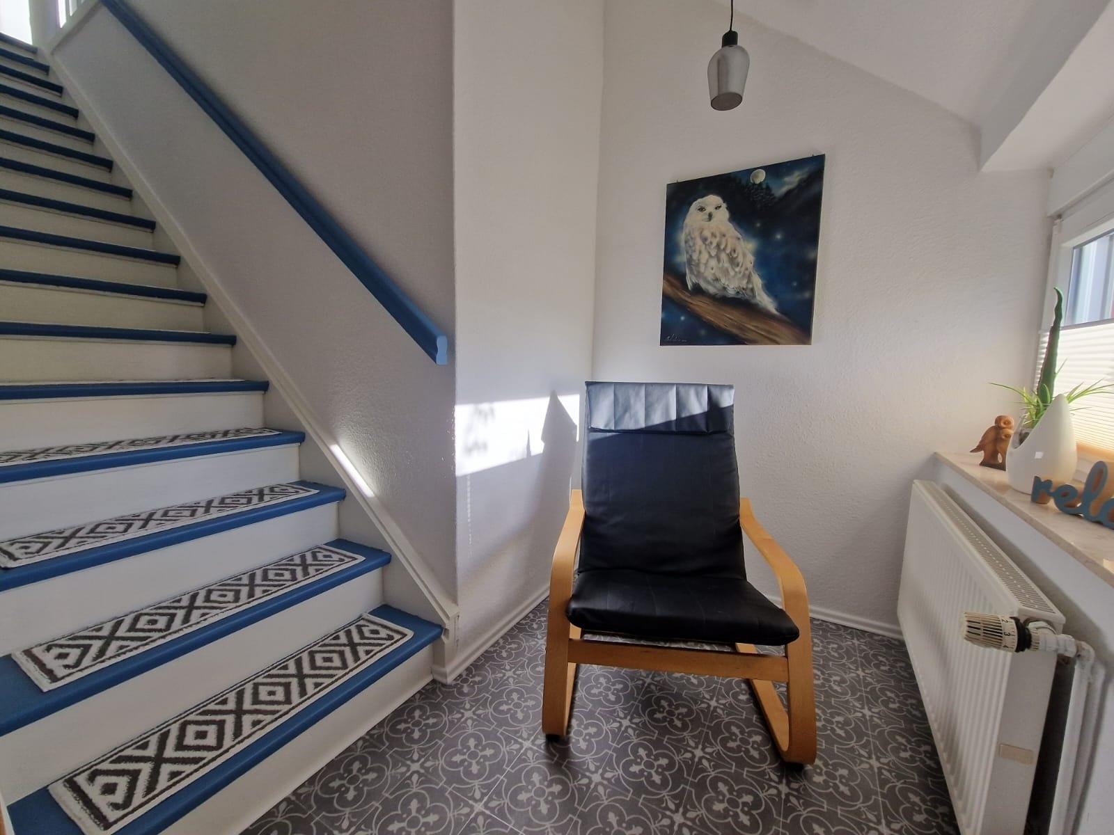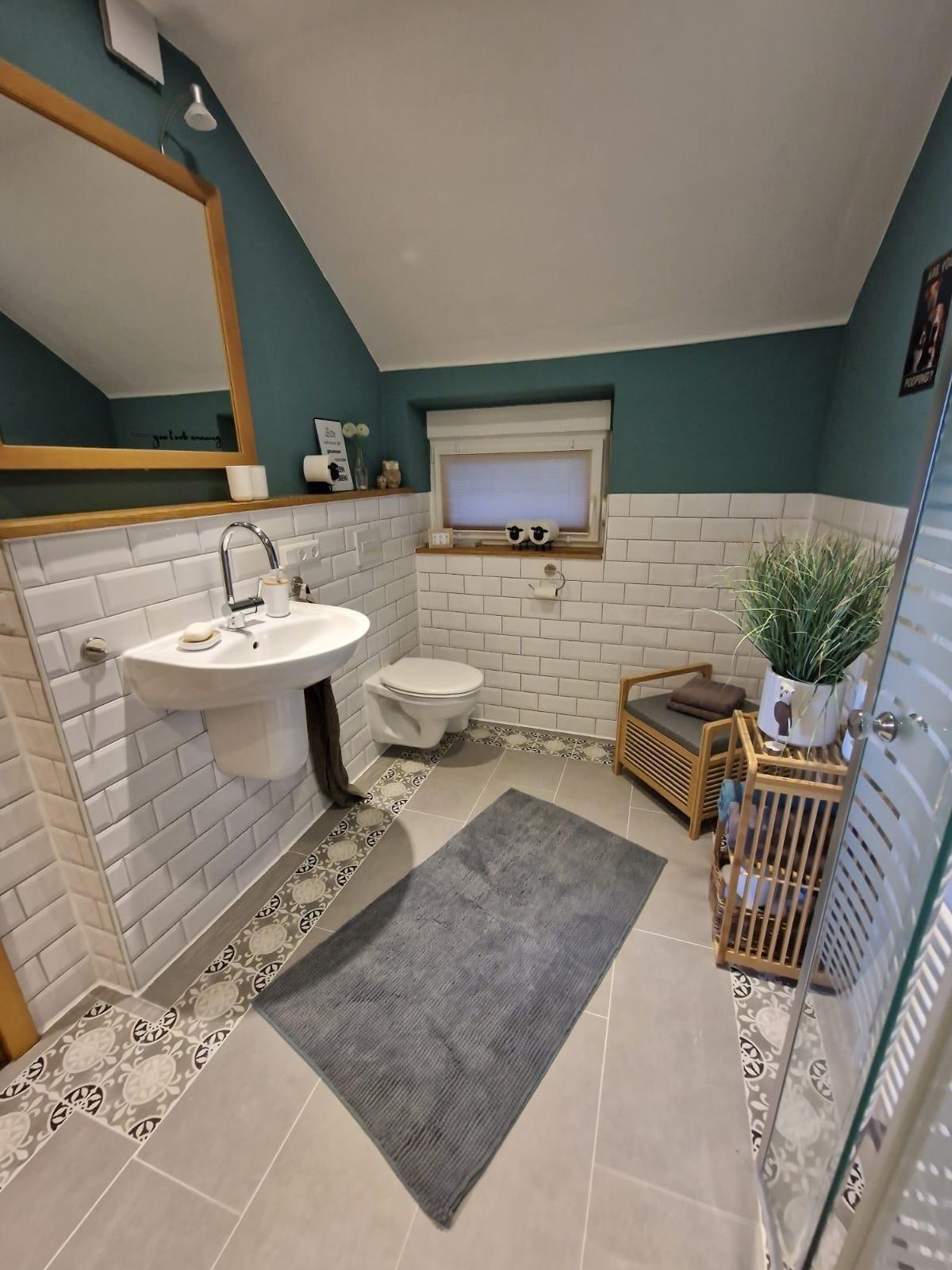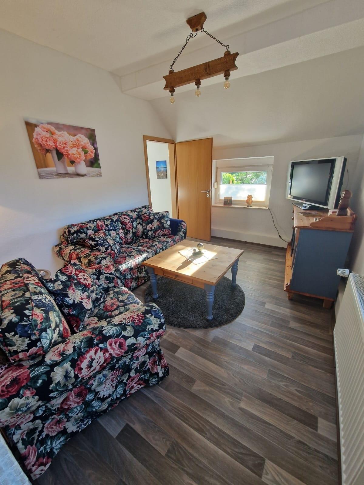 Unsere urgemütliche Ferienwohnung haben wir mit ganz viel Herzblut renoviert. Im Erdgeschoss befinden sich Wohnzimmer, Küche und Bad.
