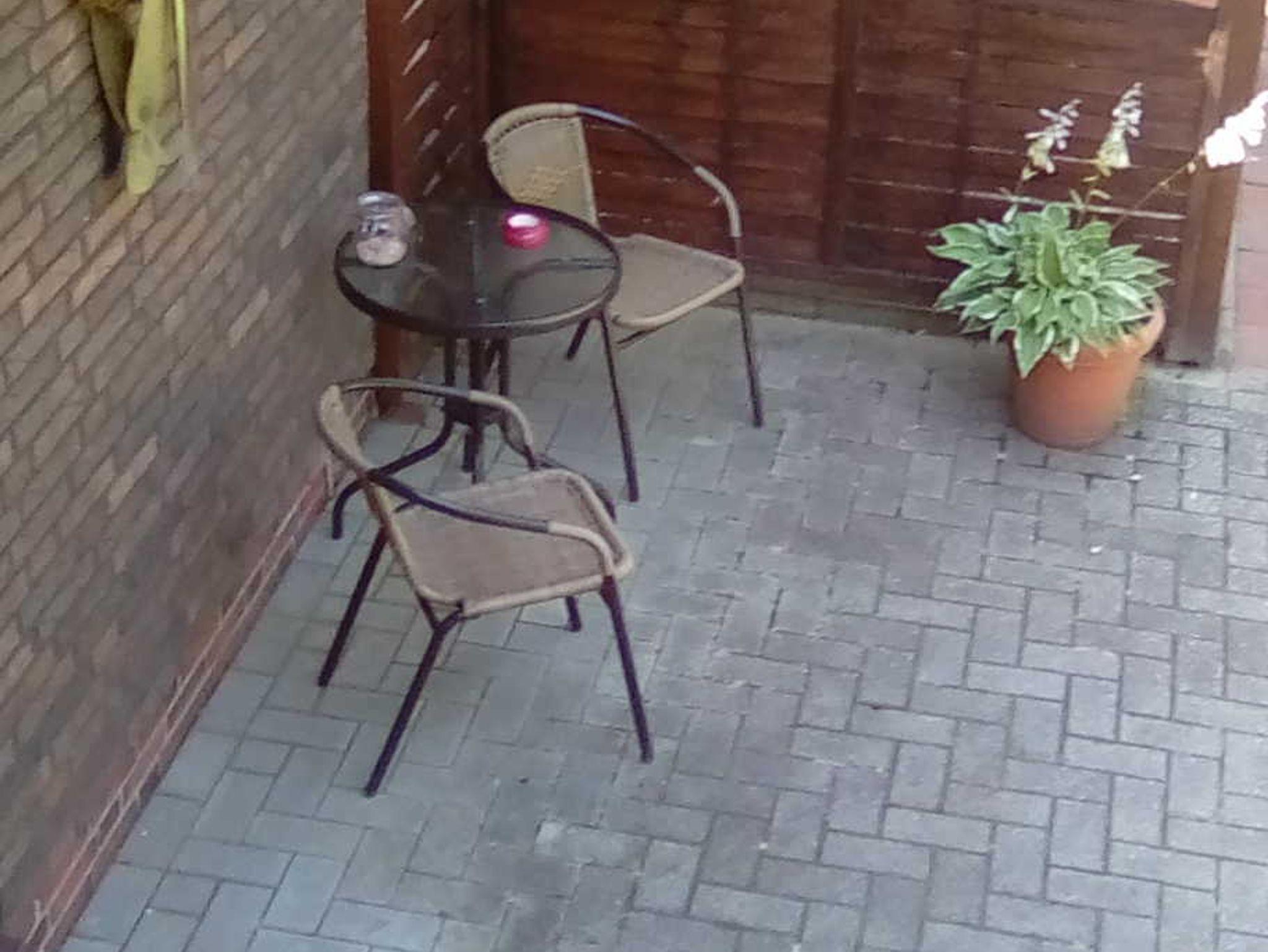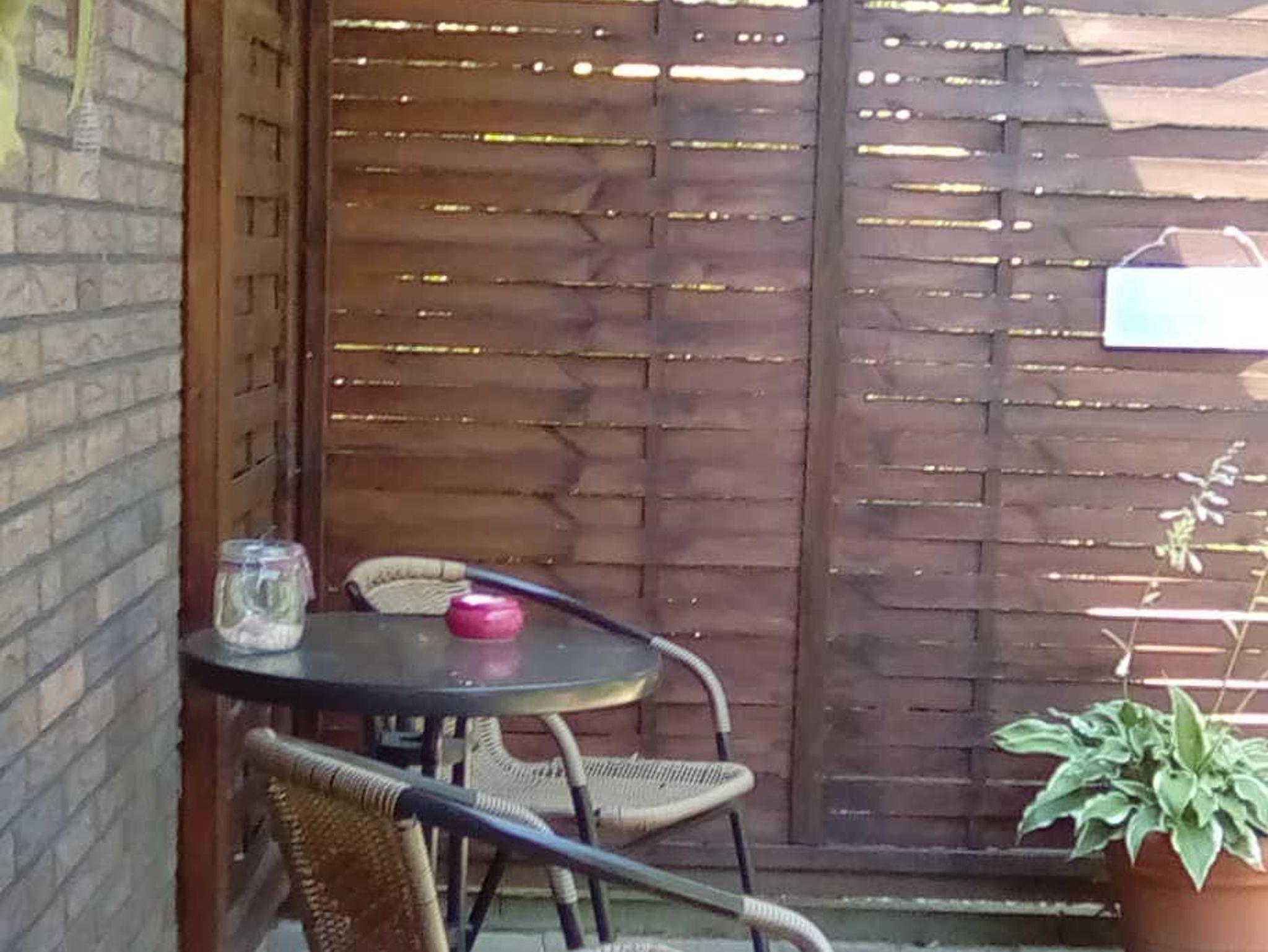 Eigene Terrasse mit Gartenmöbel und Grill.