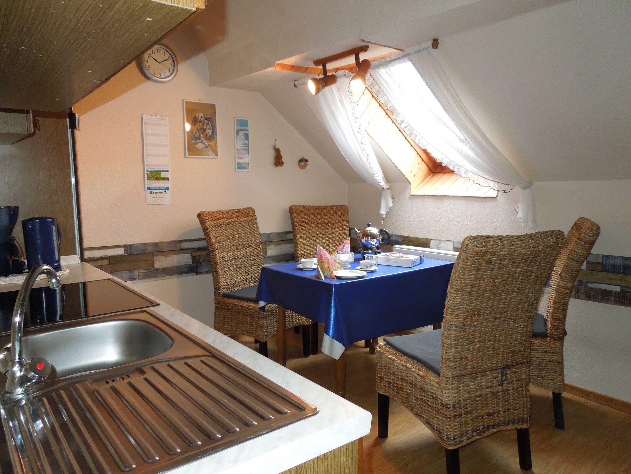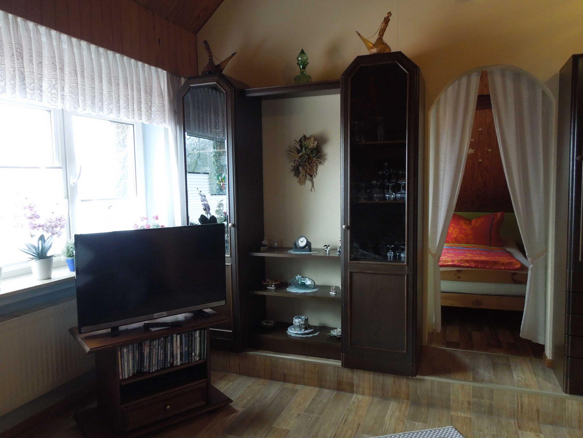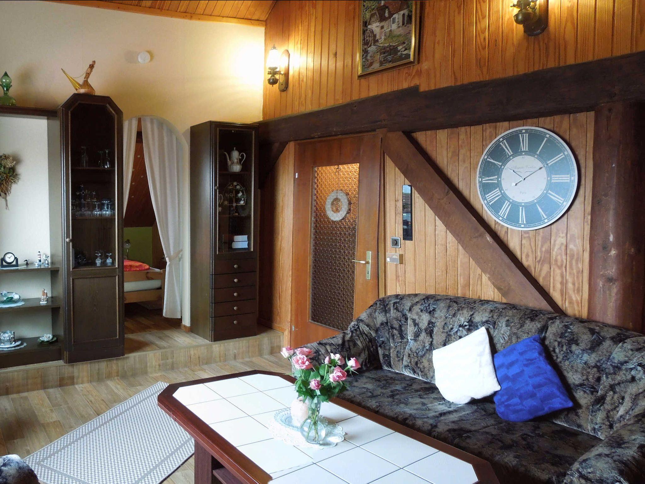 Gemütliche Oberwohnung mit seperatem Eingang. Wohnzimmer mit Schlafcouch und mit SAT-TV, DVD und Internet.