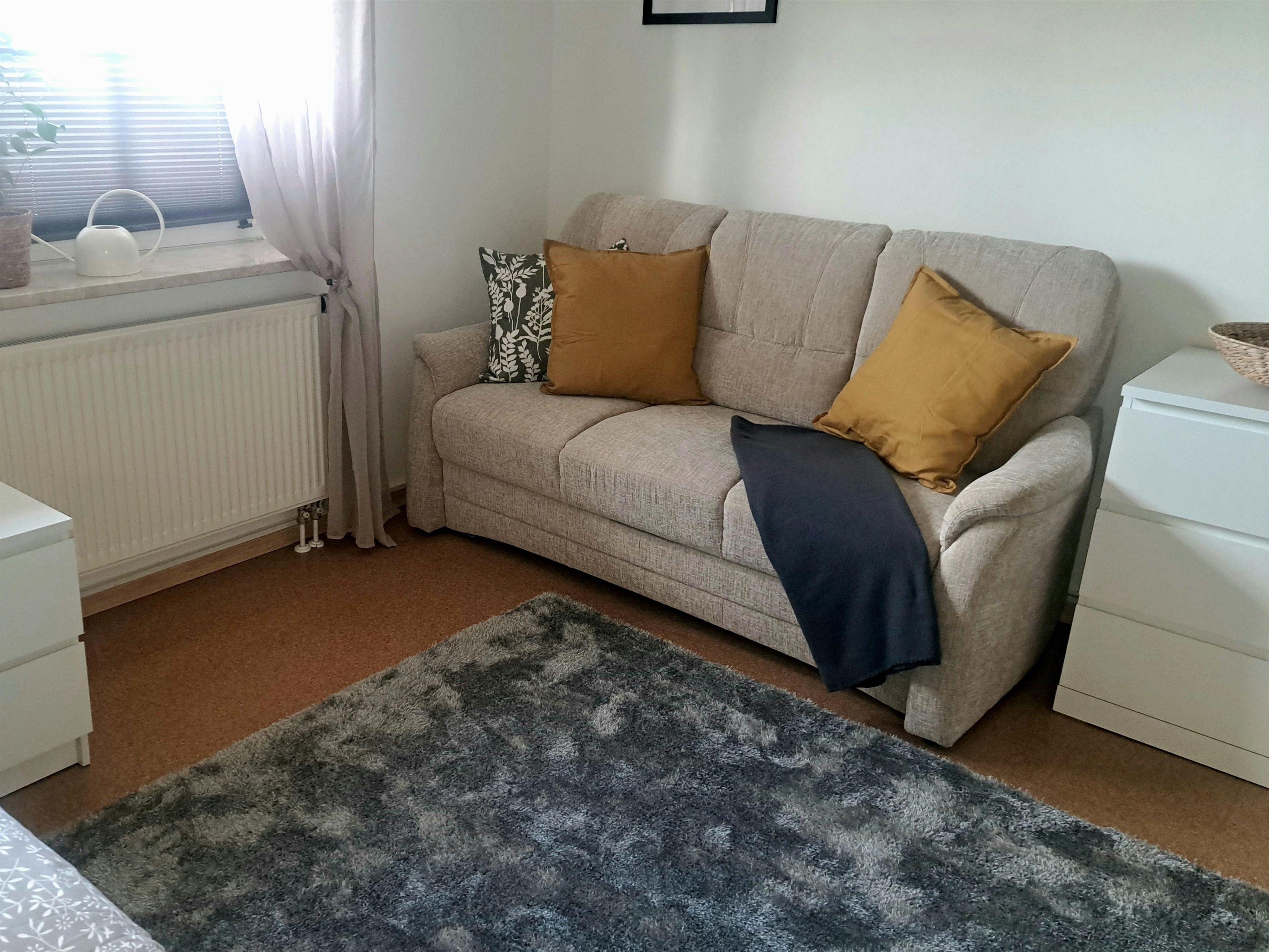 Das Schlafzimmer bietet Platz für 2 Personen mit einem Doppelbett mit einer gemütlichen Sitzecke und einem großen Kleiderschrank .