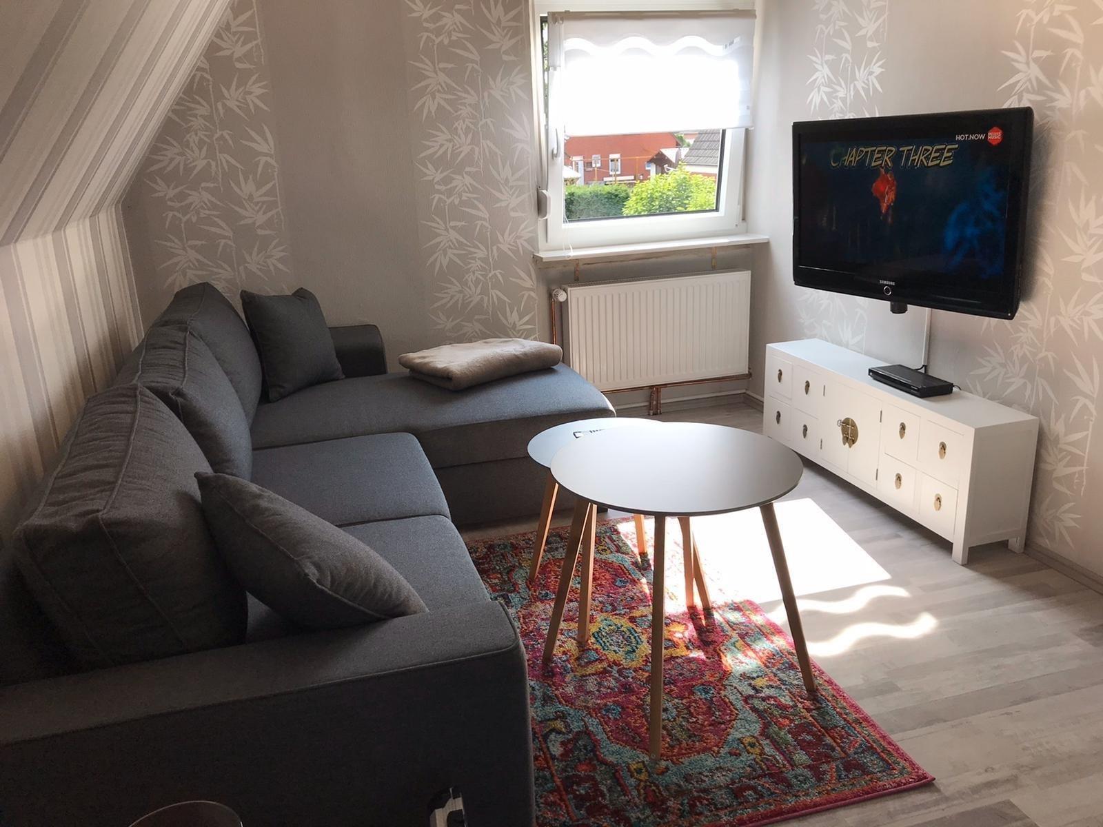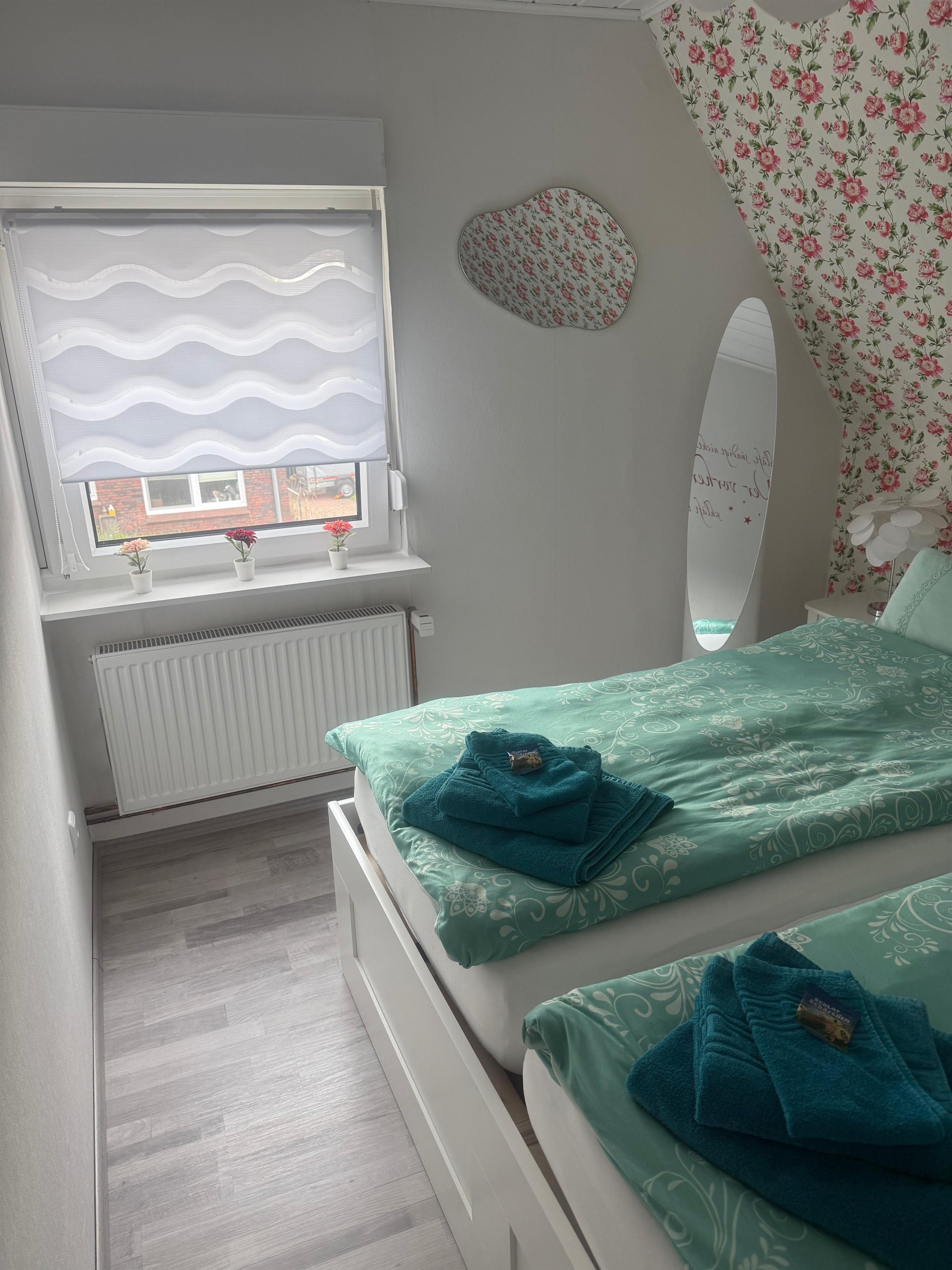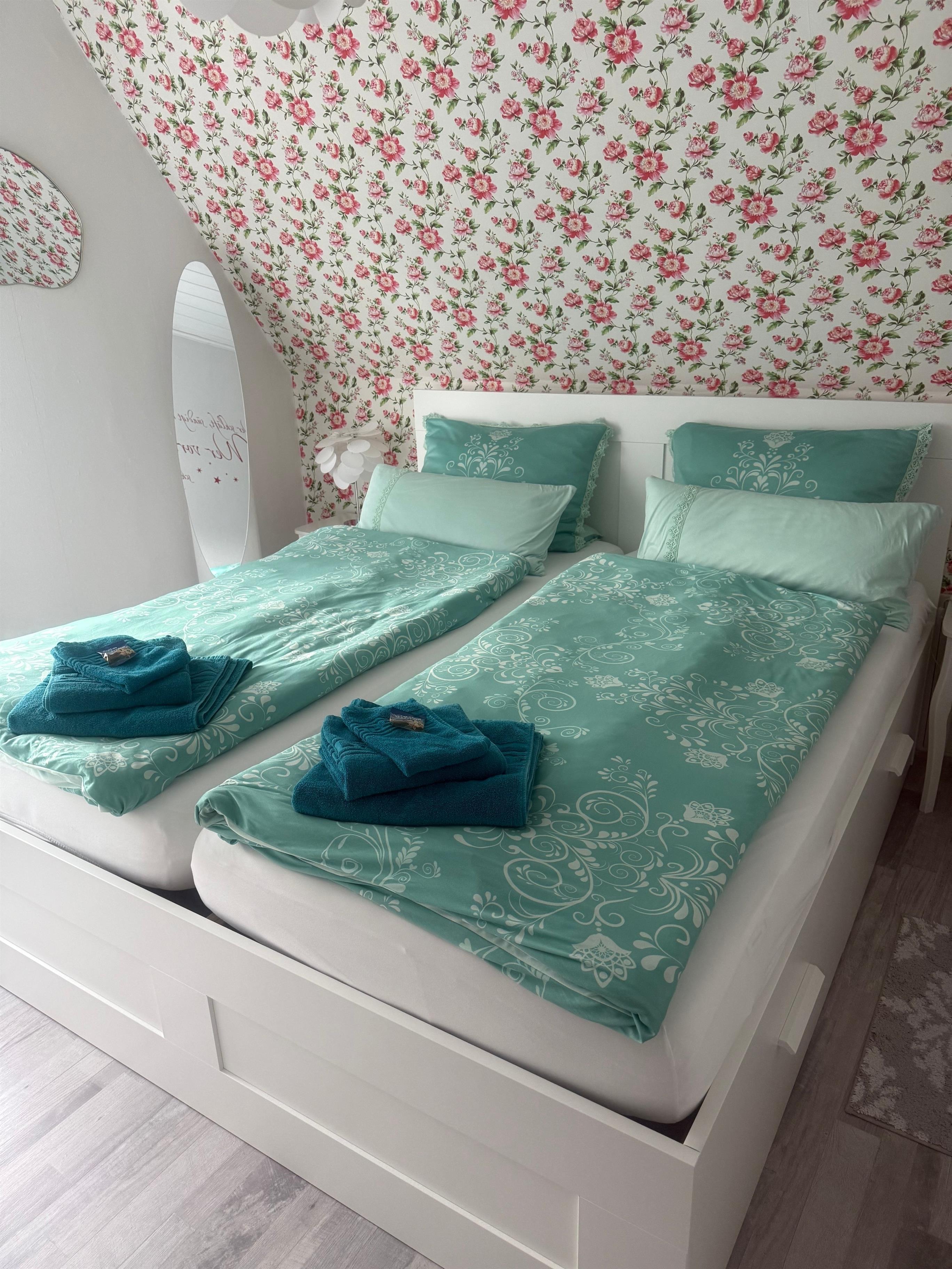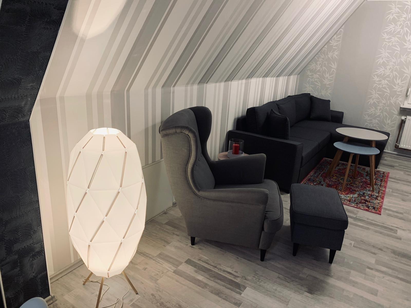 Mit viel Liebe und Herzblut haben wir hier eine schnuckelige Ruheoase für sie gezaubert. Die Wohnung befindet sich in der ersten Etage des Hauses in der Buchenstraße drei. Sie verfügt über ein Schlafzimmer mit einem Doppelbett, 180x200 m das kein offenes Fußende hat und einem 3 türigen Kleiderschrank. Das Wohnzimmer lädt in einem gemütlichen Ohrensessel mit Hocker zu einer schönen Tasse Tee und einem schönen Buch ein.