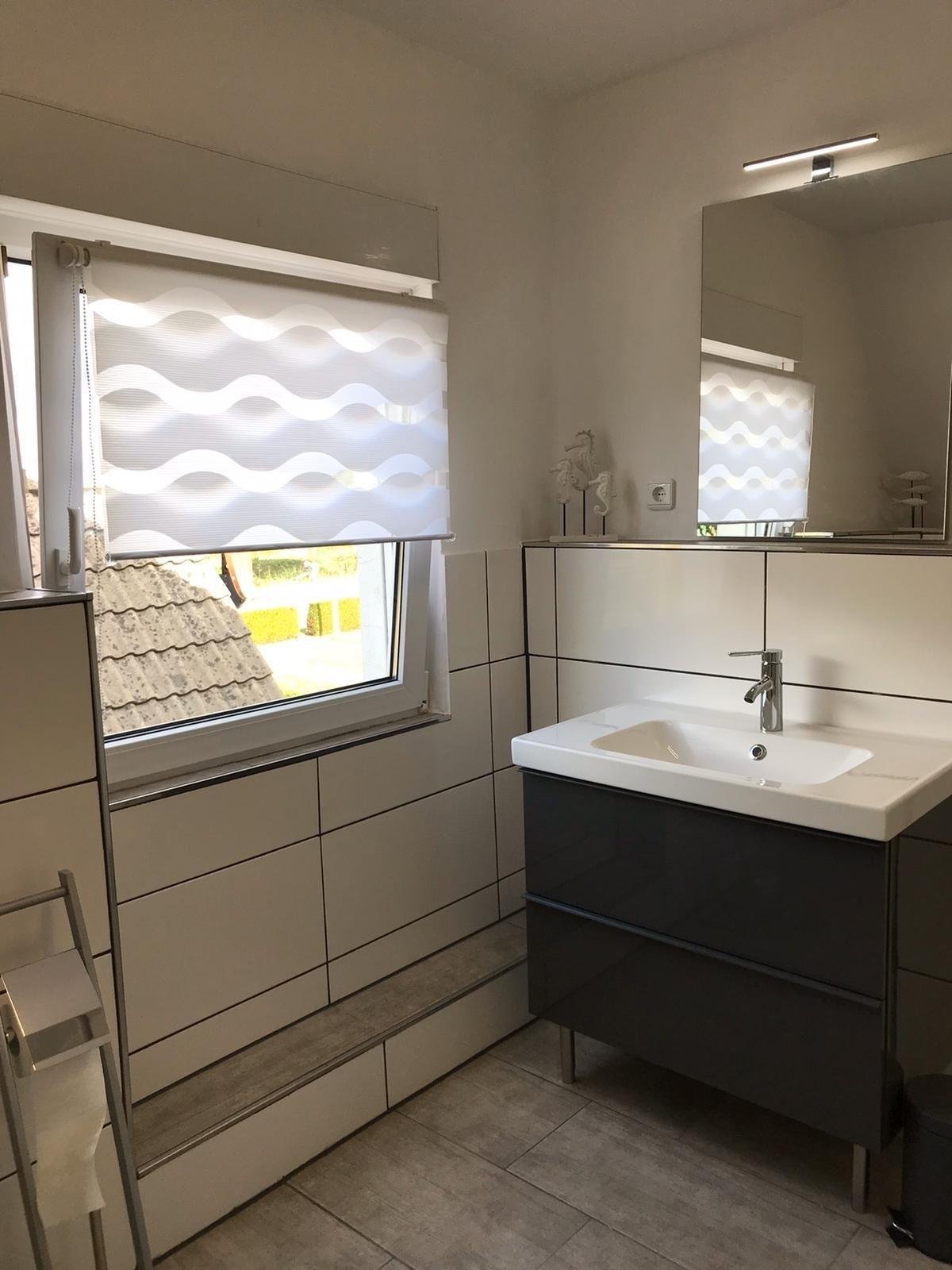 Das Badezimmer ist mit einer 90 × 90, großen Dusche, einem Waschtisch mit Schubladen, einem Föhn und einer Toilette ausgestattet. Der Handtuchhalter dient gleichzeitig als Heizung.