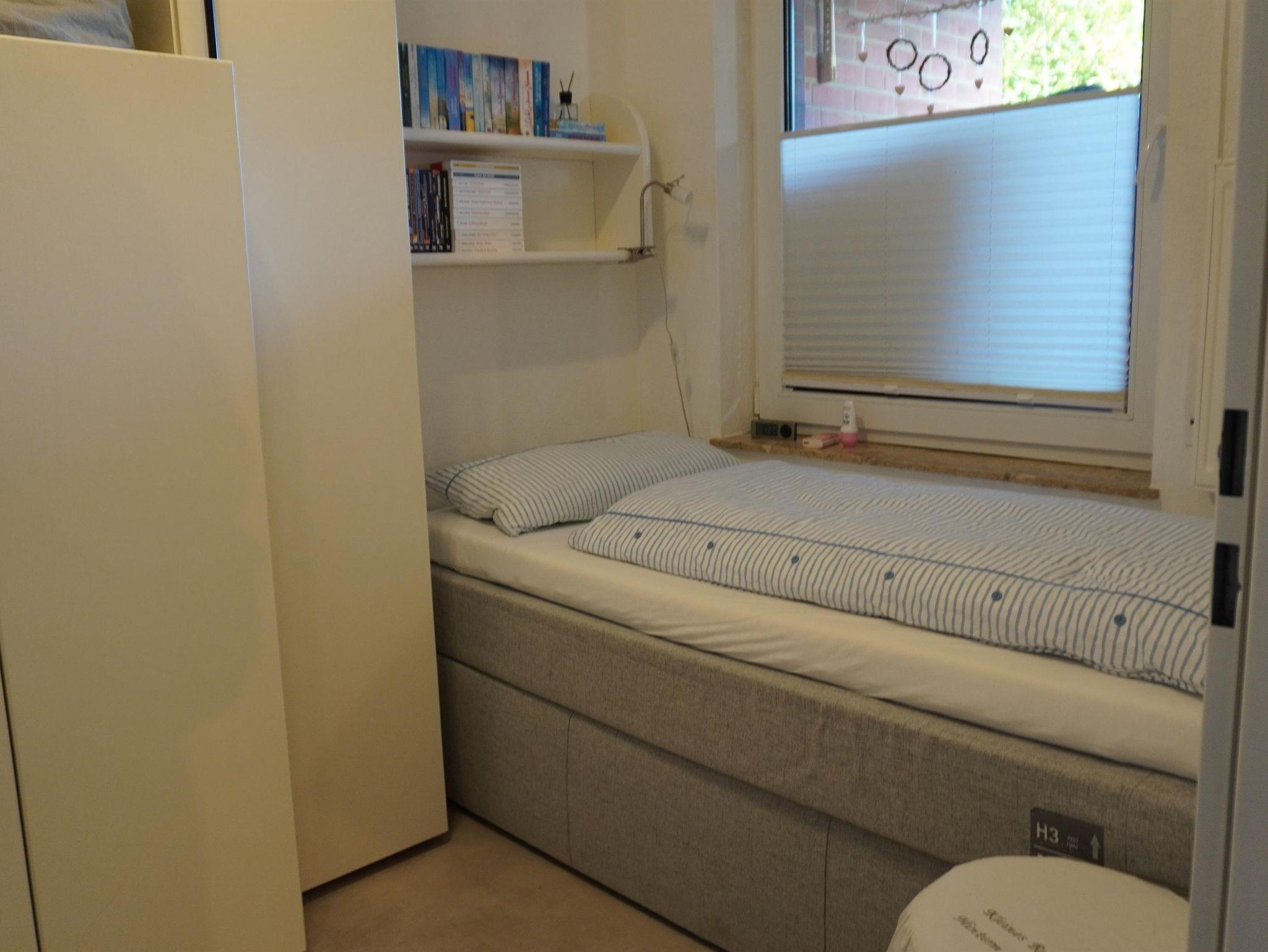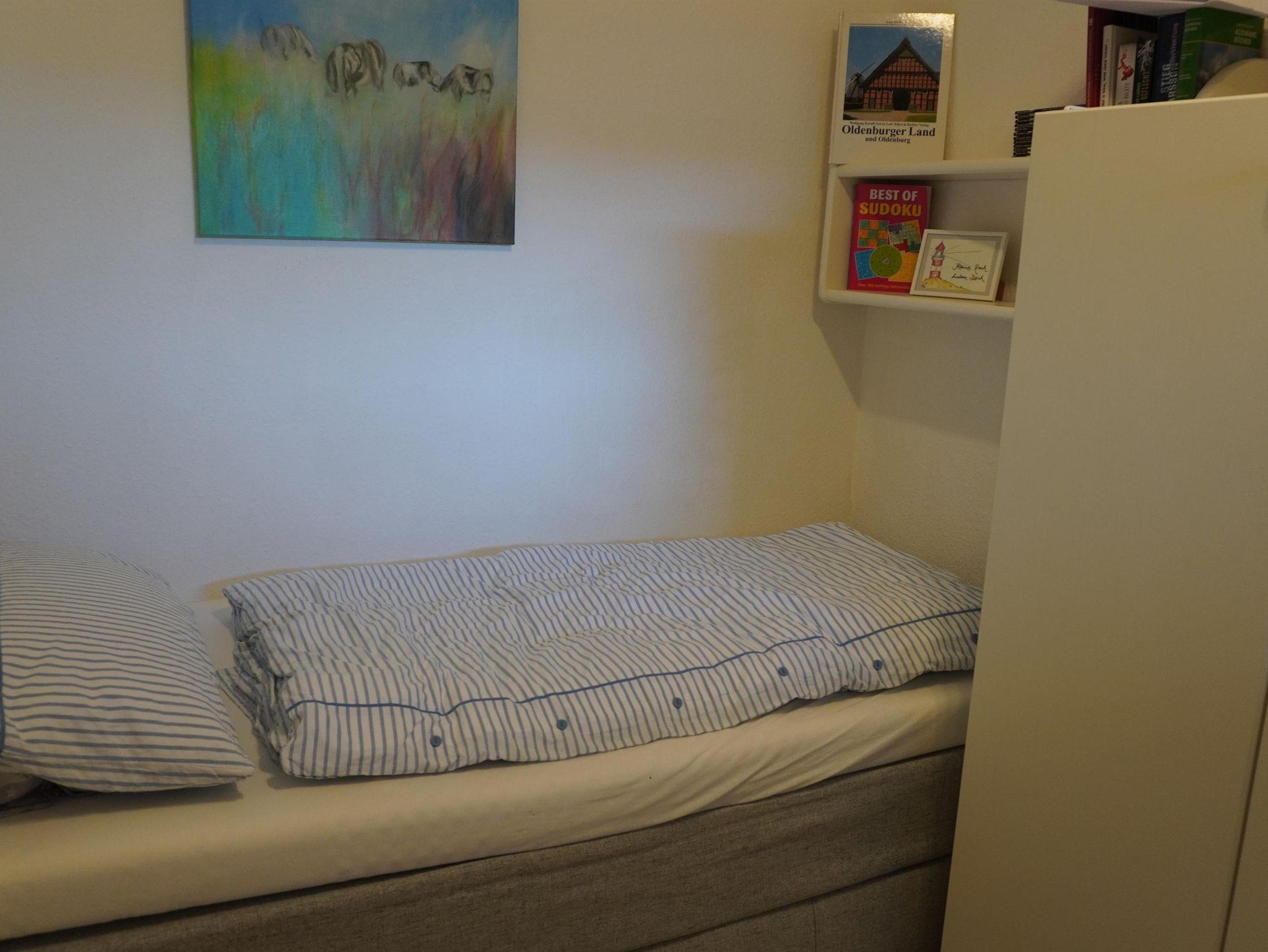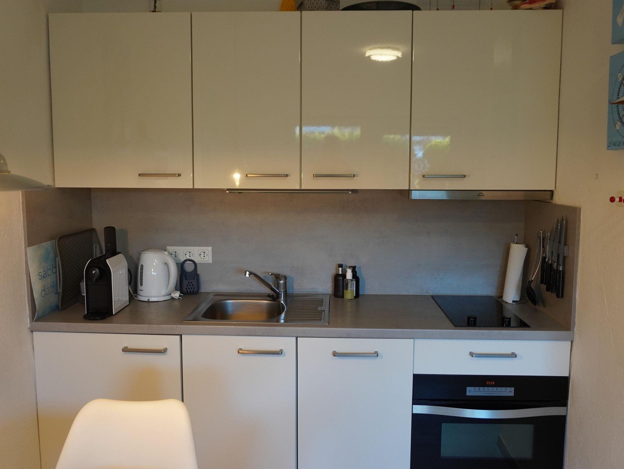 In unserem kleinen, aber geräumigen Appartement ( Grundsaniert 2019 ) finden Sie eine Wohnküche mit komplett eingerichteter Küchenzeile (mit 2-Platten-Herd), einen Esszimmertisch mit Stühlen, sowie ein Schlafsofa vor dem großen Fernseher. In dem liebevoll eingerichteten Schlafzimmer finden Sie zwei einzelne Boxspringbetten (90x200 cm) sowie zwei unterschiedlich große Kleiderschränke. Das Bad besteht aus einer flachen Dusche, Waschbecken wie auch WC. Des Weiteren gibt es einen Flur mit Garderobe sowie ein Abstellkämmerchen.
