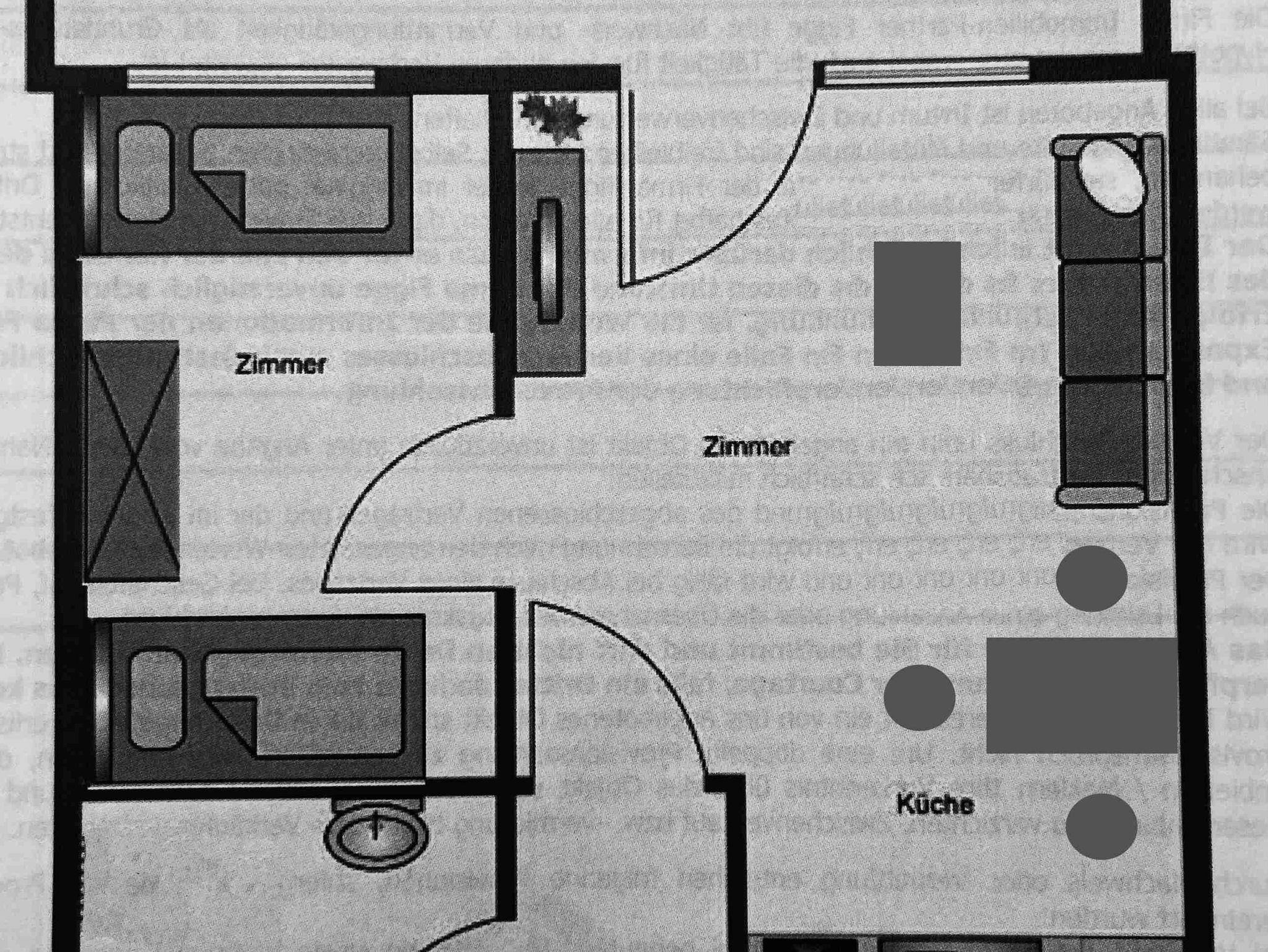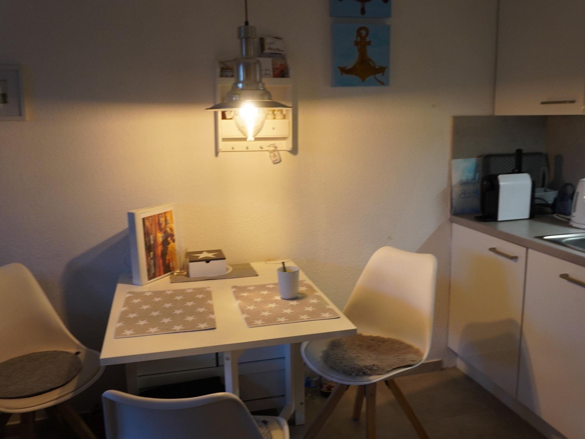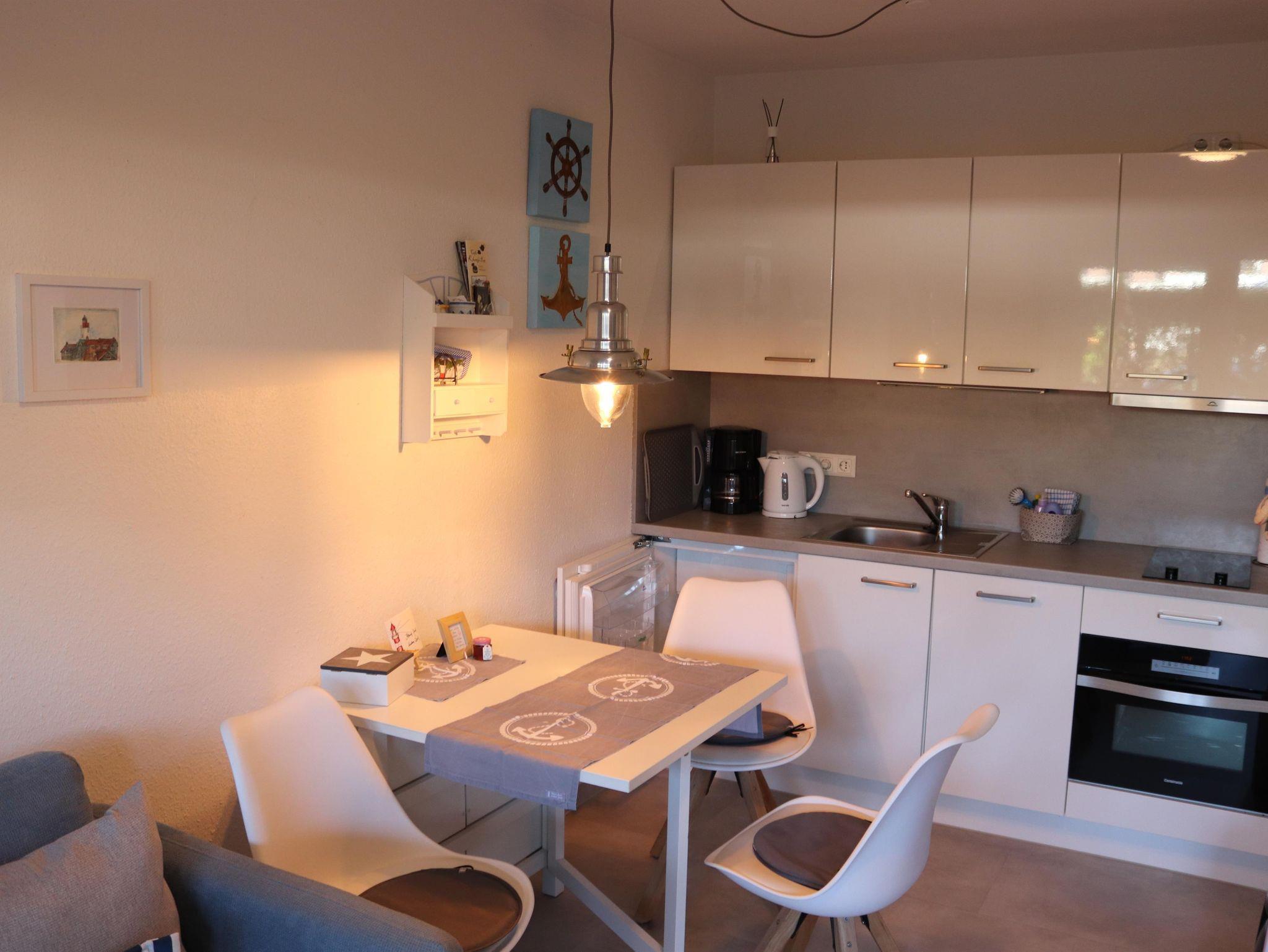 In unserem kleinen, aber geräumigen Appartement ( Grundsaniert 2019 ) finden Sie eine Wohnküche mit komplett eingerichteter Küchenzeile (mit 2-Platten-Herd), einen Esszimmertisch mit Stühlen, sowie ein Schlafsofa vor dem großen Fernseher. In dem liebevoll eingerichteten Schlafzimmer finden Sie zwei einzelne Boxspringbetten (90x200 cm) sowie zwei unterschiedlich große Kleiderschränke. Das Bad besteht aus einer flachen Dusche, Waschbecken wie auch WC. Des Weiteren gibt es einen Flur mit Garderobe sowie ein Abstellkämmerchen.