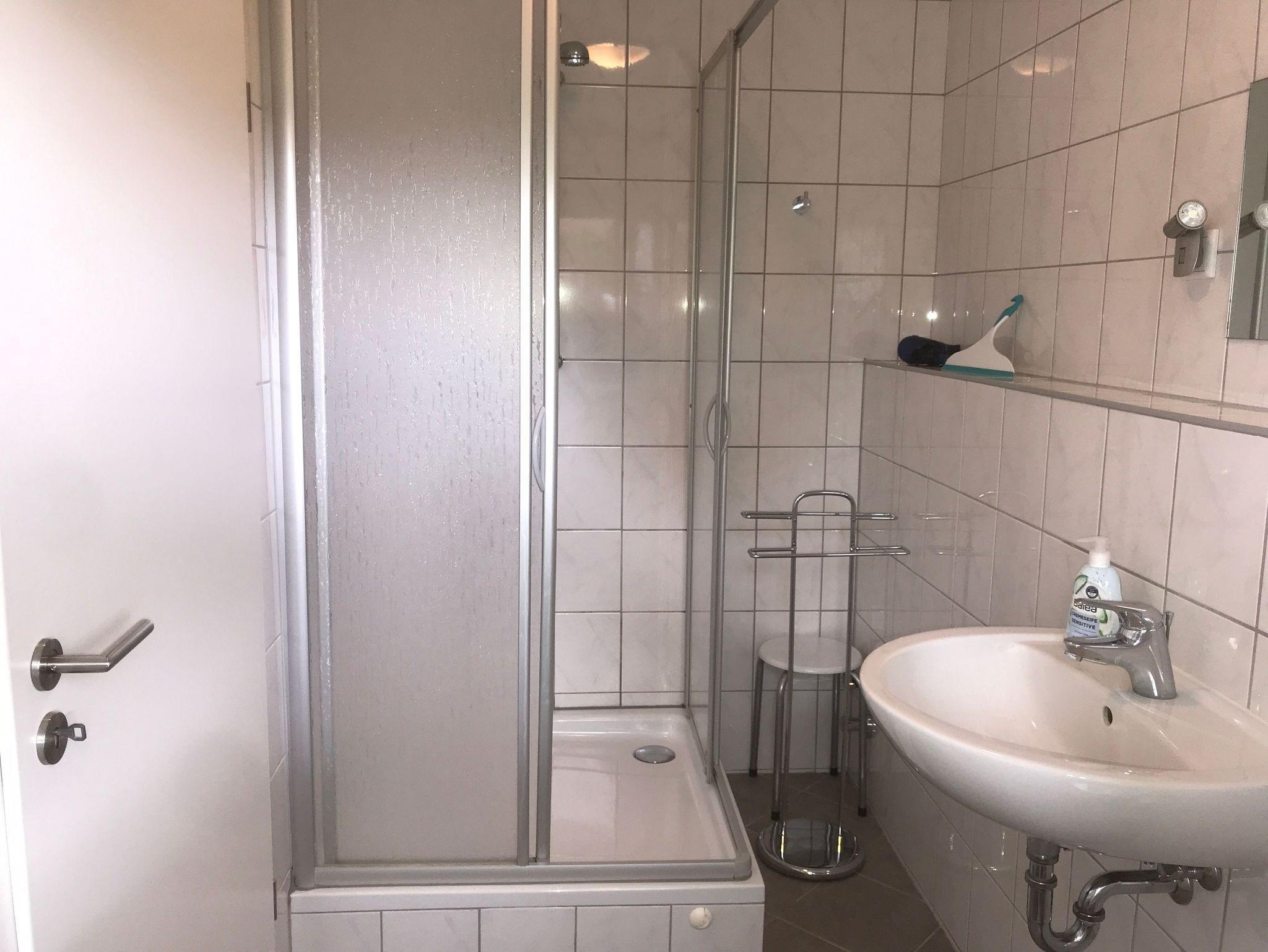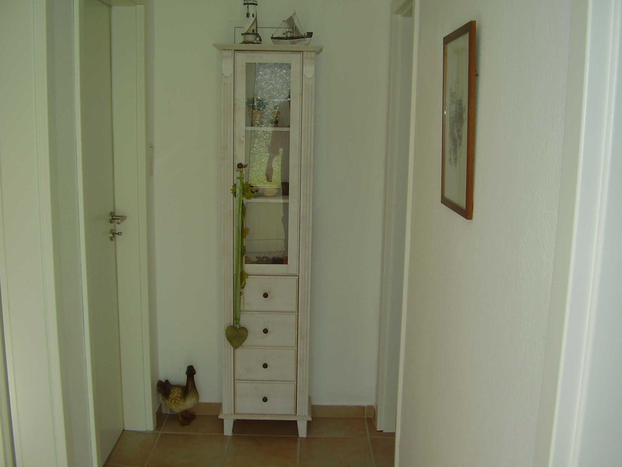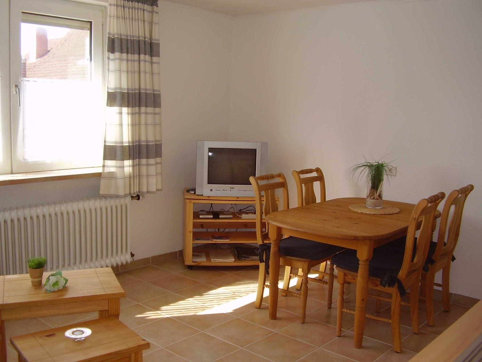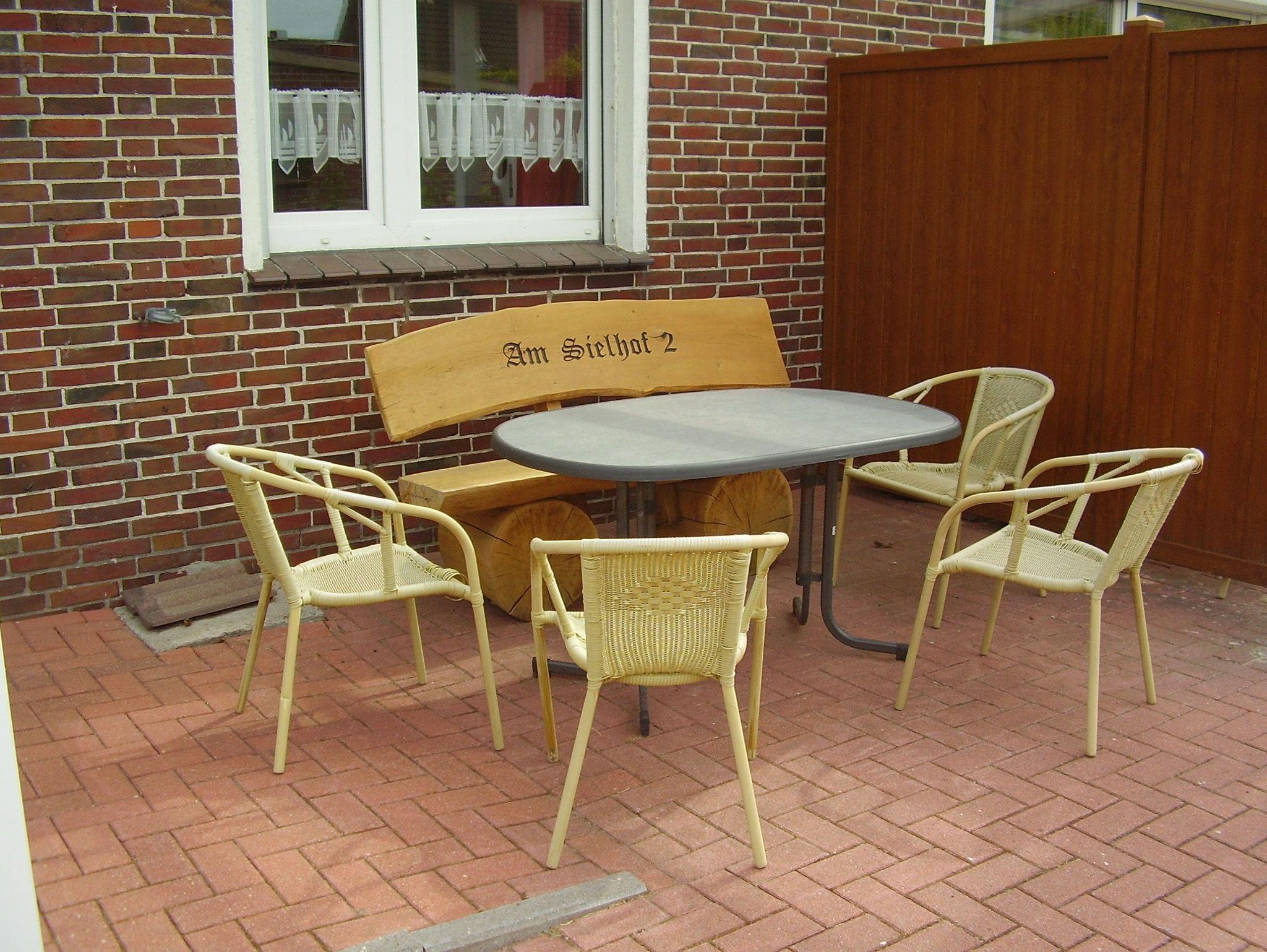 Erdgeschoss Ferienwohnung mit Glas überdachter überdachter Terrasse und Garten mit Kamingrill im Nordseebad Dornumersiel für bis zu drei Personen. Die Fussböden sind gefliest und die Fenster sind mit Rollladen ausgestattet. Die Wohnung verfügt über ein Tageslichtbadezimmer.