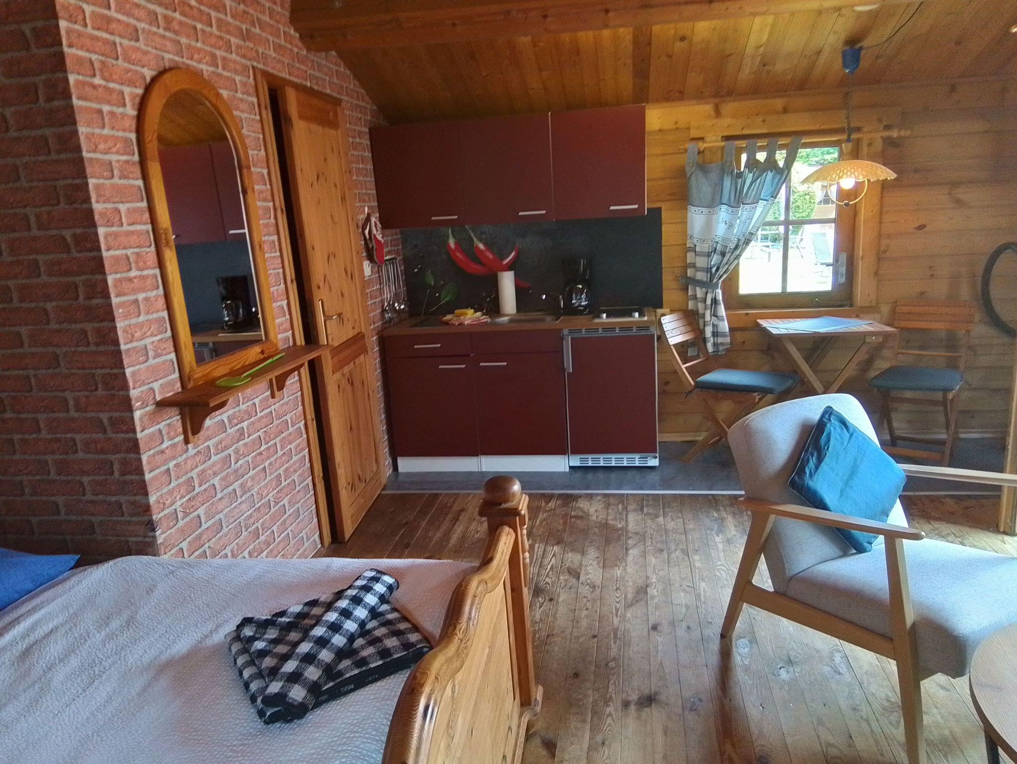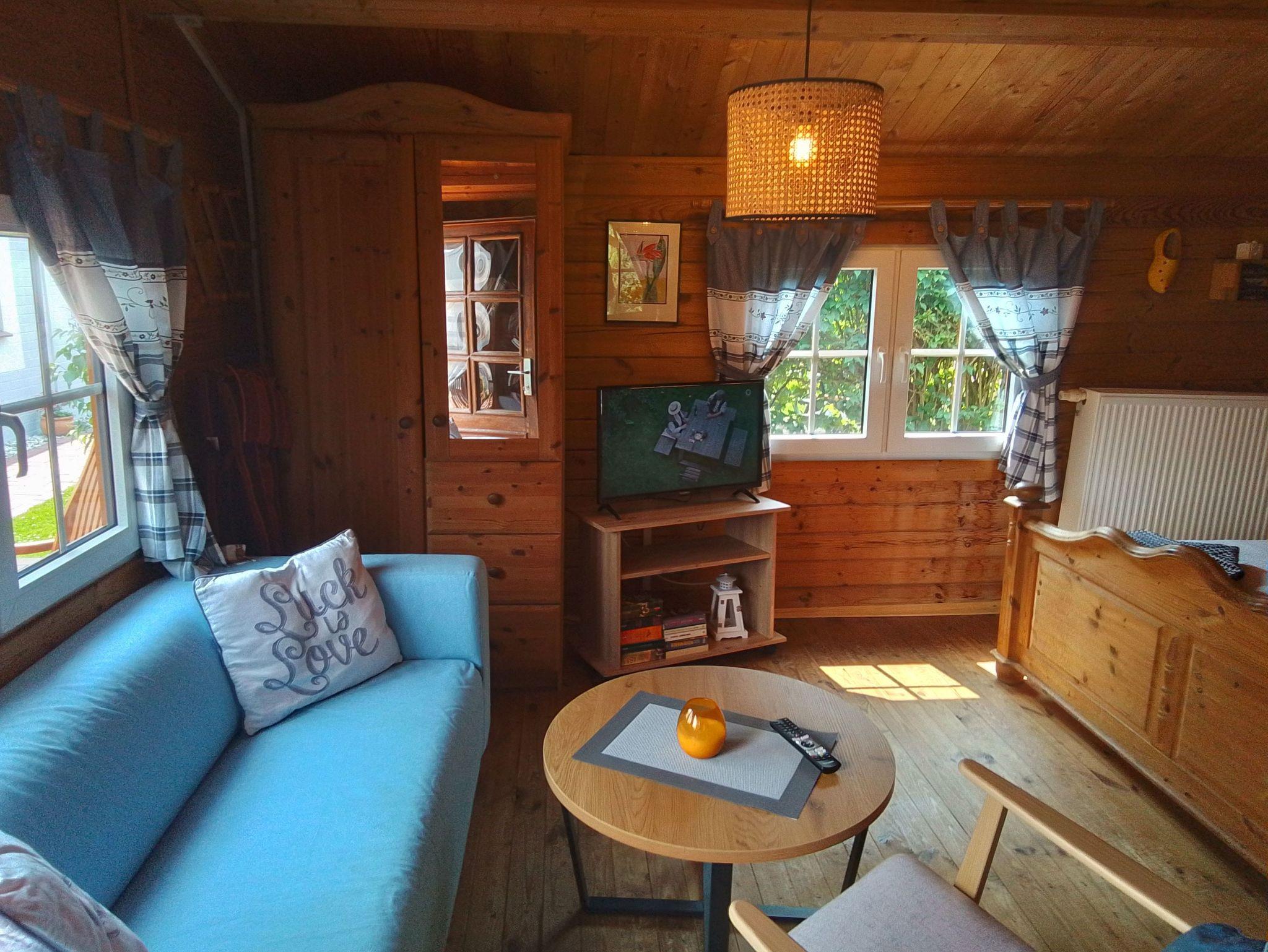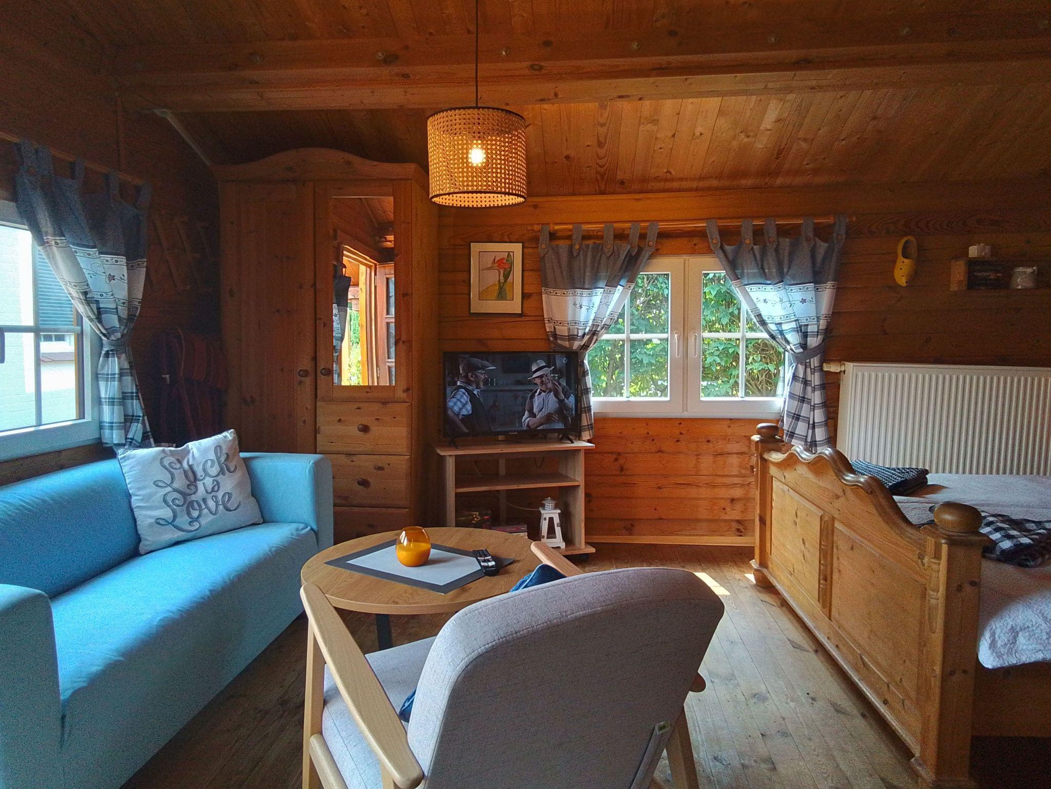 Ein zauberhaftes Blockhaus mit Flair, liebevoll eingerichtet und ausgestattet mit kombiniertem Wohn-/Schlafraum mit urgemütlichem, großem Doppelbett 1,6 x 2 Meter, Kleiderschrank, eine bequeme Sitzcouch und Sessel, runder Couchtisch, ein Esstisch mit 2 Stühlen, ein Flatscreen-Sat-TV inkl. Radioprogrammen. WLAN.,