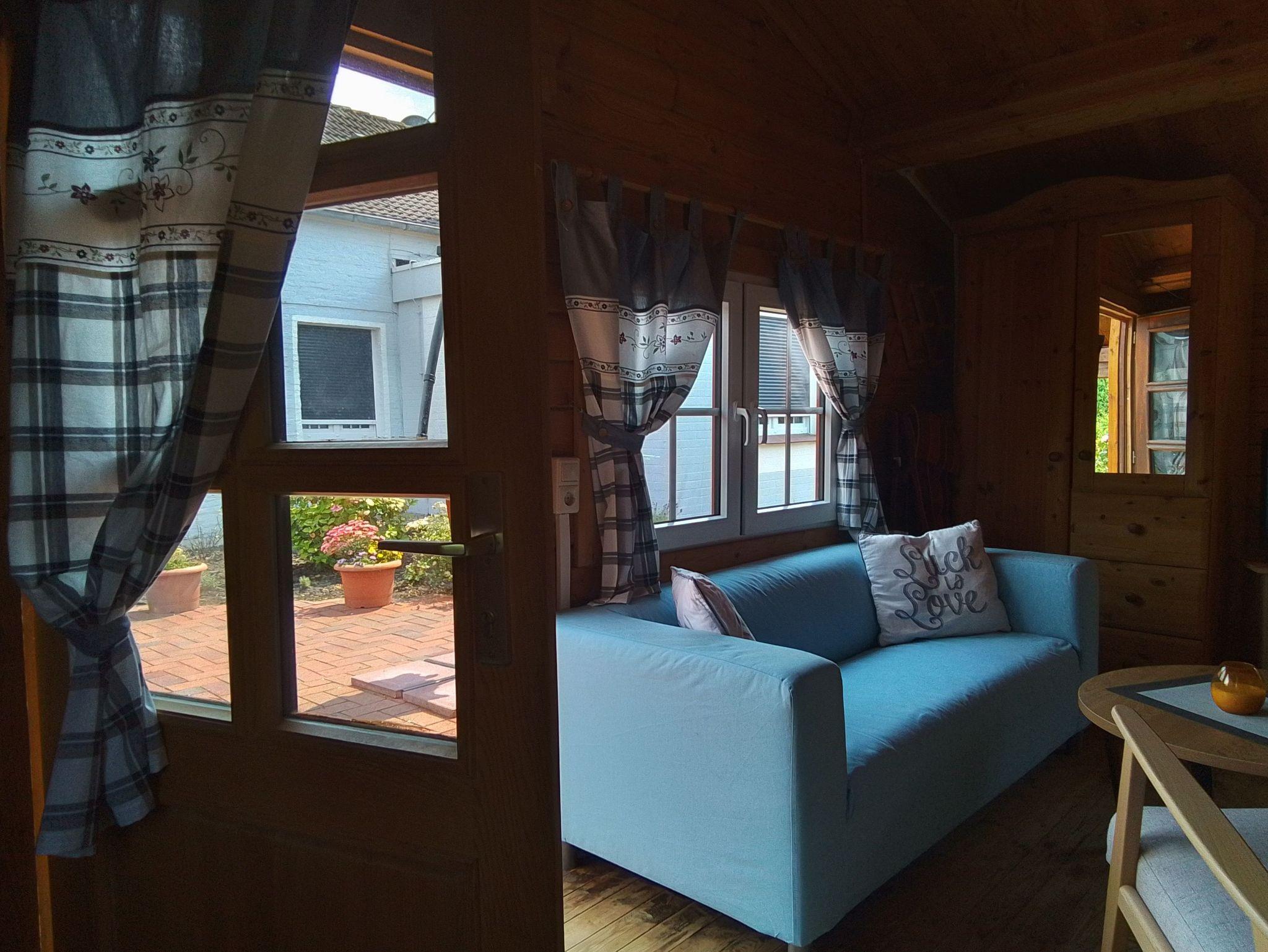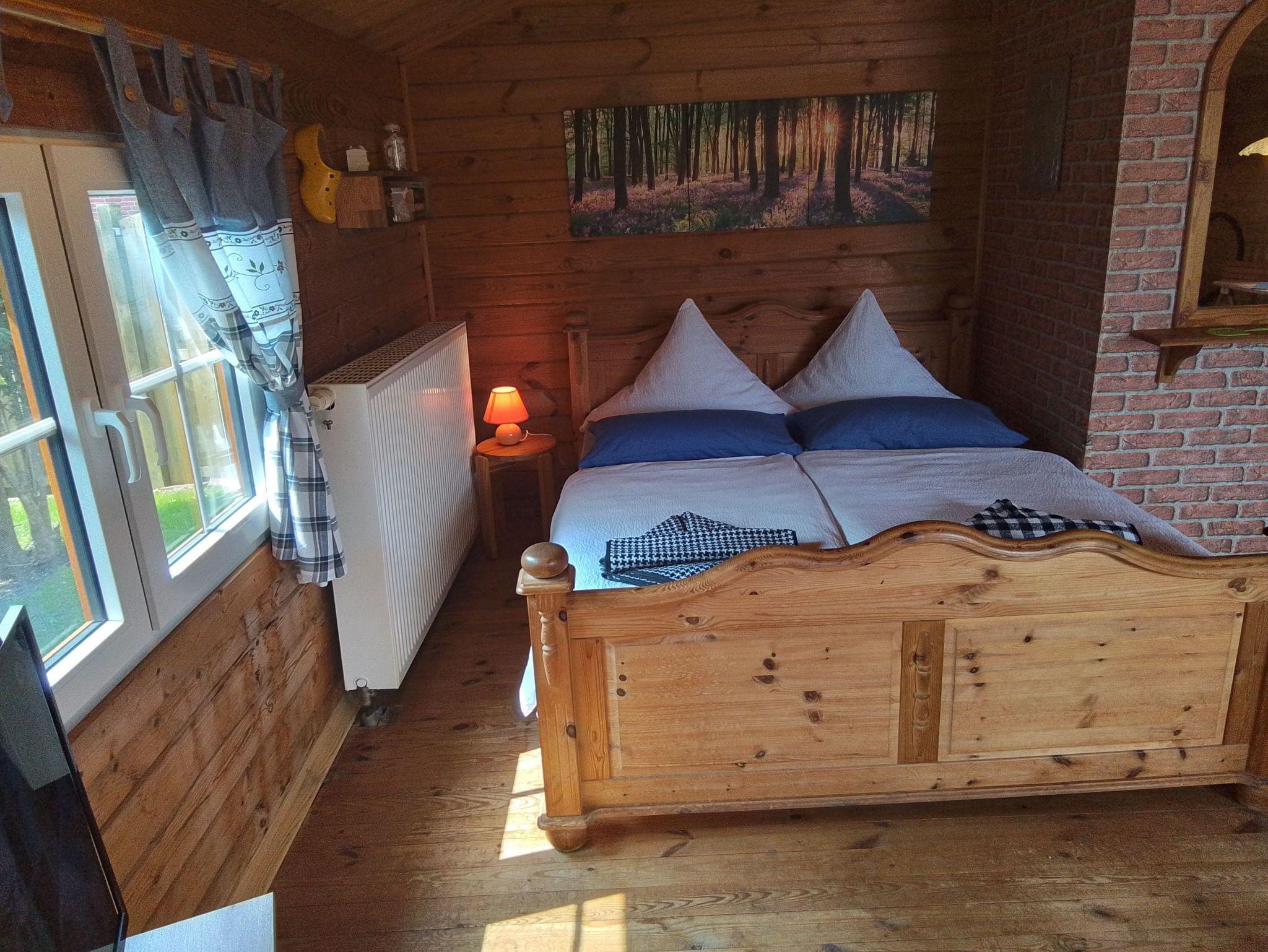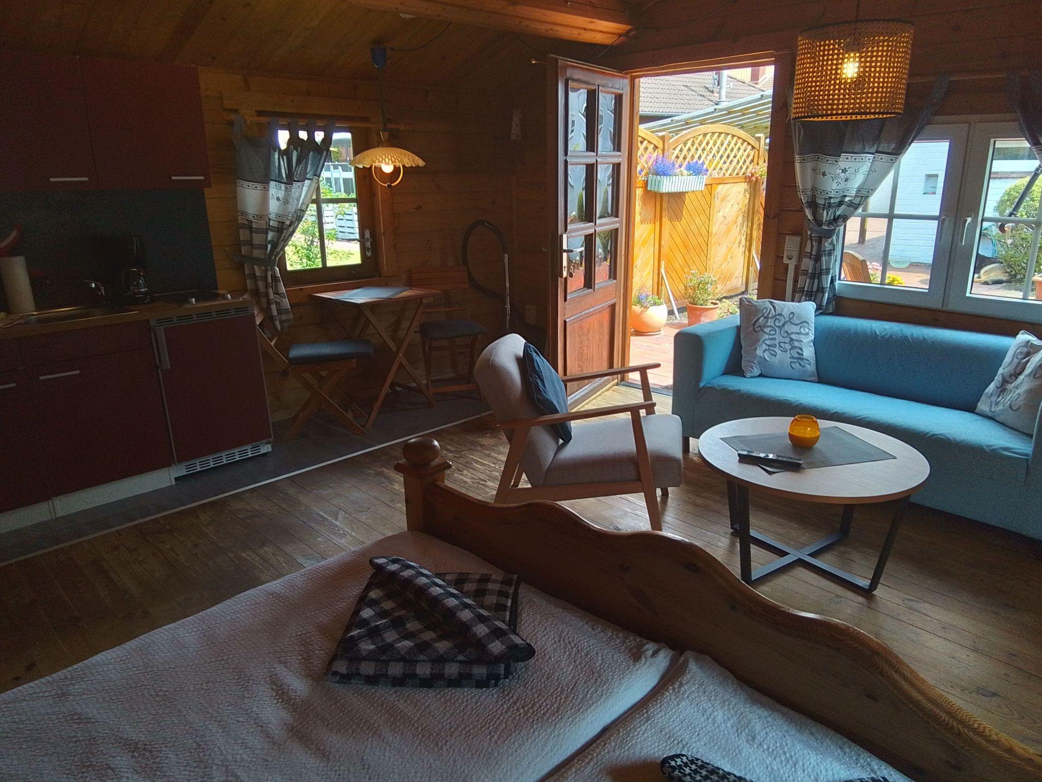 Ein zauberhaftes Blockhaus mit Flair, liebevoll eingerichtet und ausgestattet mit kombiniertem Wohn-/Schlafraum mit urgemütlichem, großem Doppelbett 1,6 x 2 Meter, Kleiderschrank, eine bequeme Sitzcouch und Sessel, runder Couchtisch, ein Esstisch mit 2 Stühlen, ein Flatscreen-Sat-TV inkl. Radioprogrammen. WLAN.,