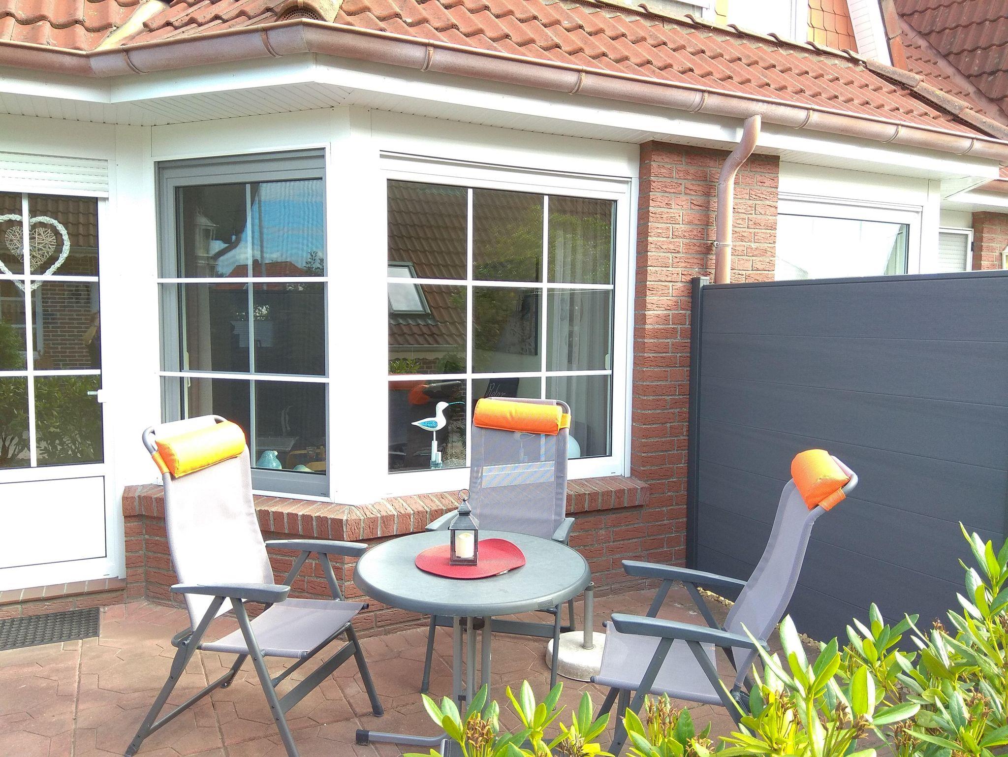 Auf der Terrasse mit Gartenmöbeln, Sonnenschirm und Grill können Sie den Tag ausklingen und die Seele baumeln lassen.