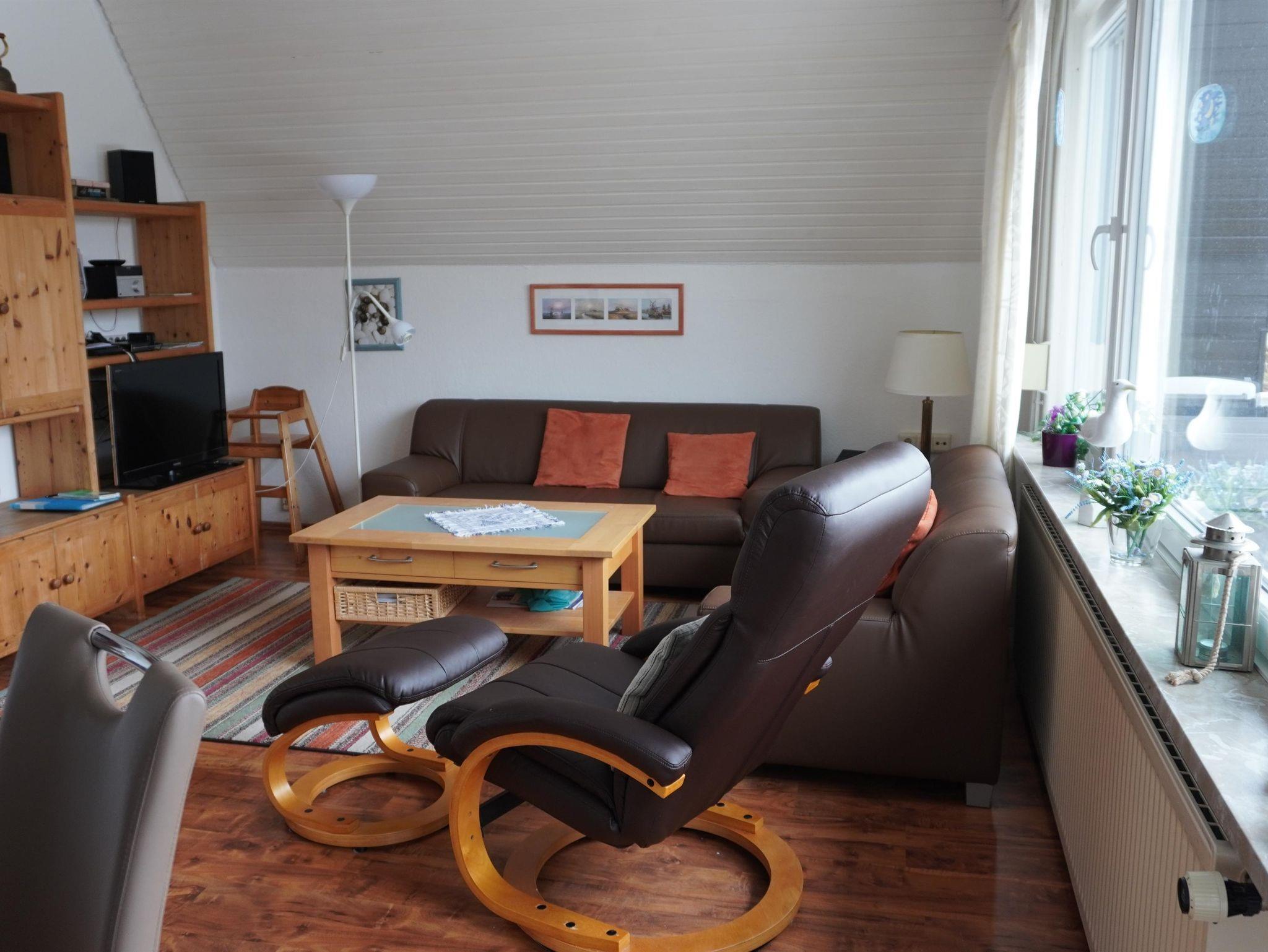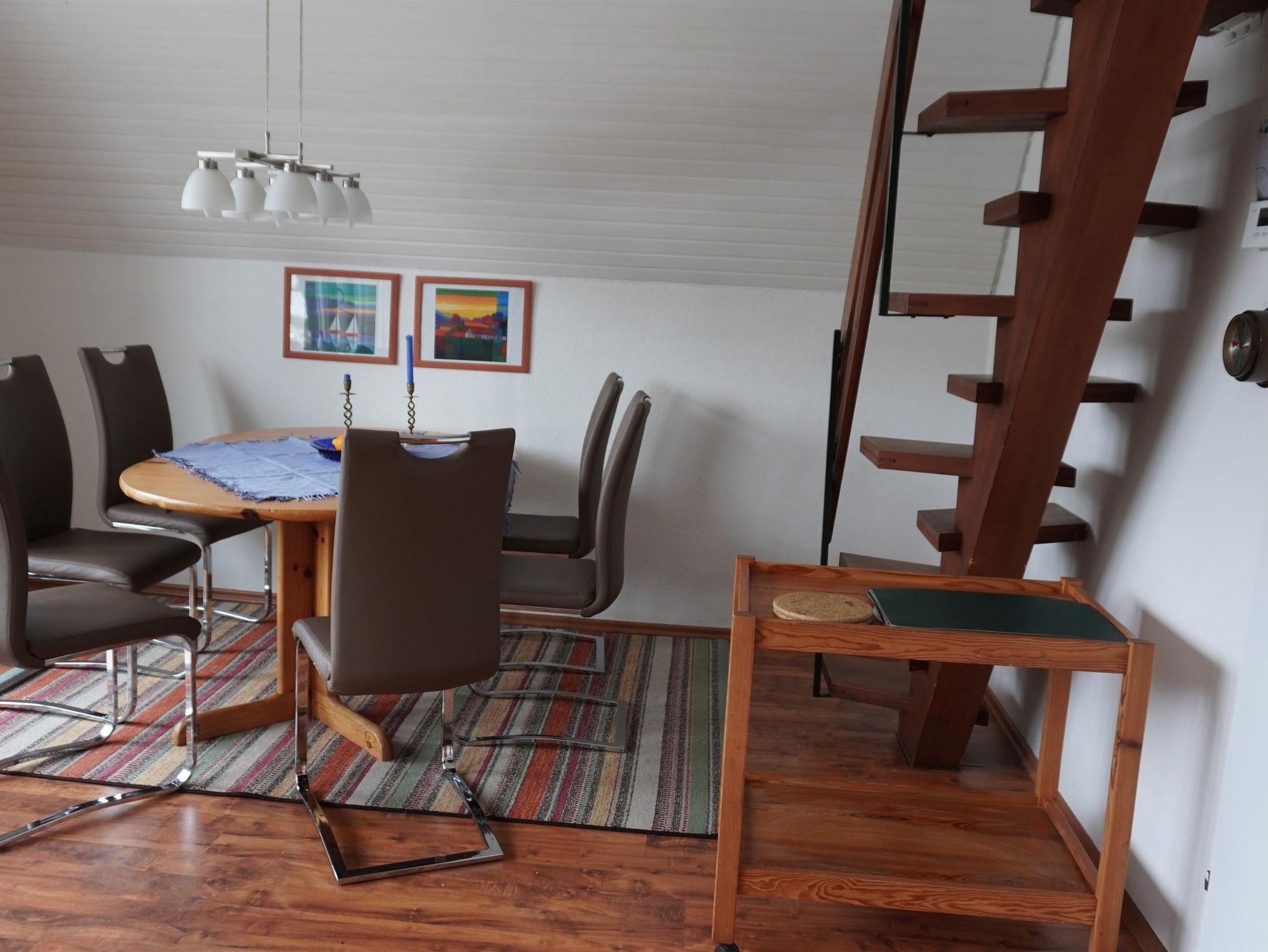 Im Erdgeschoss befindet sich ein gemütlich eingerichtetes Wohn-/Esszimmer mit Stereoanlage u. Sat-TV, eine komplett eingerichtete Küche mit Geschirrspülmaschine und Mikrowelle, ein Schlafzimmer (Doppelbett) sowie ein Bad mit Dusche/WC. Im Obergeschoss, welches Sie über eine leicht steile Treppe erreichen, stehen 2 weitere Schlafdomizile (Doppel u. Zweibettzimmer) zur Verfügung. Auf unsere kleinen Gäste warten ein Hochstuhl und ein Reisebett. Eine Kindersicherung am Treppenabgang ist vorhanden.