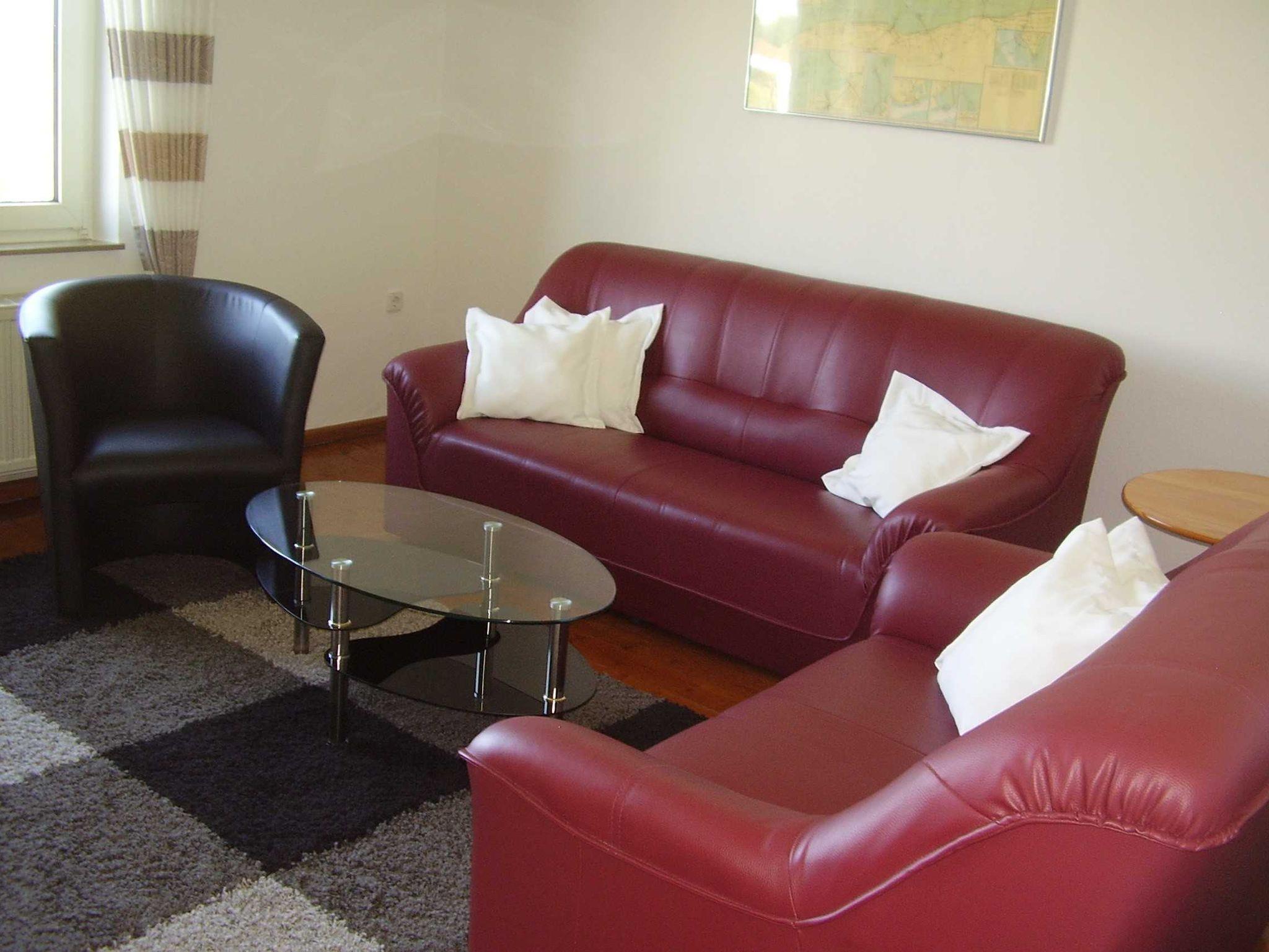 Wohnzimmer mit gemütlicher Sitzgruppe und Flachbild-TV.