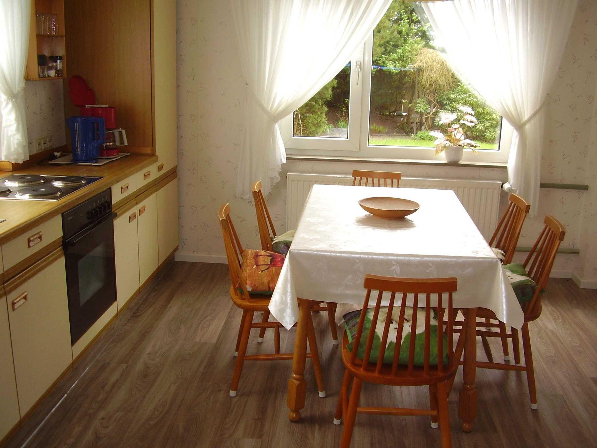 Separate Küche mit Einbauküche mit 4 Plattenherd mit Backofen, Kühlschrank und allen erforderlichen Elektrogeräten, etc. und Esstisch mit Bestuhlung.