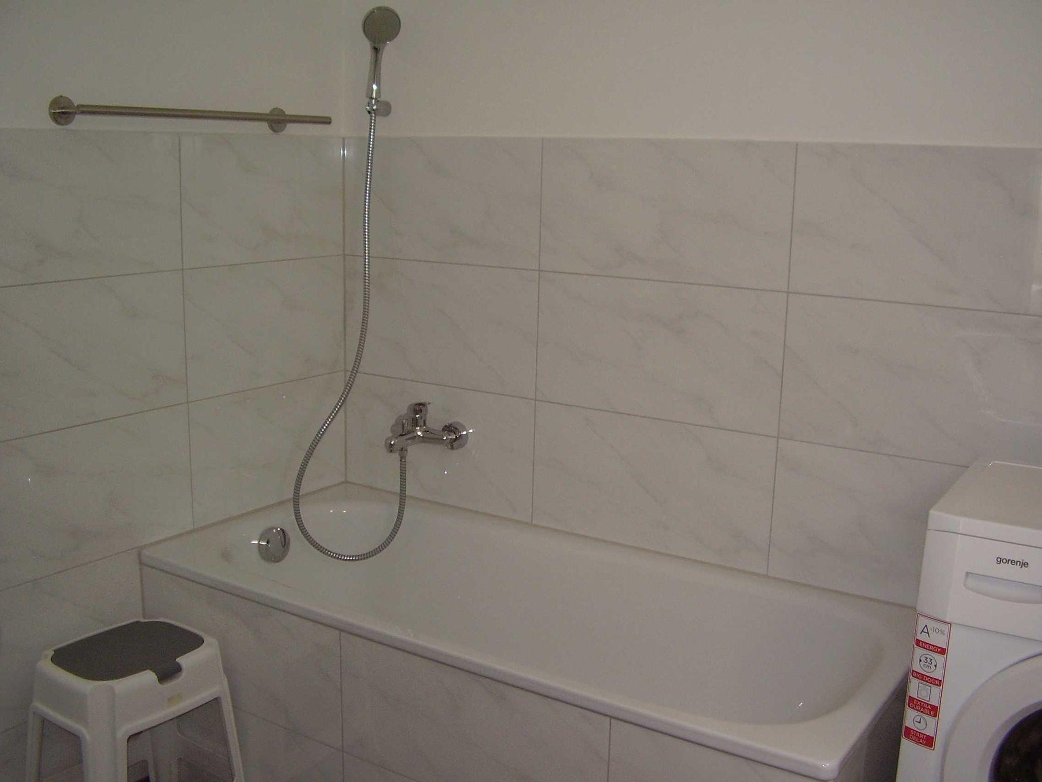Badezimmer mit Badewanne, WC und Waschmaschine.
