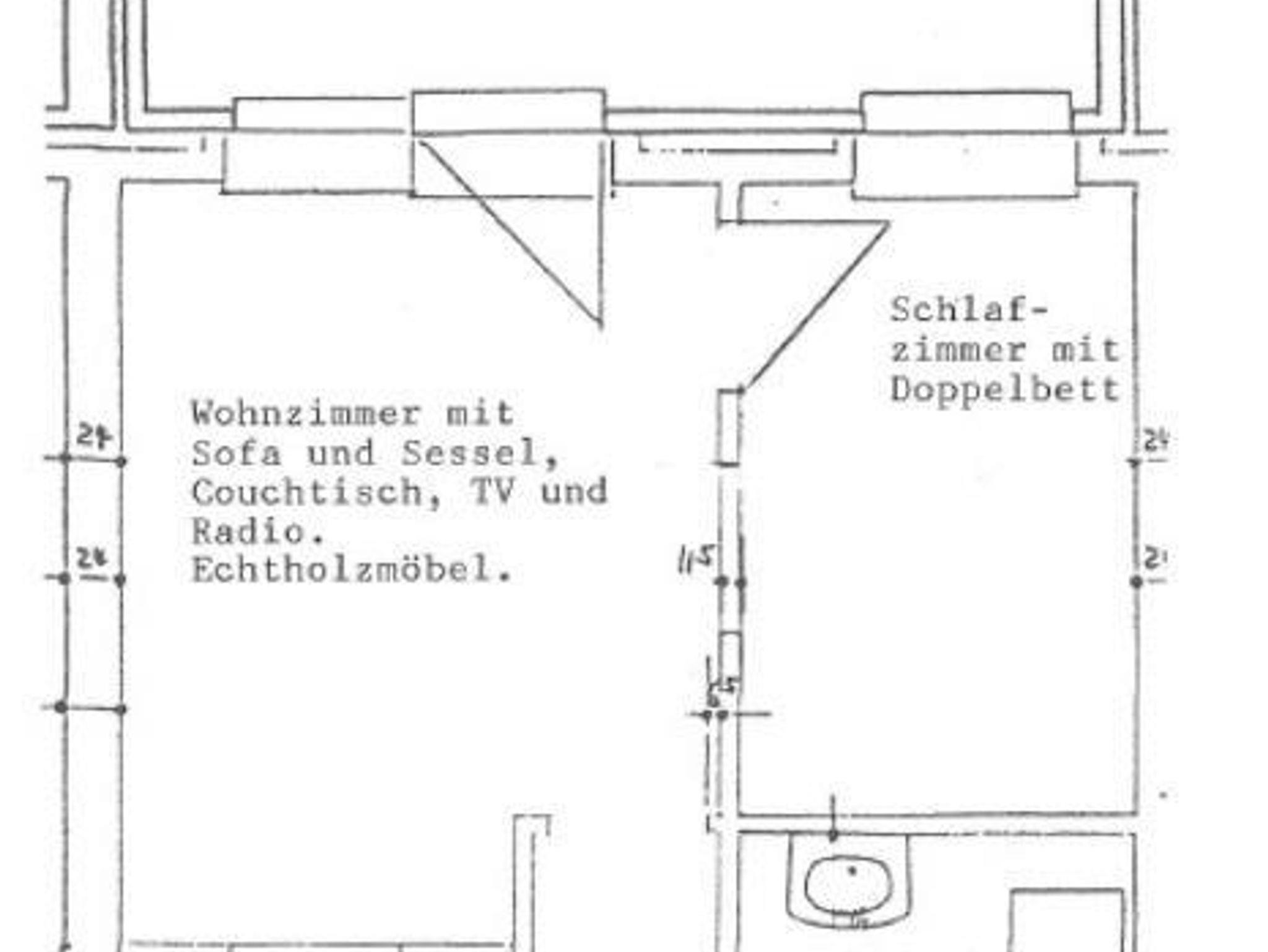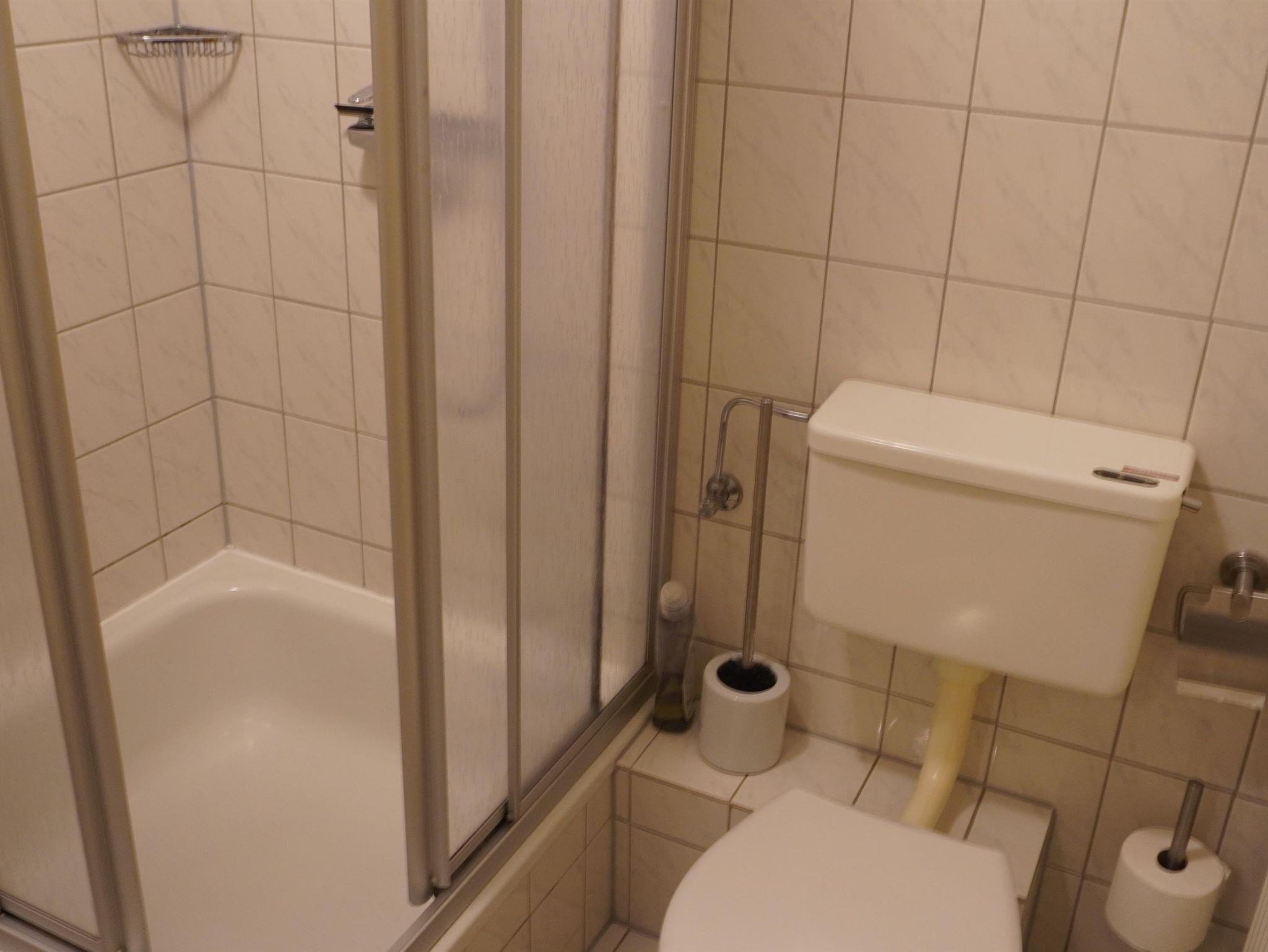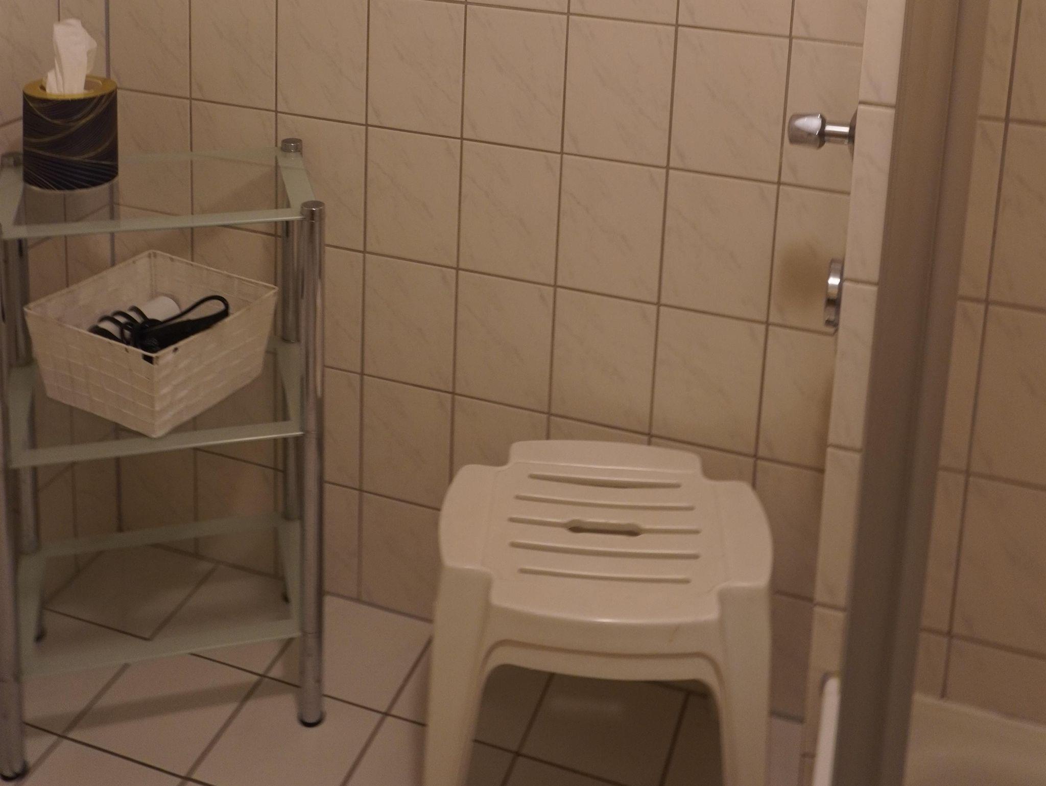 Im Bad befindet sich eine Dusche mit Sitzstuhl sowie das WC und Waschbecken.