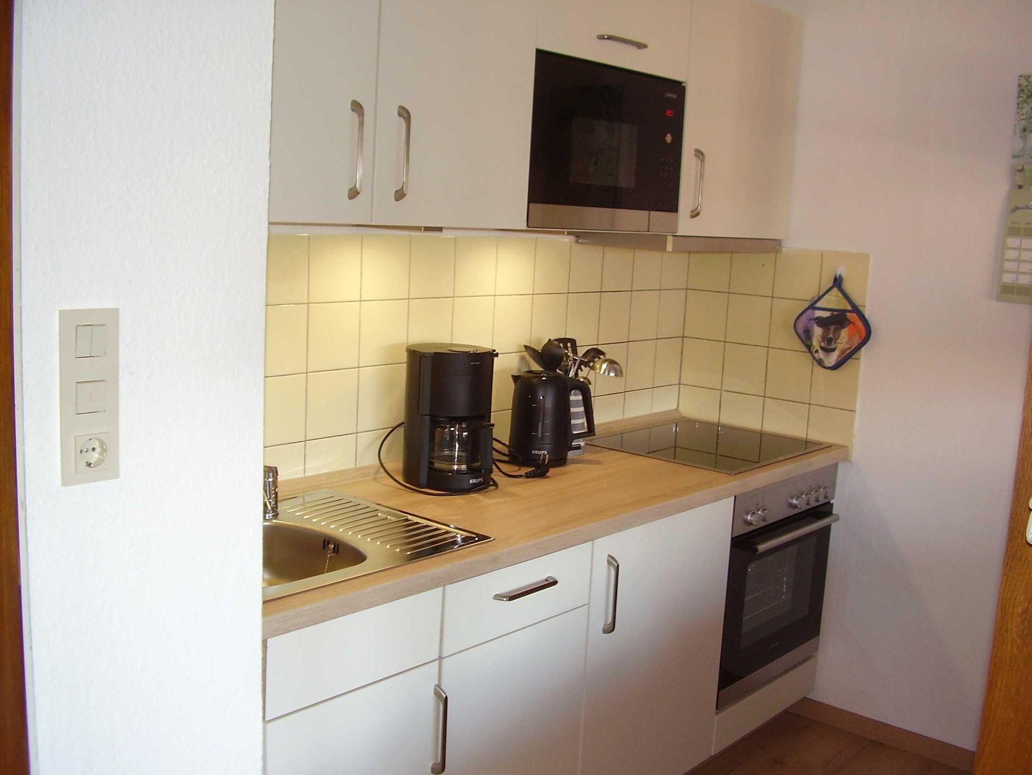 Offener Wohn- und Essbereich mit Wohnlandschaft, Flachbild-TV, Radio und Esstisch mit Bestuhlung. Die Einbauküche ist durch einen offenen Raumteiler abgetrennt und verfügt über einen Vier-Plattenherd mit Ceranfeld und mit Backofen, Spülmaschine, Kühlschrank mit Gefrierfach, Kaffeemaschine, Wasserkocher, etc. und selbstverständlich auch über ausreichend Geschirr und Küchengeräte.