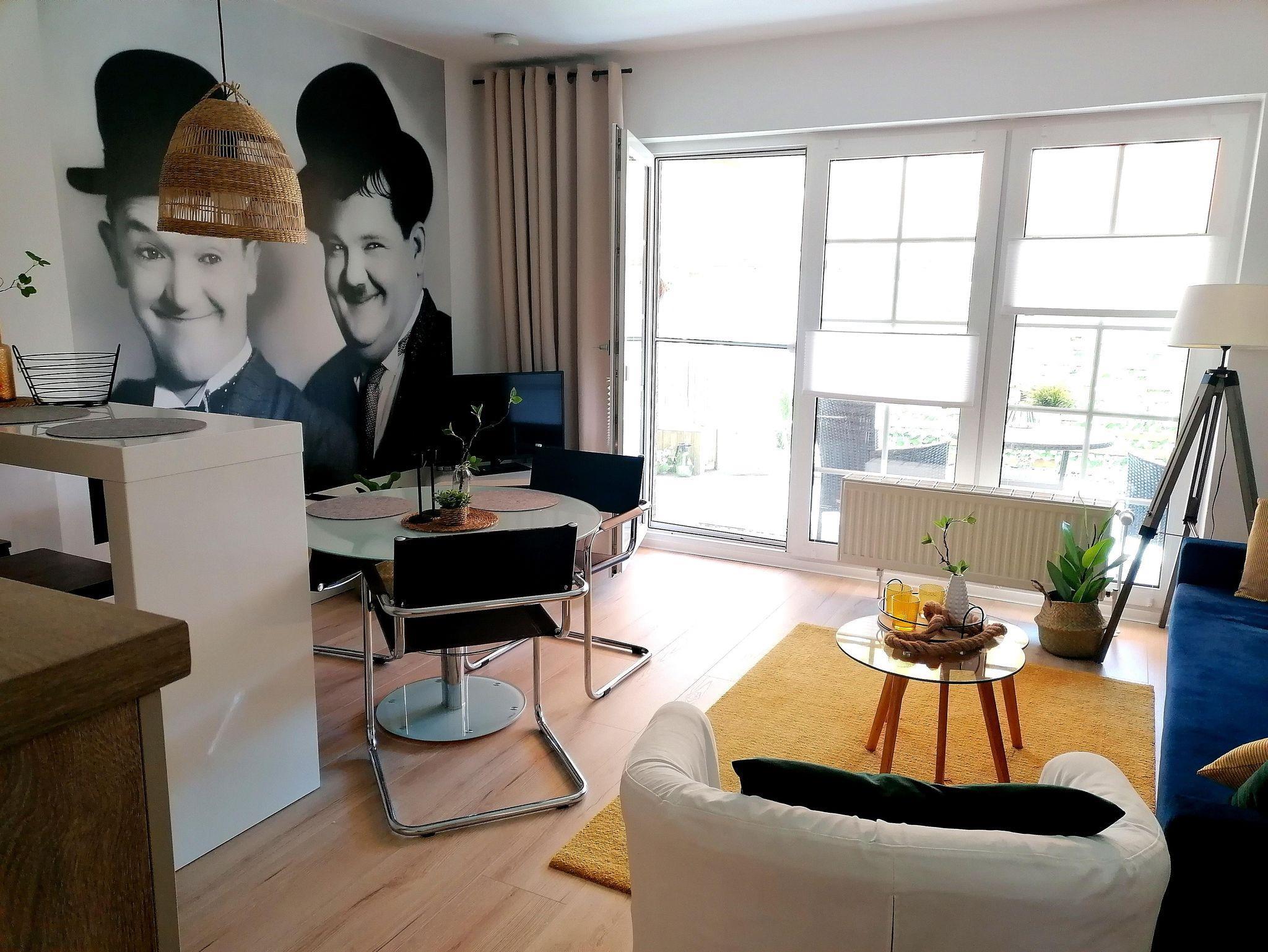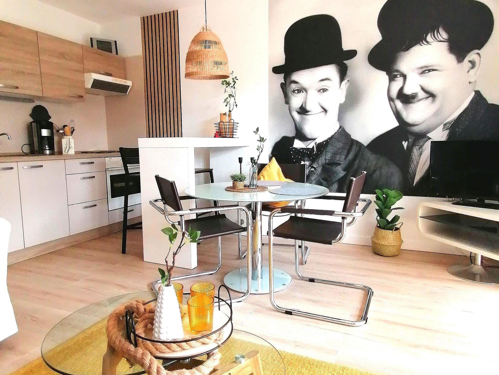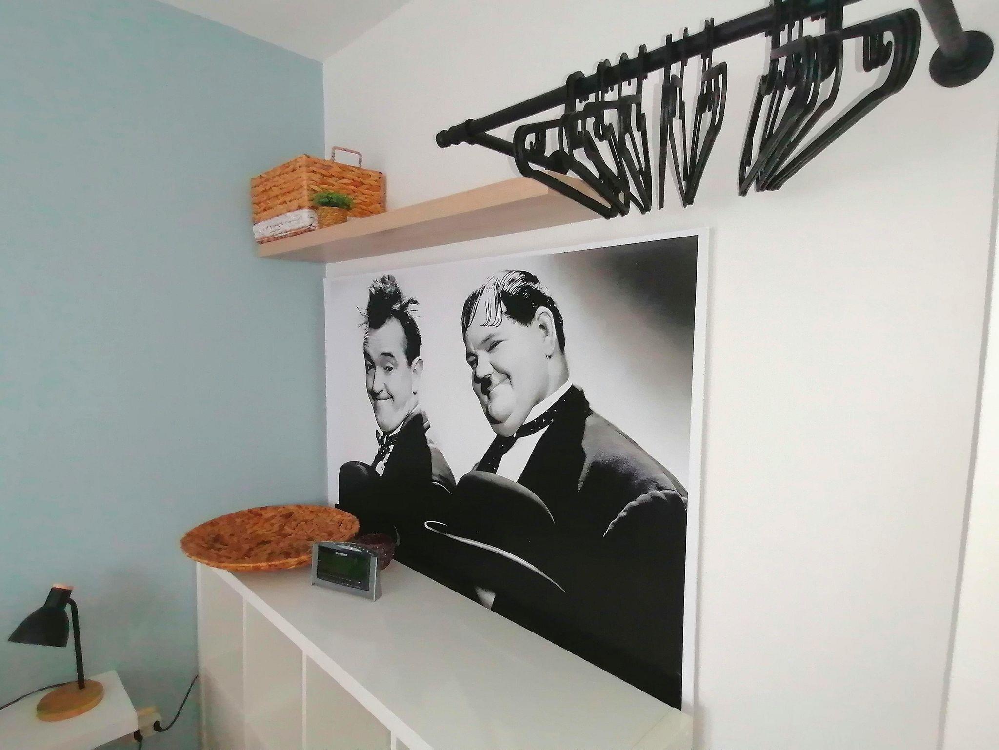 Starten Sie Ihren Tag mit einem Lächeln: Im Schlafzimmer begrüßen Sie „Stan & Oli“ – charmante Wandbilder der berühmten Komiker – während die ersten Sonnenstrahlen durch das Fenster blinzeln.