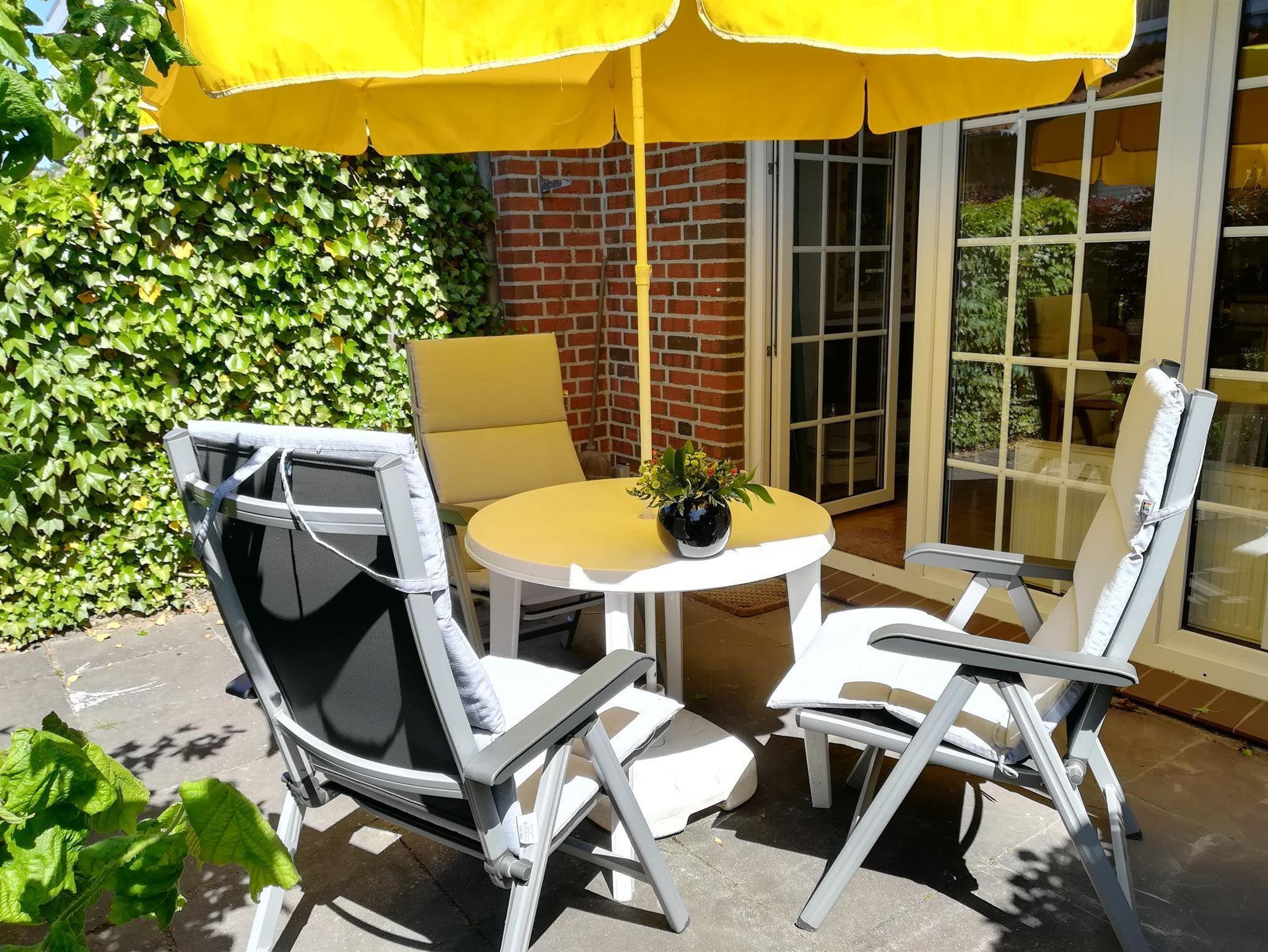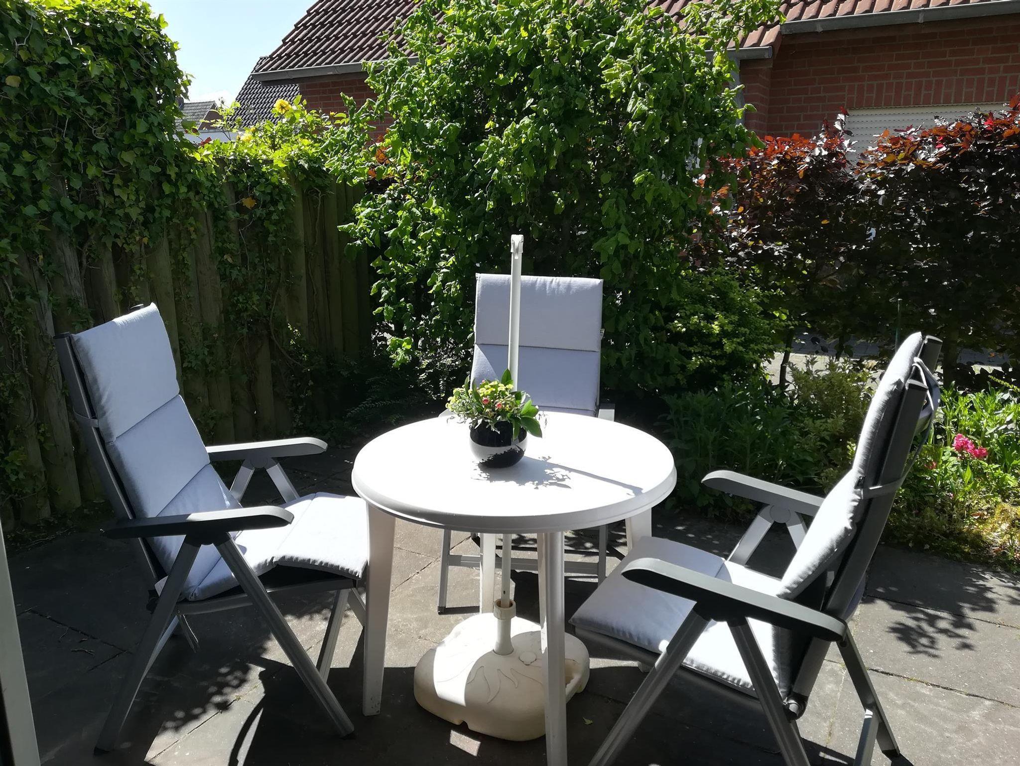 Unsere Ferienwohnung befindet sich in ruhiger Lage im Erdgeschoss eines kleinen Appartementhauses. Die Terrasse ist zum Westen ausgerichtet und lädt mit seinen Gartenmöbeln und Sonnenliegen zum Verweilen ein. Um sich vor der Sonne zu schützen, werden Sie auf unserer Terrasse einen Sonnenschirm vorfinden. Ein PKW-Einstellplatz befindet sich direkt am Haus. Ihre mitgebrachten Fahrräder findet Platz in einem separaten Abstellraum.