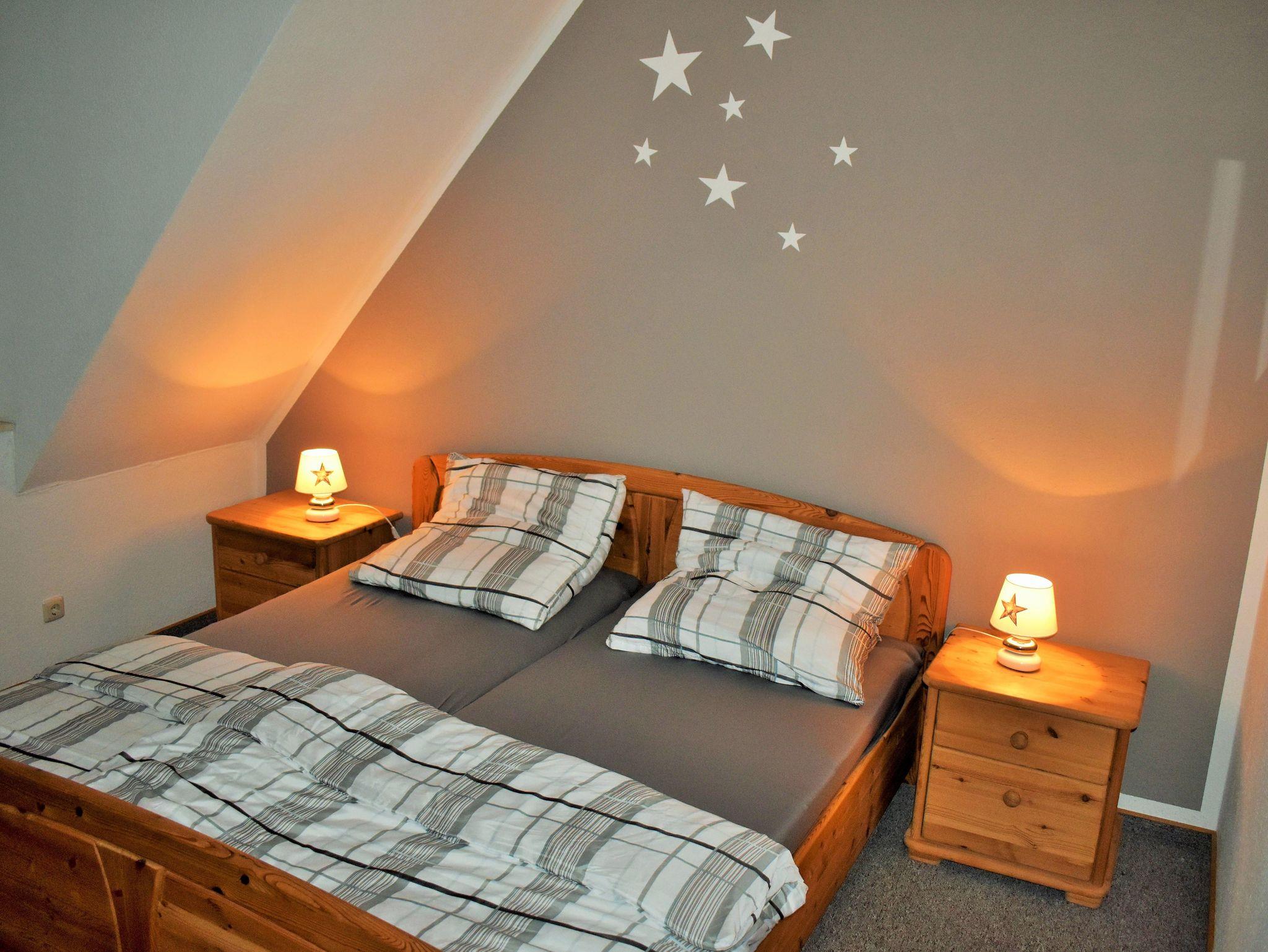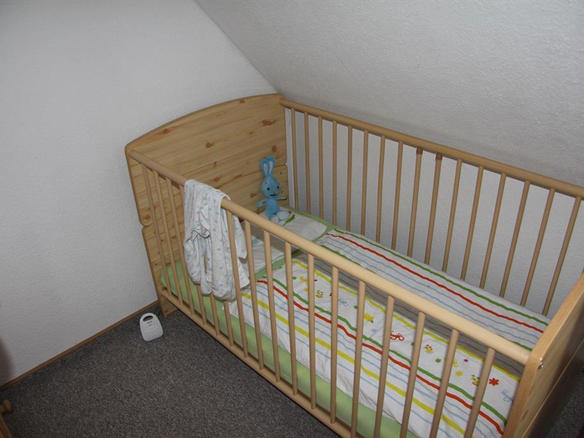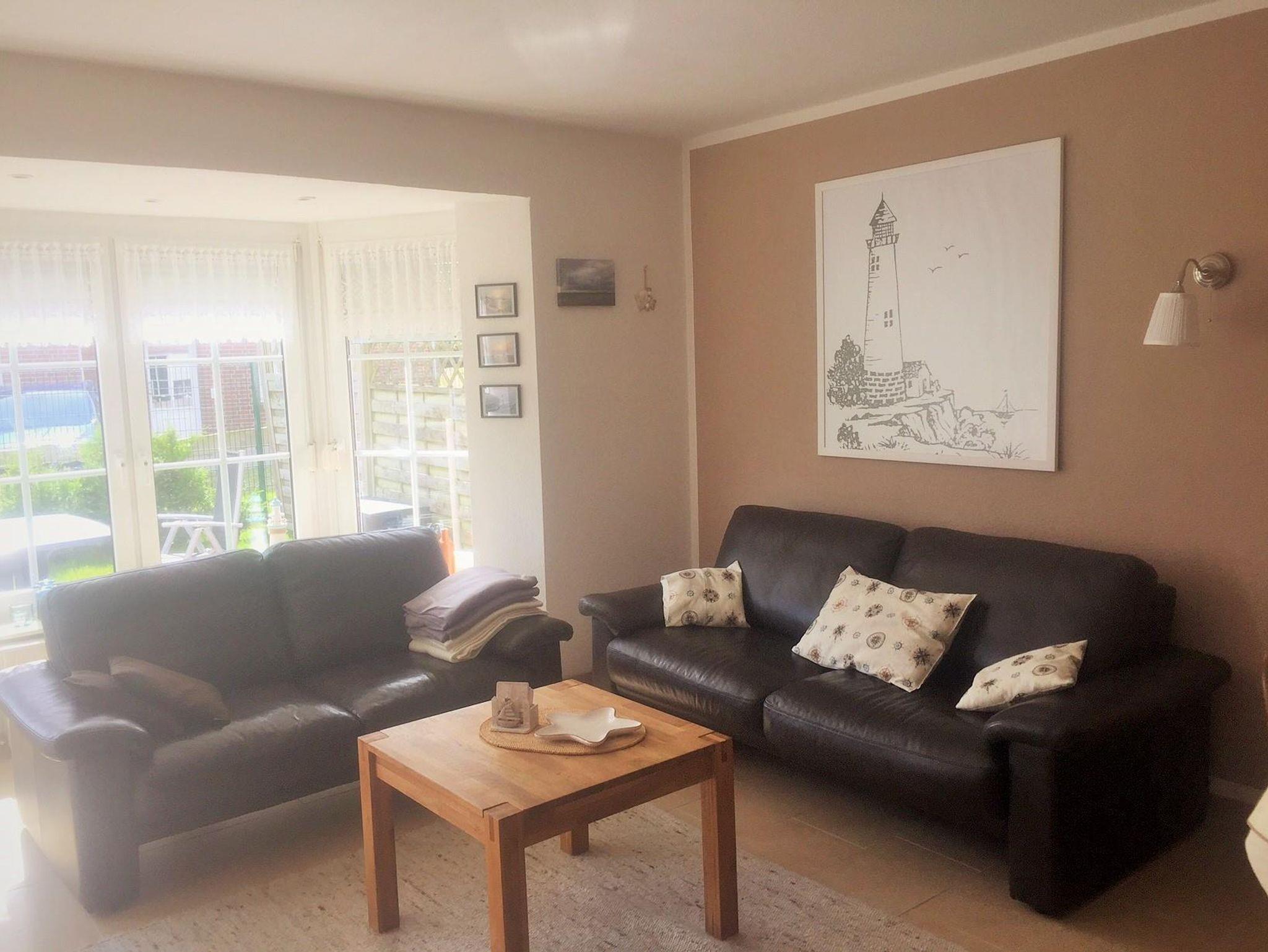 Im Erdgeschoss unserer Unterkunft befinden sich der Wohnbereich, die Küche und ein Gäste-WC. Das lichtdurchflutete Wohnzimmer verfügt neben der Couch, dem Essbereich, dem Fernseher auch über einen DVD-Player, einer Stereoanlage und einer X-Box. Einige Filme, Spiele und Bücher sind auch vorhanden. Die Küche ist komplett ausgestattet und hat eine Filter- und eine Pad-Kaffeemaschine. Im Obergeschoss befinden sich die Schlafzimmer und das Badezimmer. Ein Schlafzimmer besteht aus einem Doppelbett, Kleiderschrank und einem Kinderbett (bis 3 Jahre). Das andere Schlafzimmer aus zwei Einzelbetten und einem Kleiderschrank. Das Badezimmer hat eine Dusche sowie ein WC, Waschbecken, Spiegel und Fön. Unsere Waschmaschine kann auch gerne mitgenutzt werden.
