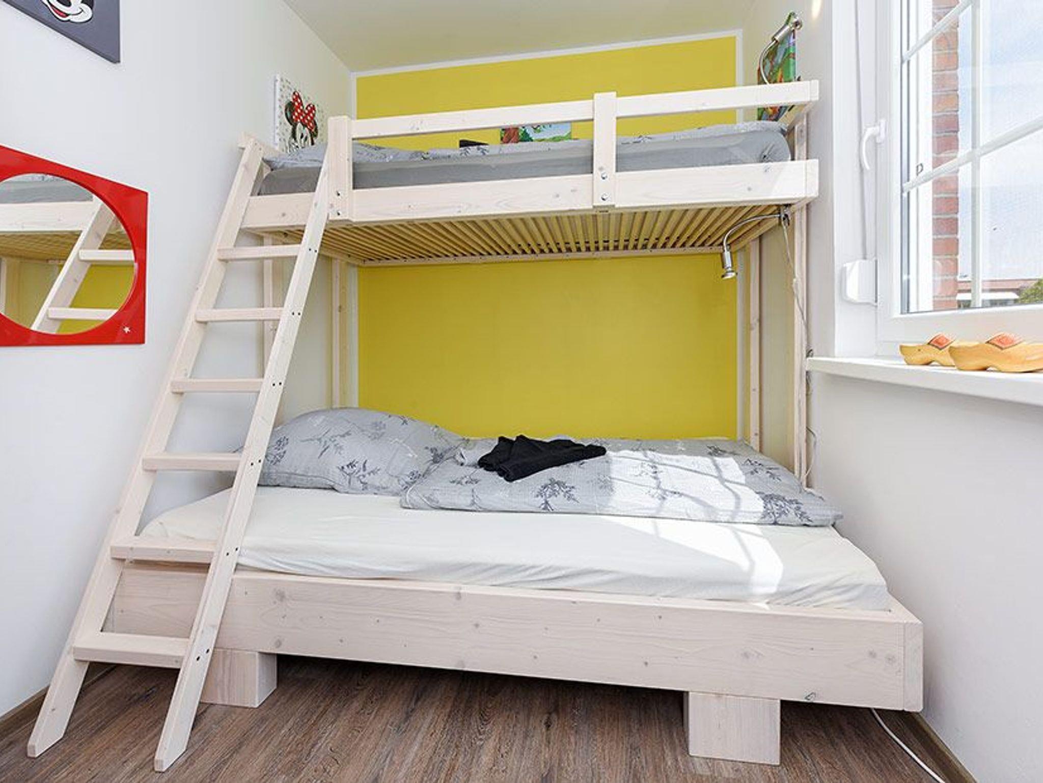 Bett im Kinderzimmer: Etagenbett aus Massivholz - auch für Erwachsene geeignet -: Größe 140 x 200 cm (unteres Bett) und 90 x 200 cm (oberes Bett)