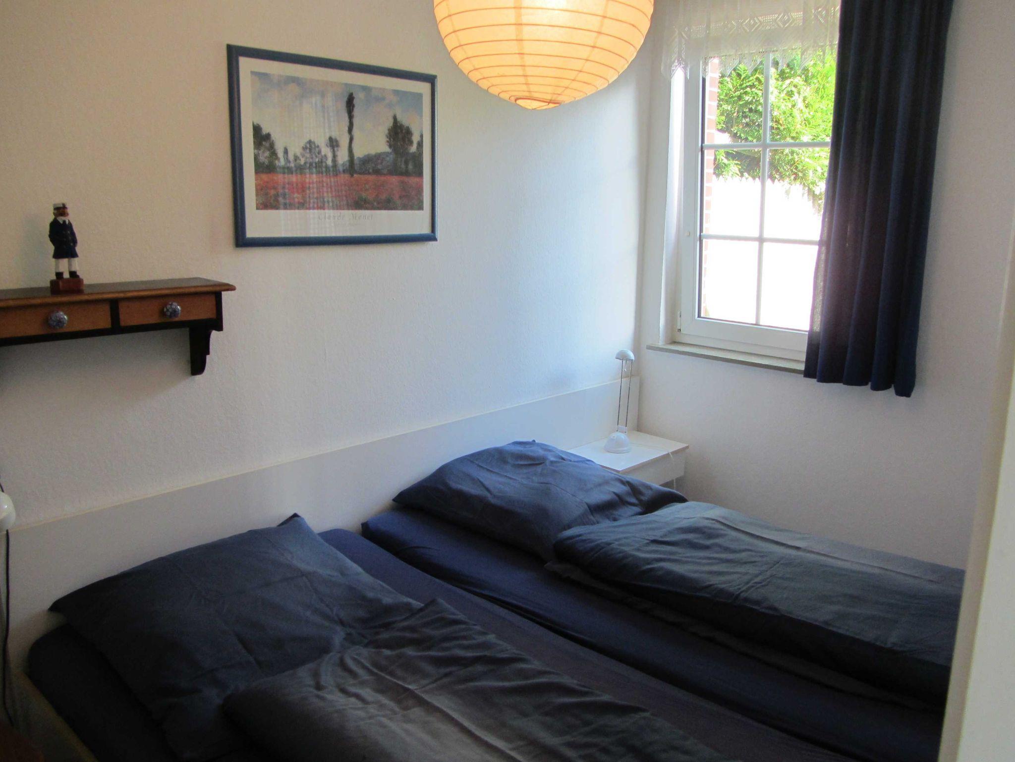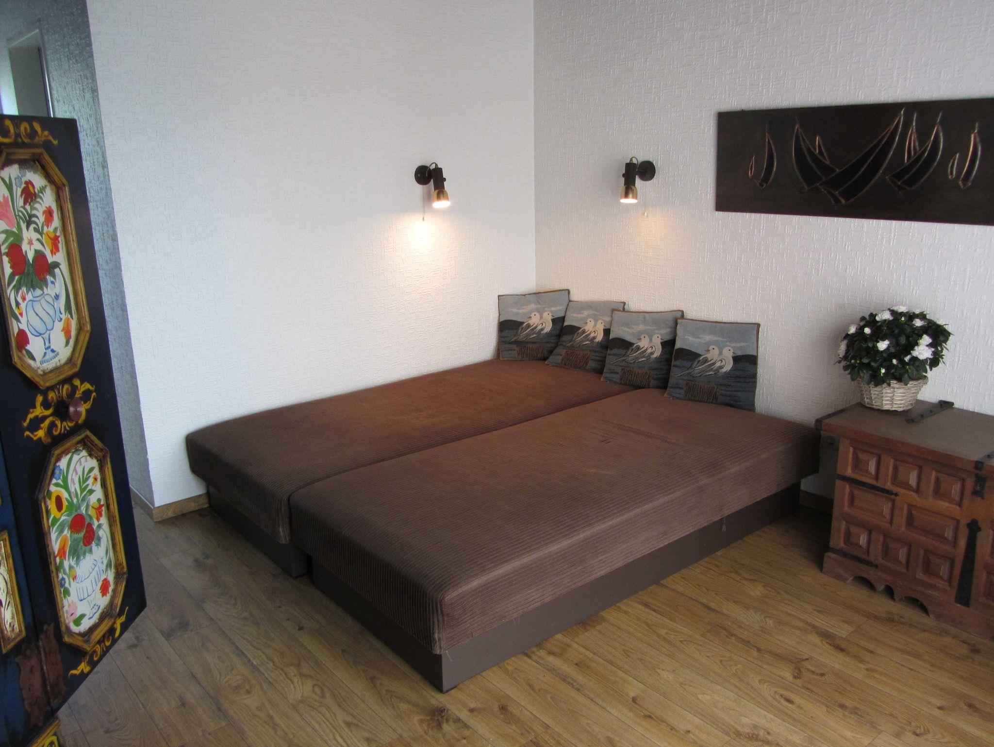Ein Schlafzimmer mit 2 Einzelbetten die auch zum Doppelbett zusammengestellt werden können, Fenster mit Verdunkelungsvorhängen.