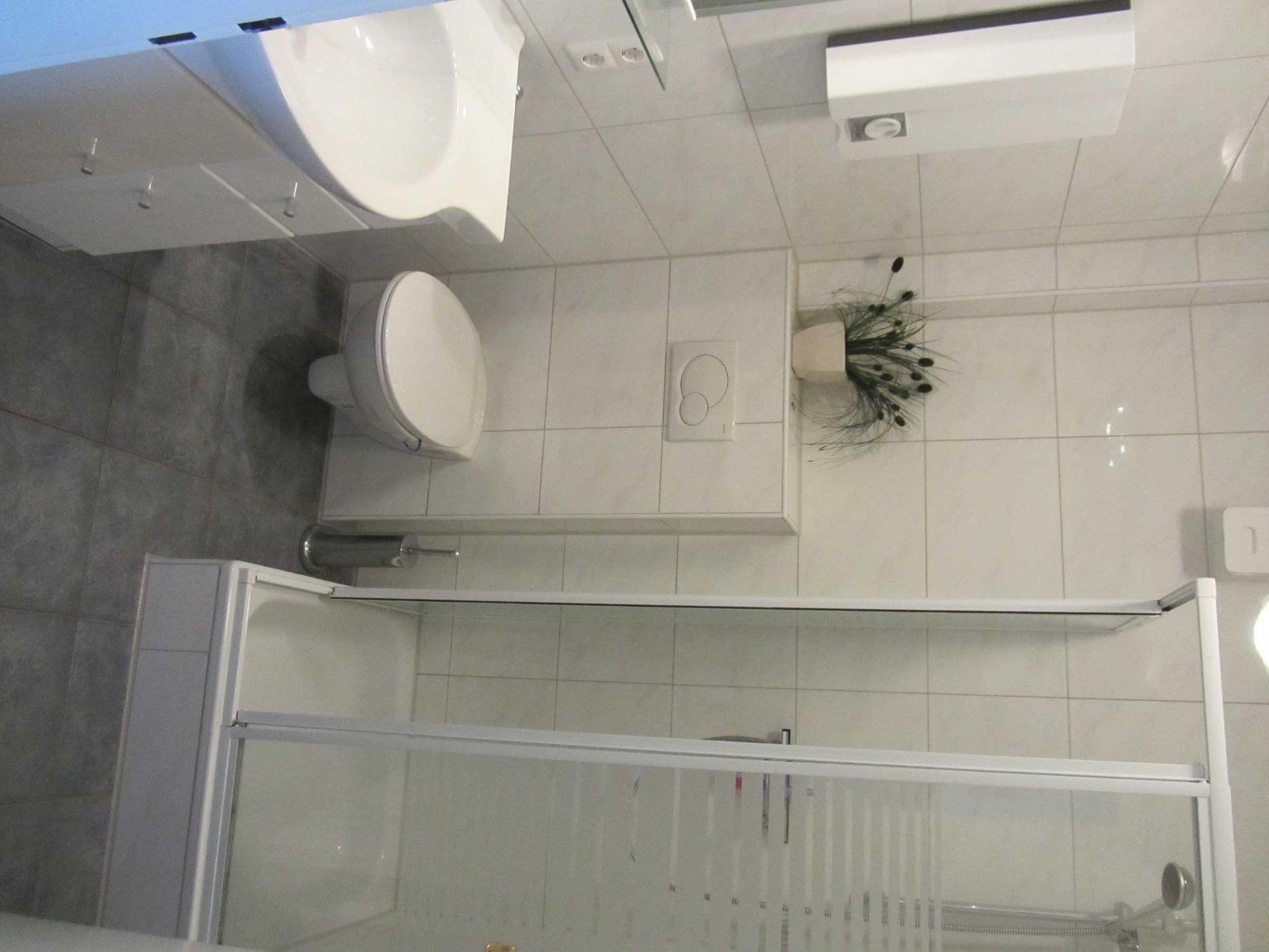 Ein Badezimmer mit Dusche und WC; ein Badezimmer mit Badewanne und WC.