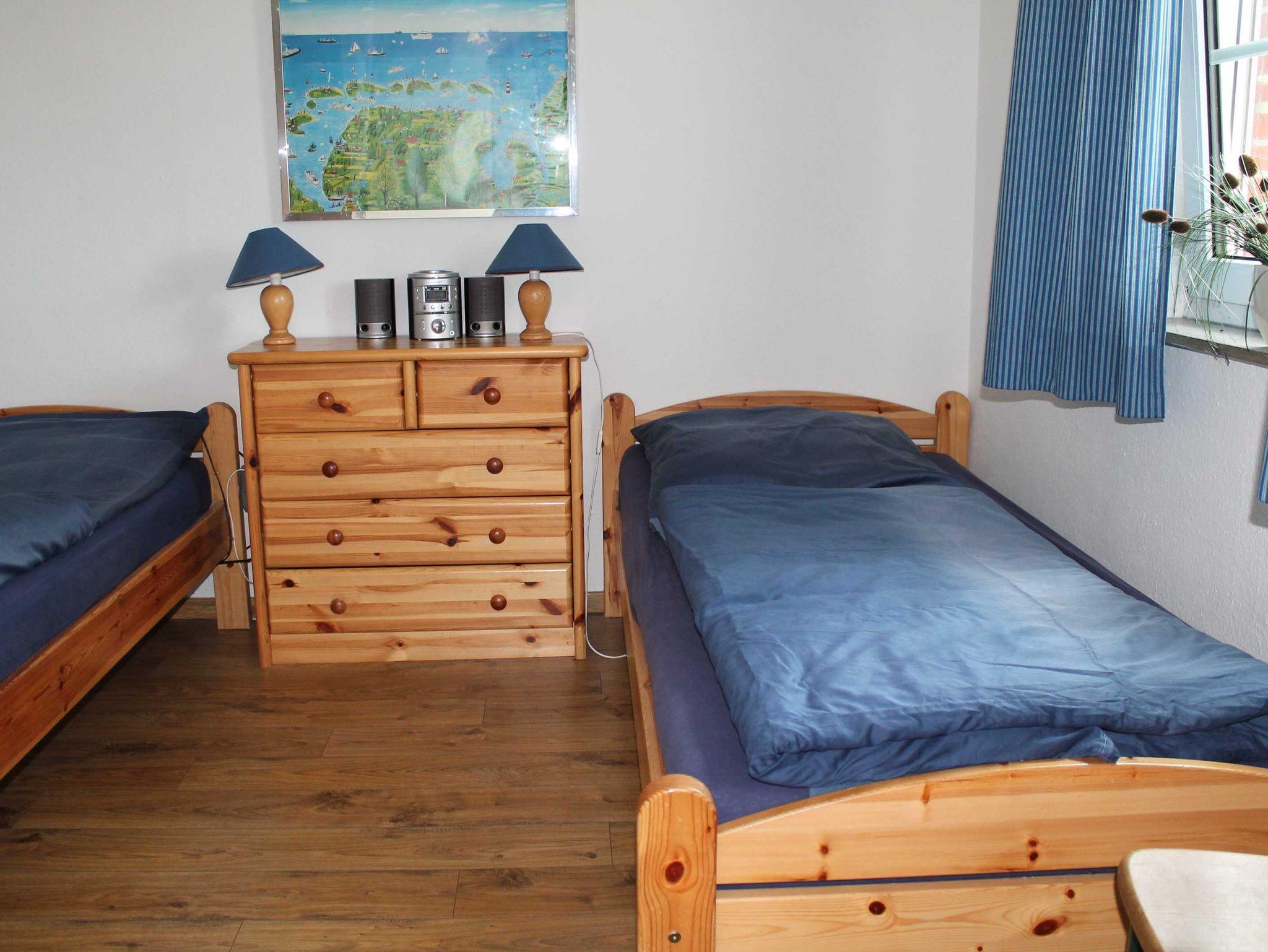 Ein Schlafzimmer mit zwei Einzelbetten, Fenster mit Rollladen.