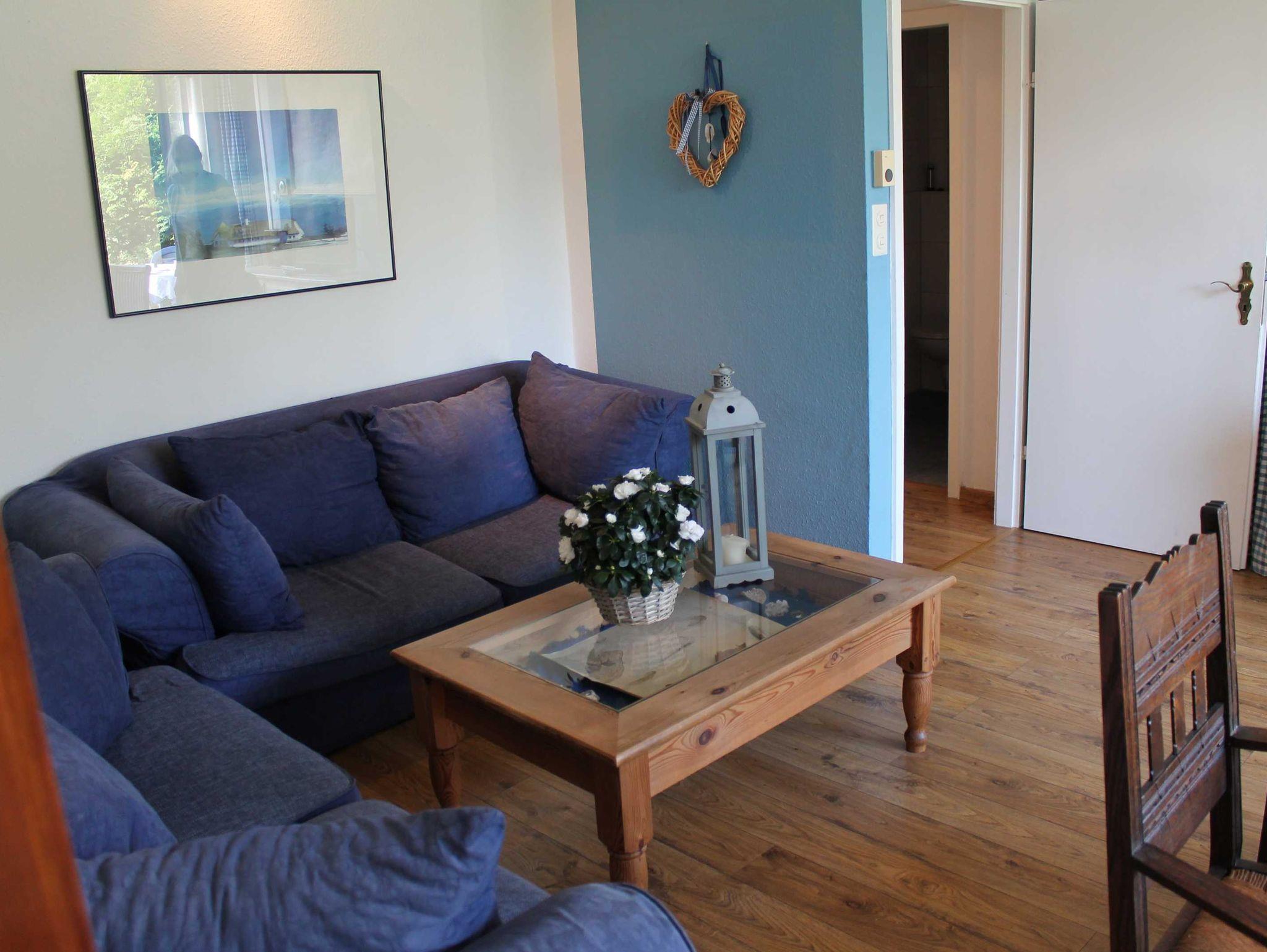 Offenes Wohn- und Esszimmer mit moderner Couchgarnitur und Flachbild-TV, grosser Esstisch mit Bestuhlung. Von hier hat man einen direkten Zugang zur Terrasse und zum eingezäunten Garten mit Gartenbestuhlung.
