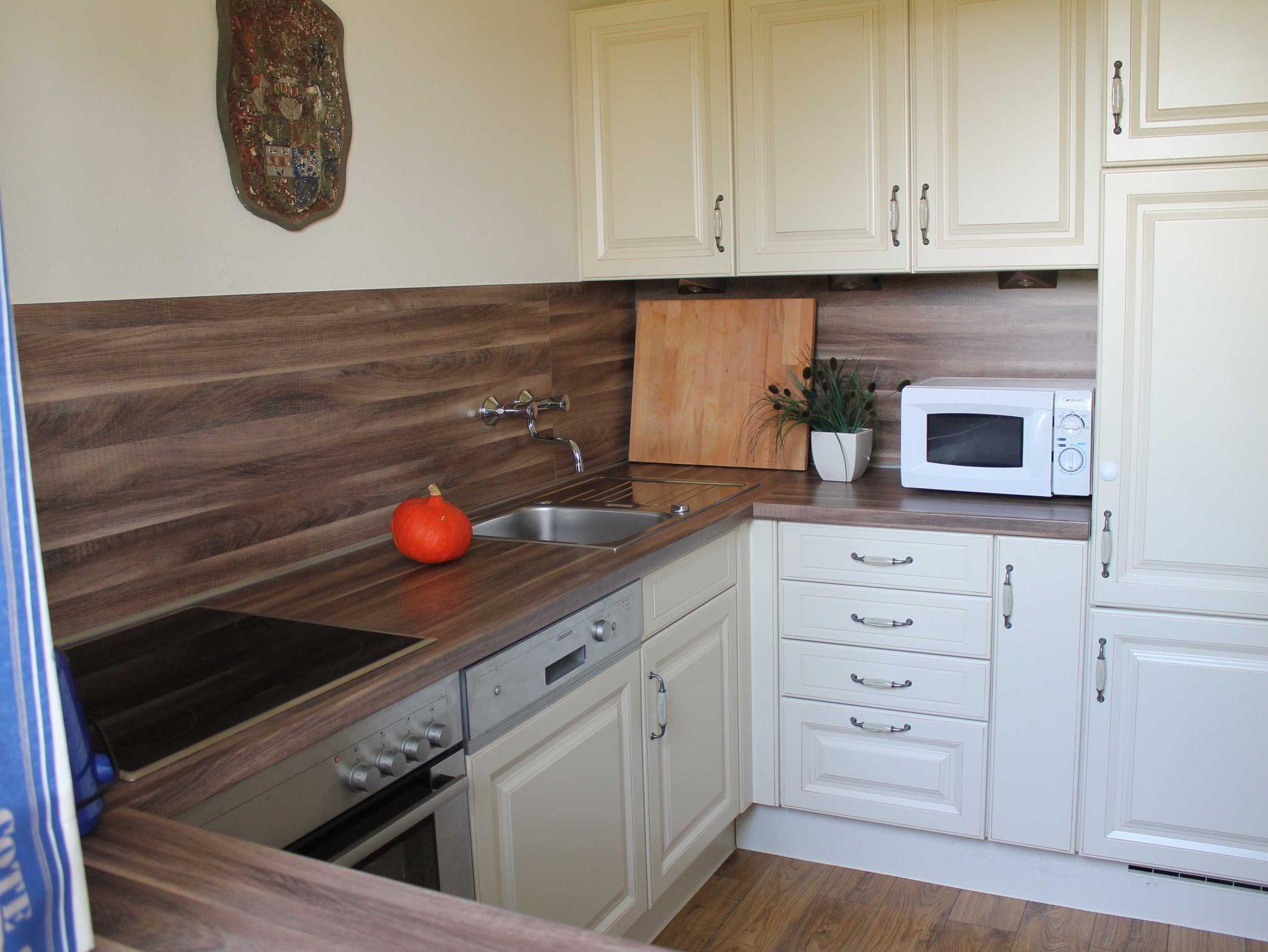 Separate Küche mit EBK mit Spülmaschine, E-Herd mit Ceranfeld und Backofen, Kühlschrank, kleinem Gefrierschrank, sowie allen erforderlichen Elektrogeräten; ausreichend Geschirr, Besteck und Kochutensilien.