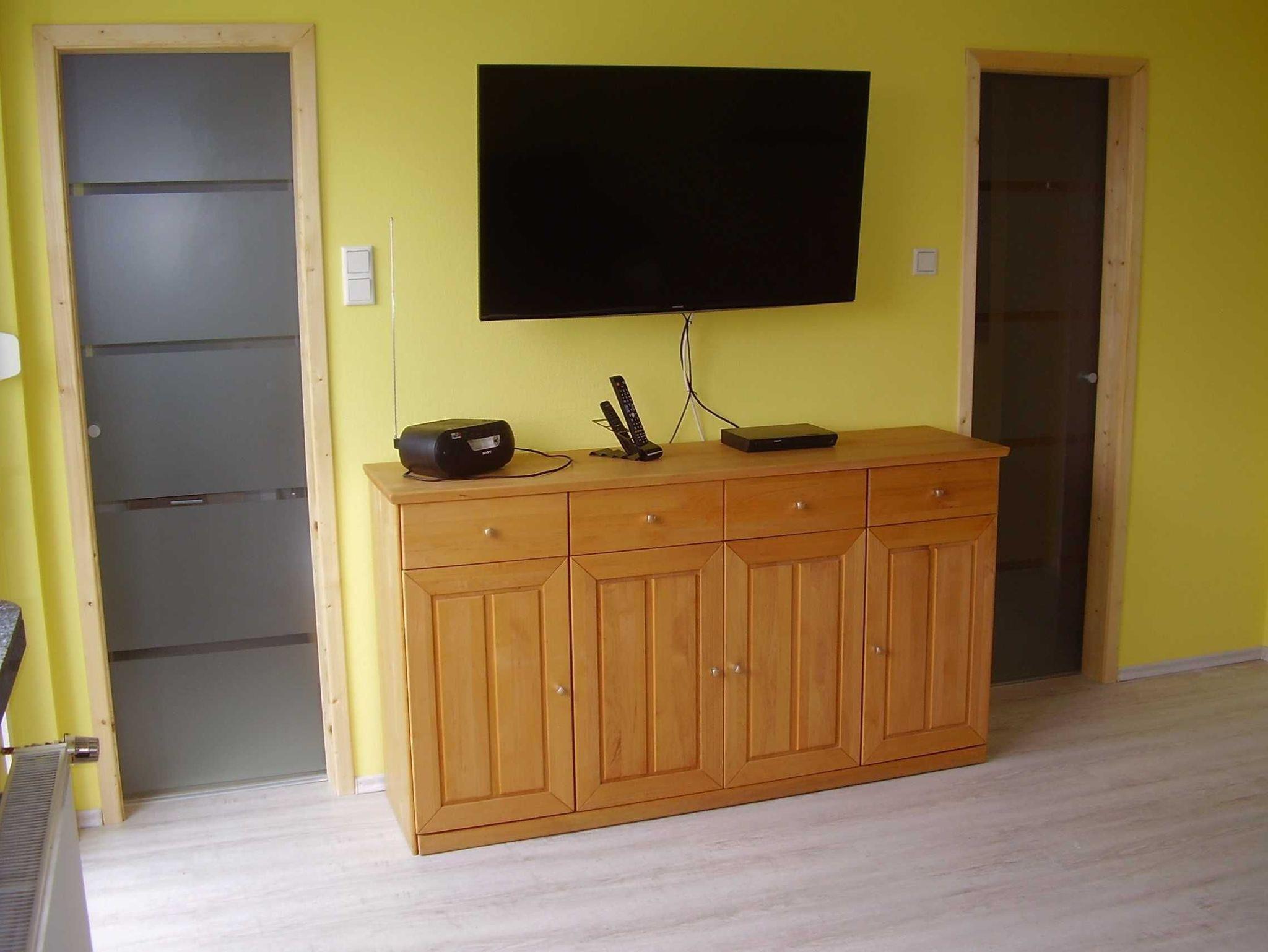 Großzügiger offener Wohn-/Essbereich mit moderner, hochwertiger Kunstledersitzecke, grossem Flachbild-TV, Musikanlage mit CD-Player und DVD-Player. Grosser Esstisch mit Bestuhlung.