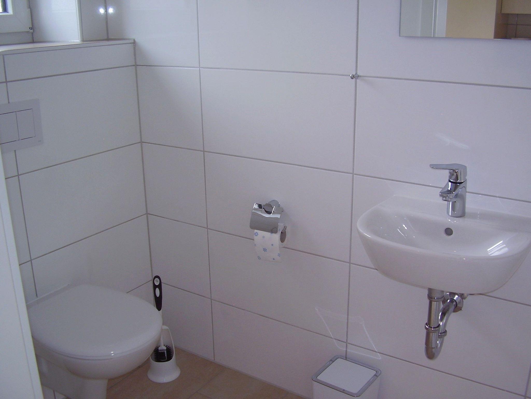 Tageslicht-Badezimmer mit grosser Dusche und Hänge-WC.